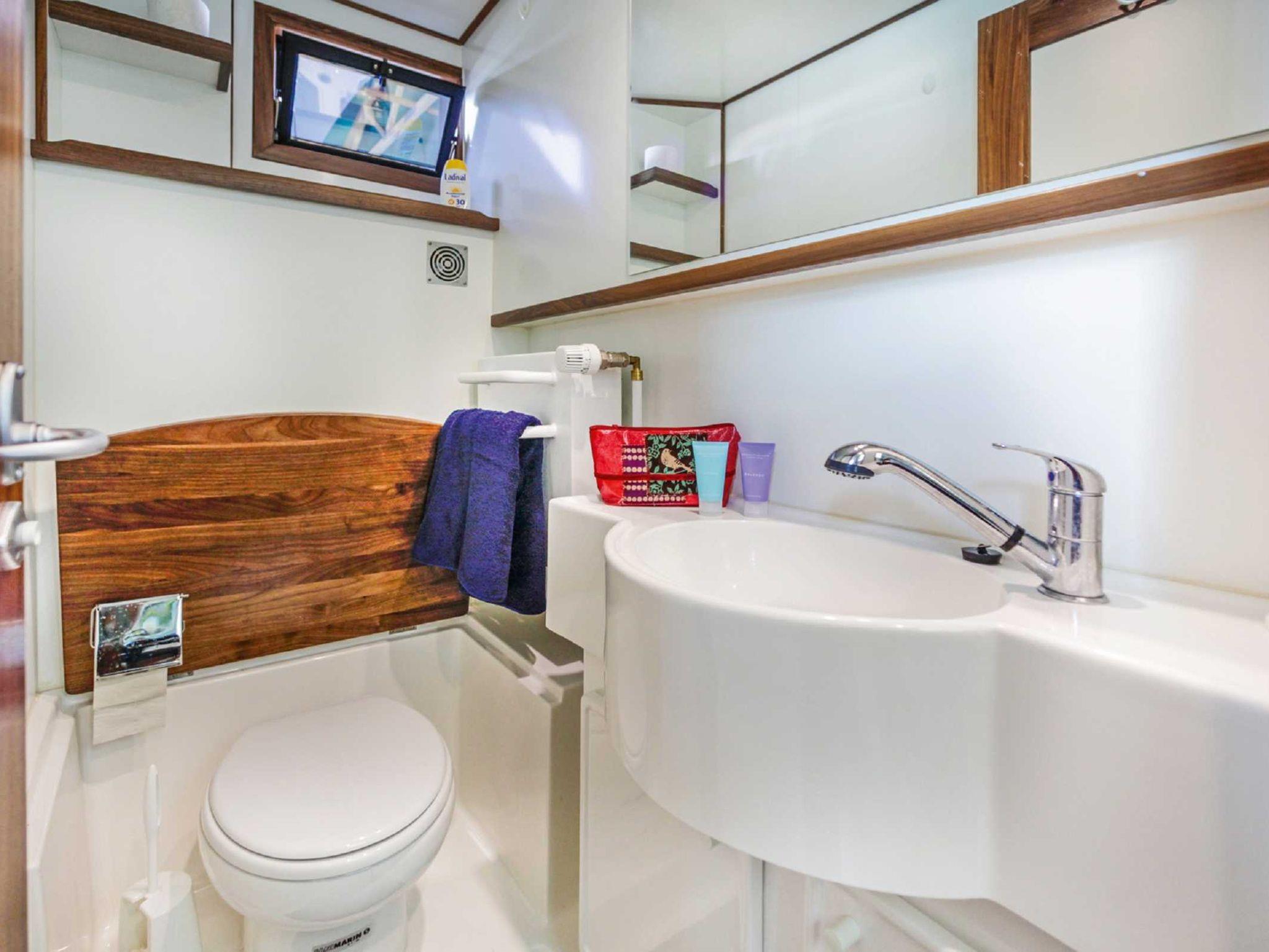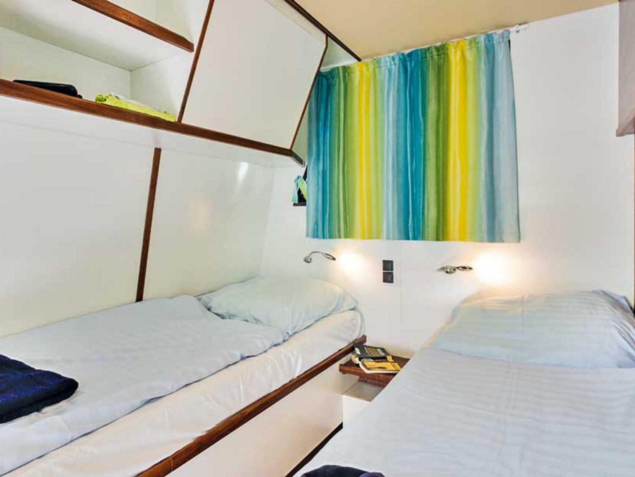 Das moderne Hausboot Aquino 1190 verfügt über zwei Kabinen mit 2 bzw. 3 Betten. Jede Kabine hat ein Bad. Pantry und Salon liegen zusammen im oberen Bereich, dort ist auch der Steuerstand. Im Außenbereich gibt es einen weiteren Steuerstand, sowie eine Liegefläche und eine Badeplattform. Auch Gartenmöbel sind vorhanden.
