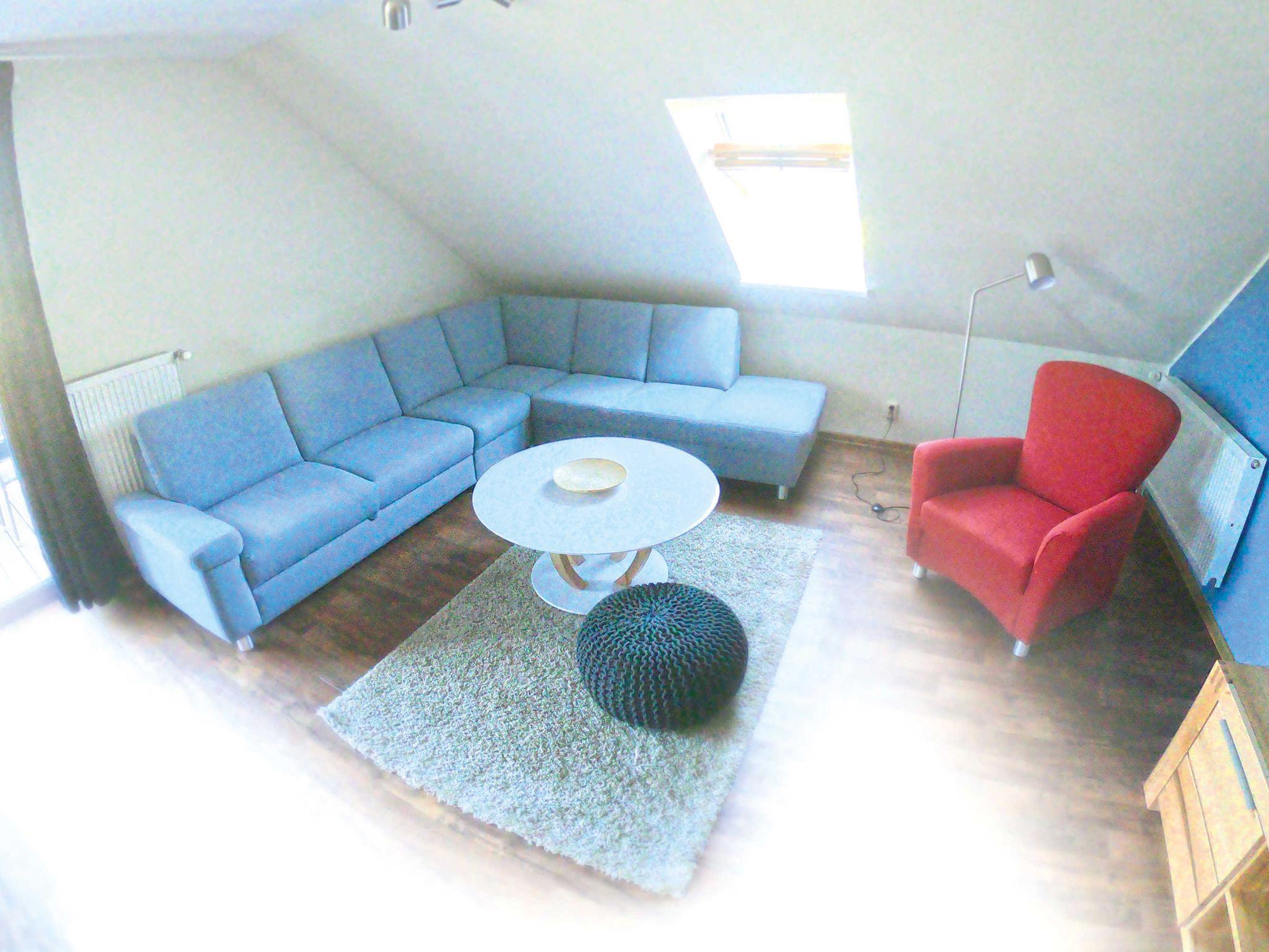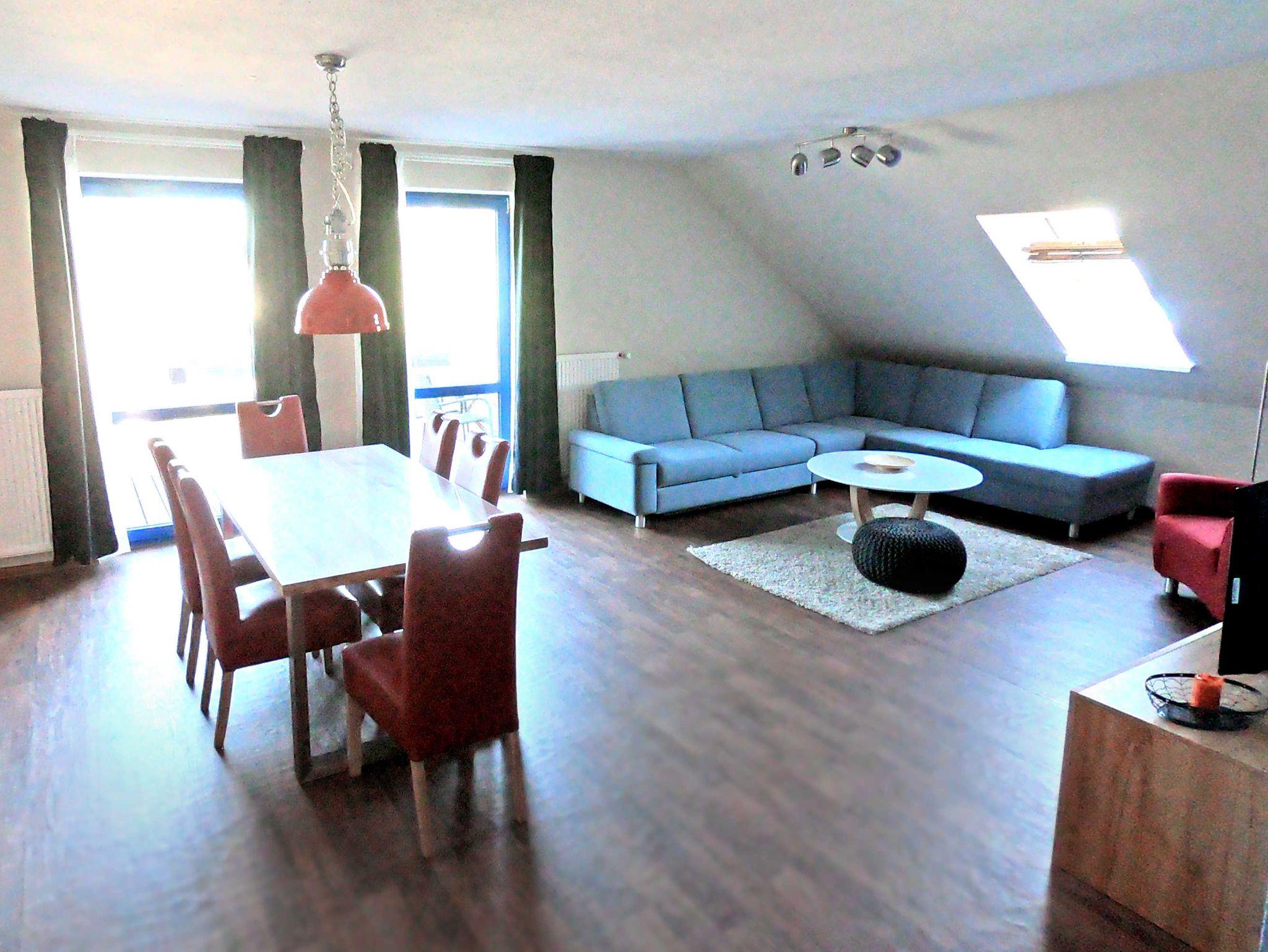 Große, offene Diele mit Küchenzeile (Spülmaschine), Wohnzimmer mit Schlafsofa und direktem Zugang zum Sonnenbalkon. Ein Schlaffzimmer mit Doppelbett, ein Schlafzimmer mit Twinbetten und ein Bad mit Badewanne, Dusche und 2 Waschbecken. Vom Wohnzimmer schaut man auf die Marina Müritz.