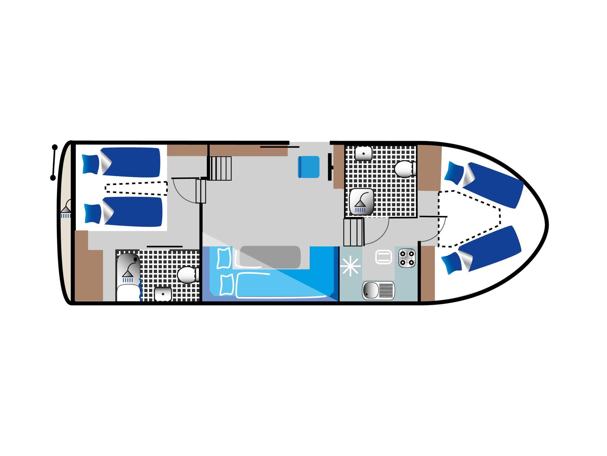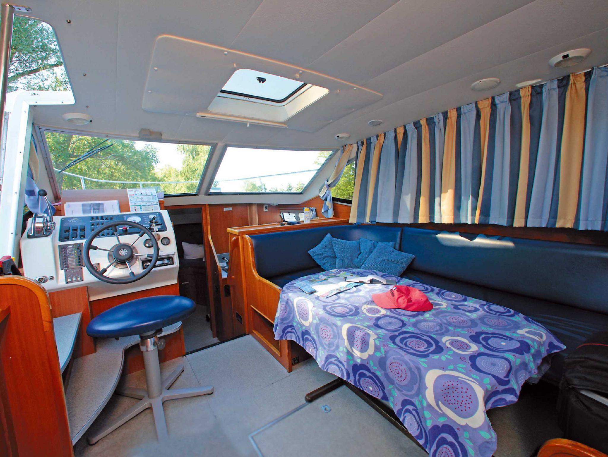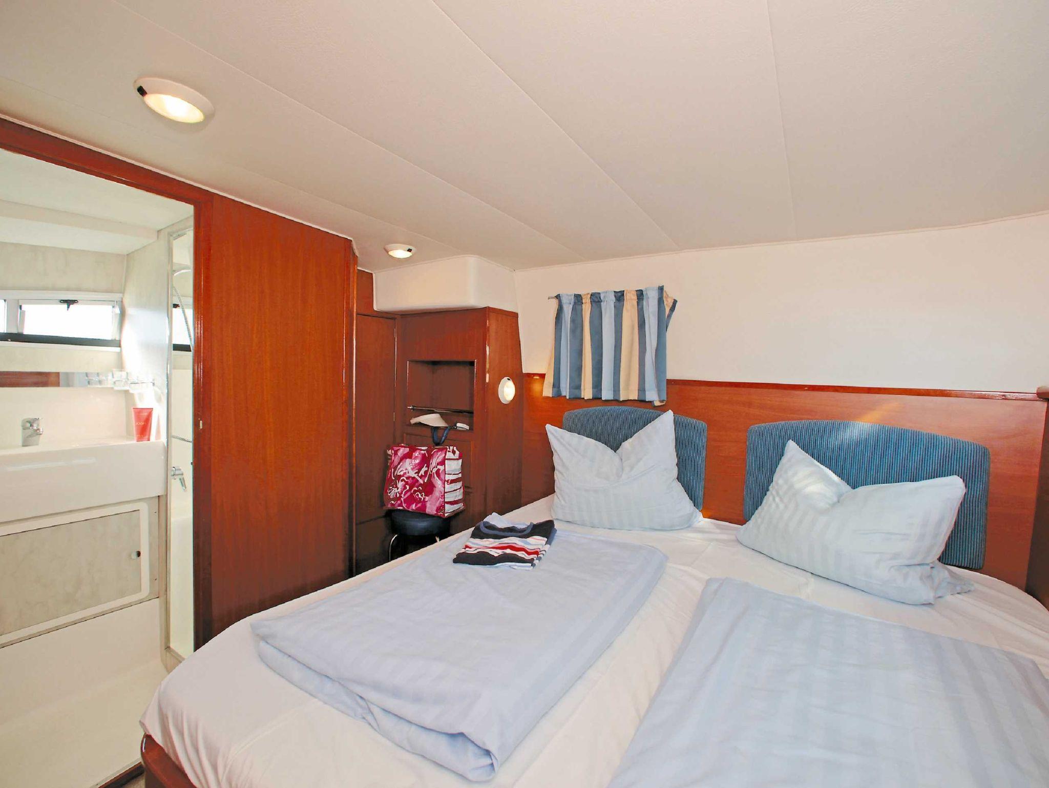 Modernes Hausboot aus Kunststoff (GFK). Ideal für zwei Paare oder Familien. Im Heck Kabine mit Doppelbett oder zwei Einzelbetten, Nasszelle en-suite mit Dusche, WC und Waschbecken, im Bug Kabine mit Doppelbett oder zwei Einzelbetten, Nasszelle mit Dusche, WC und Waschbecken, Mückenschutzgitter an den Fenstern der Schlafkabinen, Salon und Steuerstand mittschiffs erhöht bilden einen großen Raum, bequeme Polsterbänke (ausziehbare Schlafcouch für zwei Personen), 12-Volt-KFZ-Steckdose am Innenfahrstand, Echolot am Außenfahrstand*, voll ausgestattete Pantry, Warmluftheizung in jeder Kabine, zweiter Steuerstand auf dem Sonnendeck mit eingelassener Sitzecke, Bimini, Bugstrahlruder, Treppenzugang zum Heck und zur Badeleiter, Außendusche mit Kalt- und Warmwasser, 230-Volt-Landanschluss und 230-Volt-Inverter (2000 Watt), Steckdosen in allen Kabinen und am Außenfahrstand.