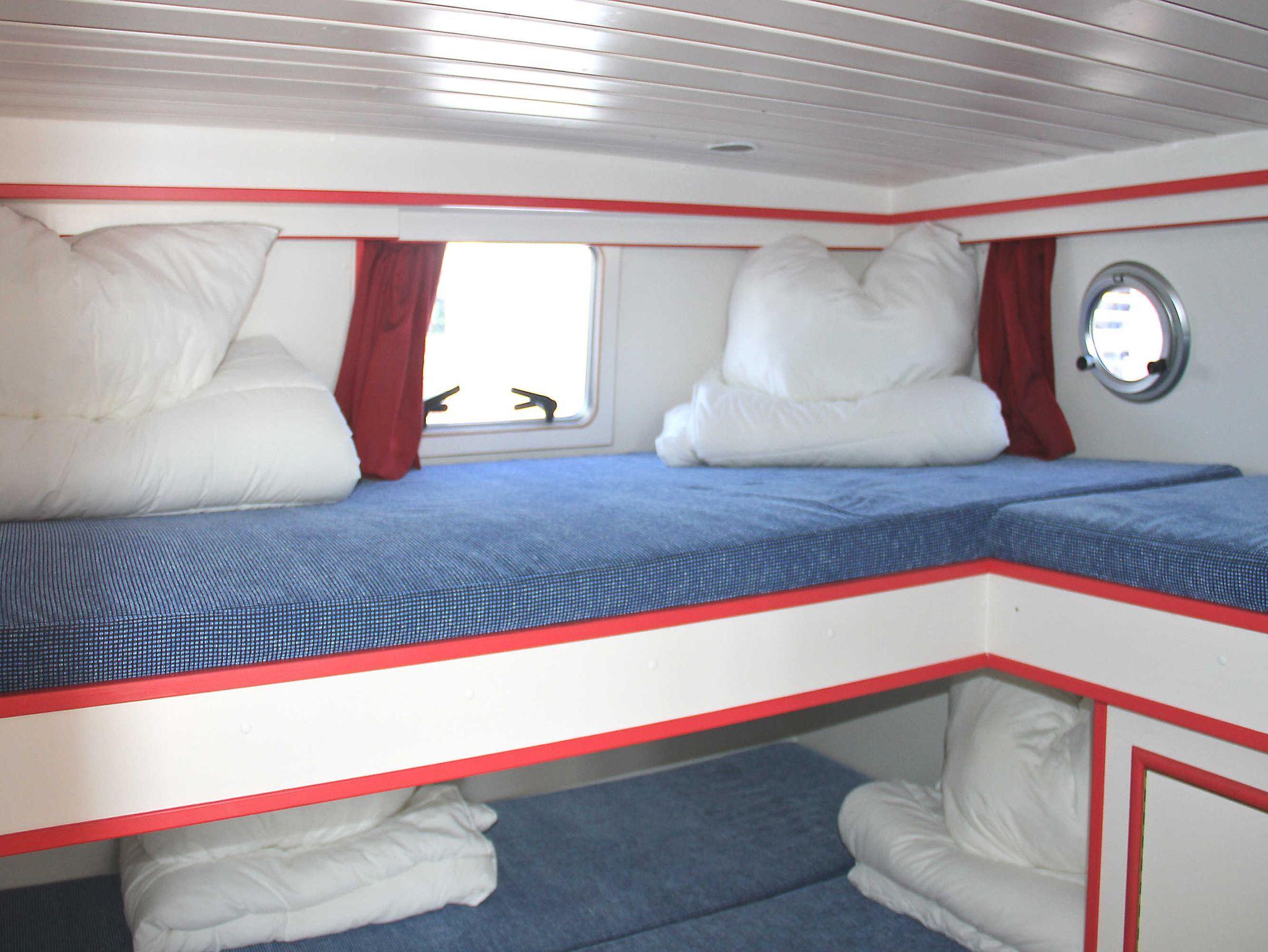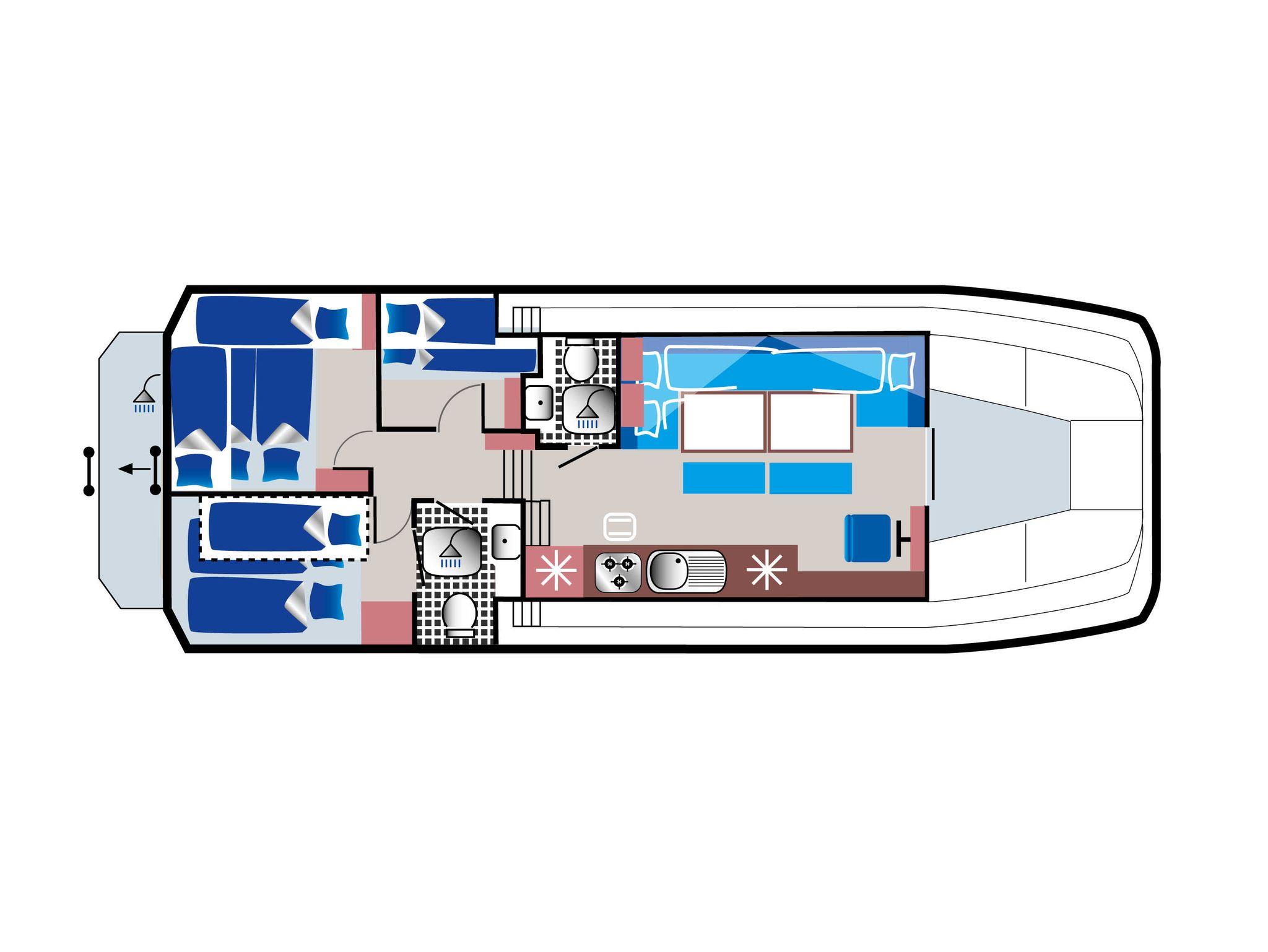 Modernes Hausboot im Yachtstil, Salon und Steuerstand bilden einen großen Raum, zweiter Steuerstand auf dem Sonnendeck, Heckplattform mit Badeleiter, Warmluftheizung, Pantry, zweite Außentür, Bugstrahlruder, Anschluss für Landstrom und iPod, MP3-Player oder Laptop. Ideal für größere Gruppen.
