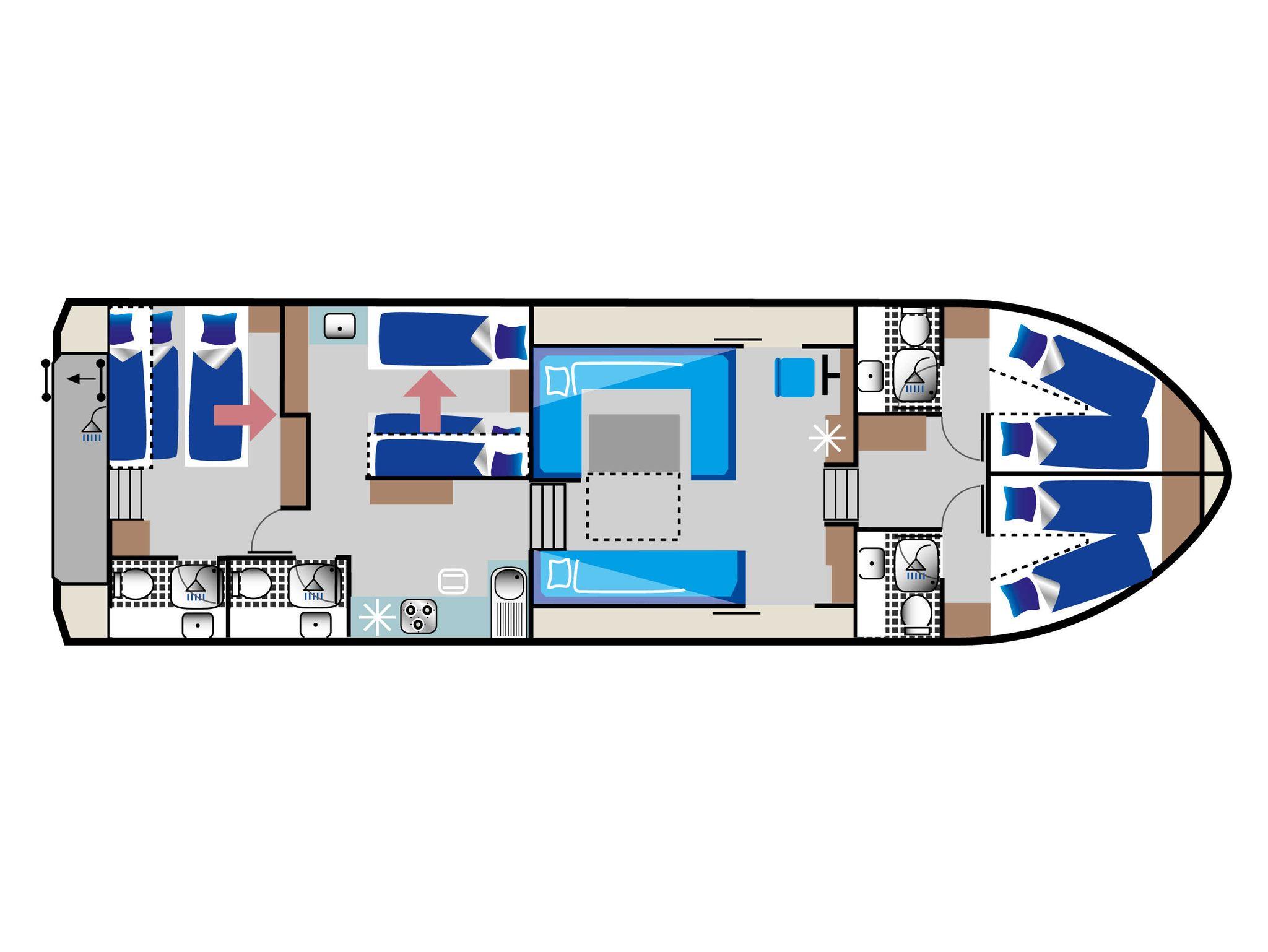 Die größte Version der Kormoran-Reihe ist das das richtige Boot für Ihre Gruppenreise. Mit bis zu 12 Schlafplätzen verteilt auf 4 Kabinen bietet es genügend Platz und Komfort. Jede Kabine hat ein eigenes Bad.