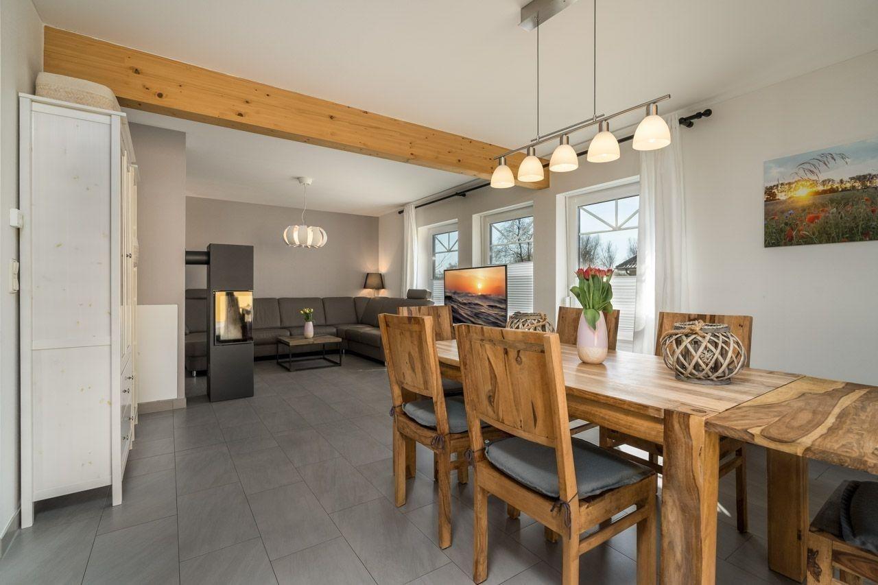 Diese komfortable Ferienwohnung bietet eine ideale Unterkunft für Familien und Allergiker. Mit drei geräumigen Schlafzimmern, ausgestattet mit drei Doppelbetten, ermöglicht sie erholsamen Schlaf für bis zu sechs Personen. Die offene Küche ist mit modernen Geräten wie einem Geschirrspüler, Elektro-/Gasherd, Backofen, Mikrowelle und Kühlschrank versehen, ergänzt durch einen Essbereich mit großem Esstisch. Zwei Badezimmer, jeweils mit bodengleicher Dusche und Fenster, bieten zusätzlichen Komfort. Der Wohnbereich mit Sofa, Kamin und HiFi-Anlage lädt zum Entspannen ein. Praktische Annehmlichkeiten wie WLAN, Waschmaschine, Wäschetrockner und Kinderspielzeug machen den Aufenthalt angenehm. Ein Parkplatz steht zur Verfügung. Für Familien sind Kindersicherungen, ein Hochstuhl und ein Kindertoilettensitz vorhanden. Die Wohnung ist mit einem Starterset an Reinigungsmitteln und Gewürzen ausgestattet und bietet eine Vielzahl von Brettspielen für unterhaltsame Abende.