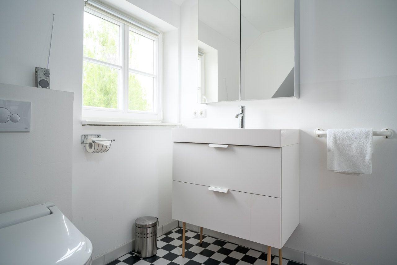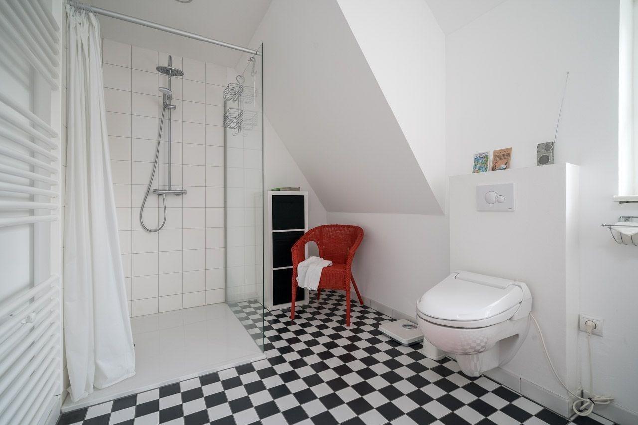 Zwei Schlafzimmer, eines mit einem Doppelbett und das andere mit einer Schlafcouch, bieten großzügige Schlafmöglichkeiten. Das Badezimmer verfügt über eine bodengleiche Dusche und ein Fenster für frische Luft; ein Gäste-WC sorgt für zusätzlichen Komfort.