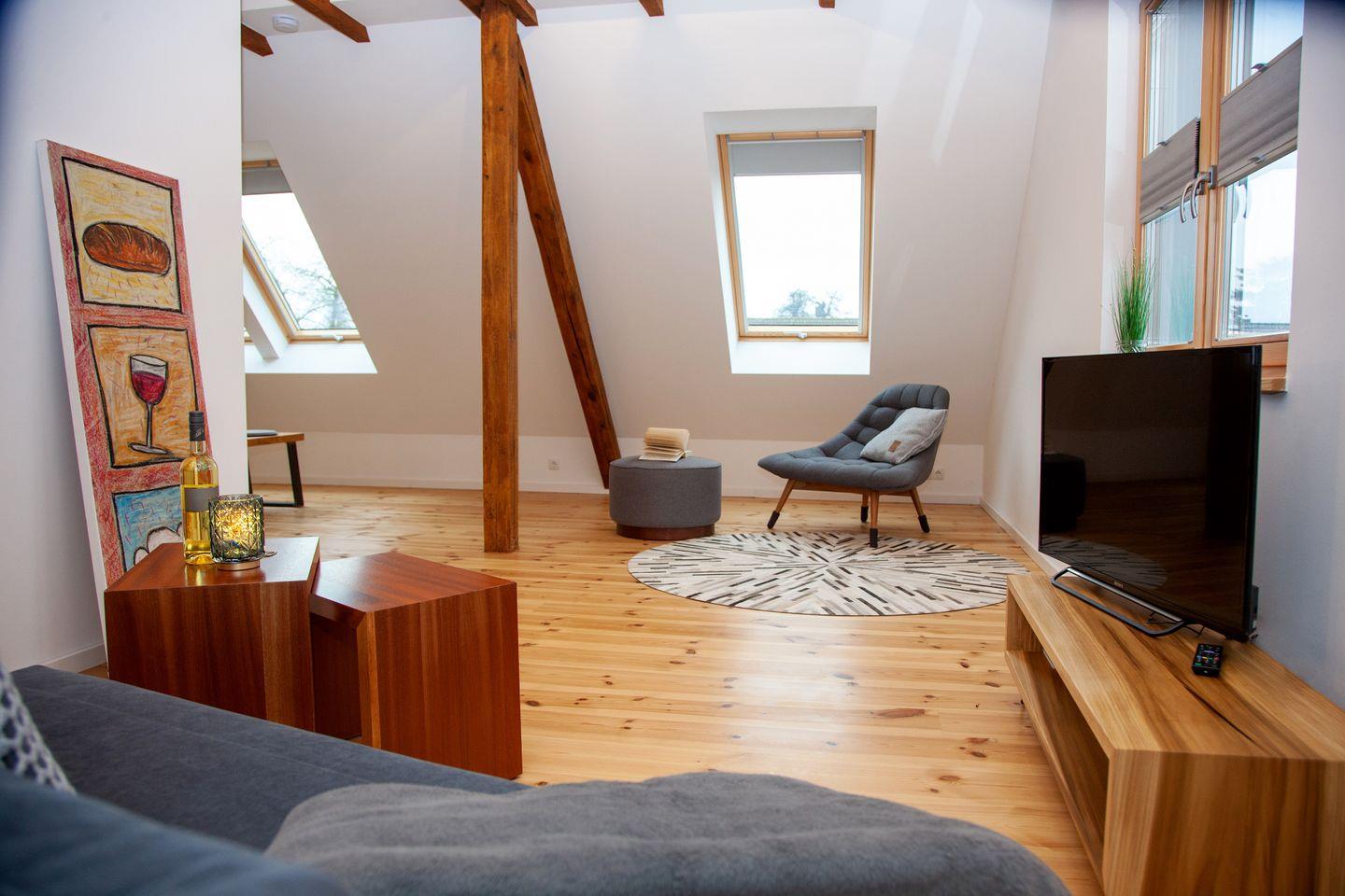 Die Ferienwohnung umfasst das komplette Obergeschoss eines Hauses mit zwei Ferienwohnungen. Das Haus wurde liebevoll saniert – dabei wurde Altes erhalten und mit Neuem architektonisch verbunden. Die Wohnung hat durch die bis in die Dachspitze geöffneten Räume eine ganz besondere Ausstrahlung und großzügige Atmosphäre. Sie bietet Ihnen einen kombinierten, lichtdurchfluteten Wohn- und Essbereich mit offener Küche, ein Schlafzimmer und ein modernes Duschbad. Die Küche ist mit Induktionskochfeld, Mikrowelle, Geschirrspüler, Kühlschrank, Kaffeemaschine und Toaster ausgestattet. Das Schlafzimmer verfügt über Insektenschutzgitter. Neben ihrem eigenen Parkplatz direkt am Haus, gibt es eine Möglichkeit zum sicheren Abstellen und Anschließen von Fahrrädern. Auch im Garten steht ein ruhiges Plätzchen mit Gartenmöbeln zur Verfügung.