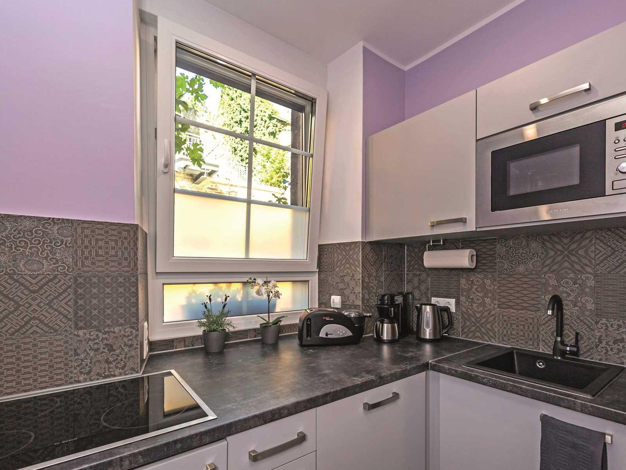 Helle Wohneinheit (20 - 30 m²) mit Sofa und 55 Smart-TV im Wohnbereich, Schlafzimmer mit Einzelbett 100 x 220 cm sowie 43 Smart-TV, W-LAN, vollausgestattete Küche und modernes Bad mit Regendusche/WC.