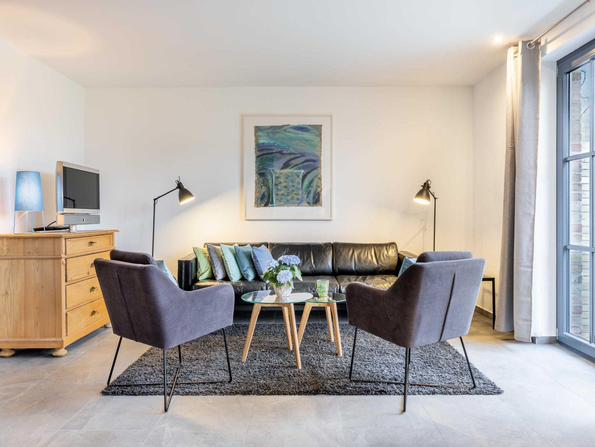 Der Wohnbereich ist ausgestattet mit Flach- Smart TV (Netflix und Magenta TV), Bluetooth Lautsprecher, Esstisch und gemütlicher Sitzecke mit Ledercouch und Sesseln. Für Kurzweile im Urlaub sorgen außerdem eine bunte Spielsammlung und eine feine Bücherauswahl.
