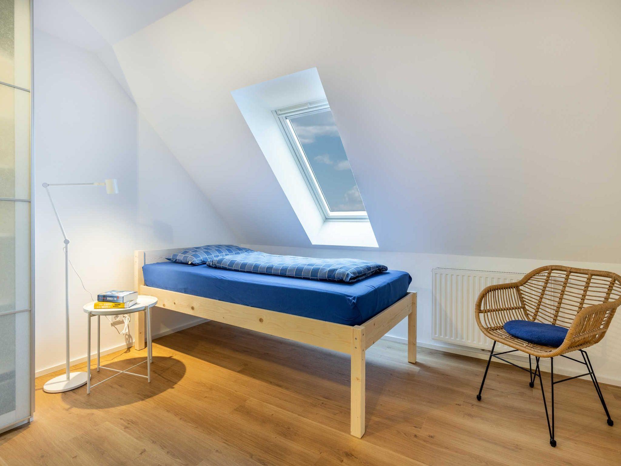 Im Obergeschoss: die obere Etage erreichen die Gäste über eine Treppe (0,75m breit). Hier befinden sich 2 Schlafzimmer. Schlafzimmer 1 mit Doppelbett (1,80 x 2m), Kleiderschrank und kleinem Arbeitsplatz mit Sessel, Schlafzimmer 2 mit 2 Einzelbetten (1m x 2m) und Kleiderschrank. Alle Betten sind mit hochwertigen Lattenrosten und Matratzen ausgestattet.