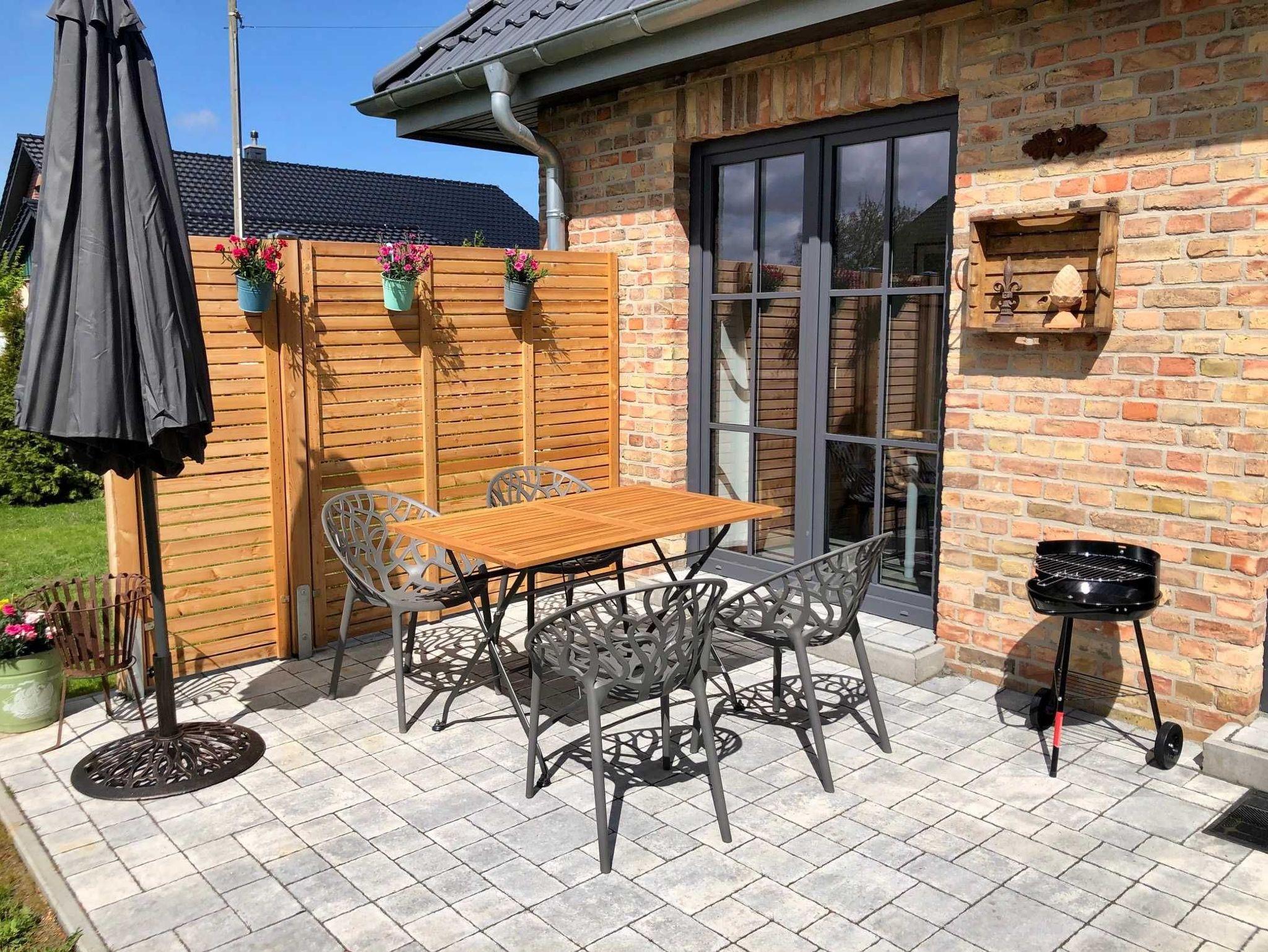 Der gemütliche Wohnbereich eröffnet einen herrlichen und freien Blick in die Natur und in den Garten. Von hier aus gelangen die Gäste direkt auf die ruhige Terrasse und ins Grüne. Hier stehen ein Esstisch, Grill und Liegestühle für die Gäste bereit. Der Gartenbereich ist mit einem 1m hohen Staketenholzzaun eingezäunt.