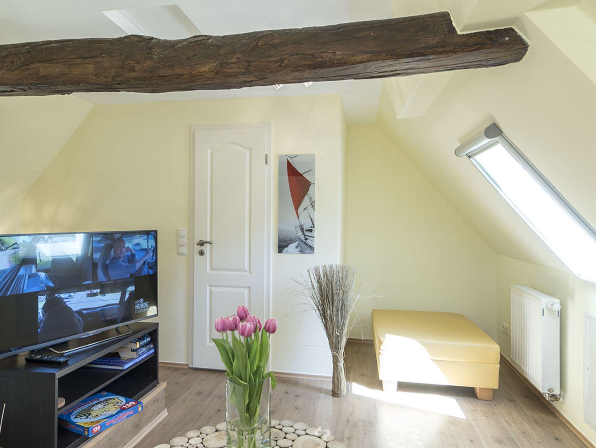 - Über eine Treppe gelangen sie in das Dachgeschoss. Dort kann man wunderbar auf der großzügigen Couch und Flachbild-TV entspannen. Im Schlafzimmer befinden sich ein Boxspringbett mit einer hochwertigen Matratze (180x200) und diverse Kommoden. Ein kleines Bad mit WC und Dusche runden das Ganze ab.