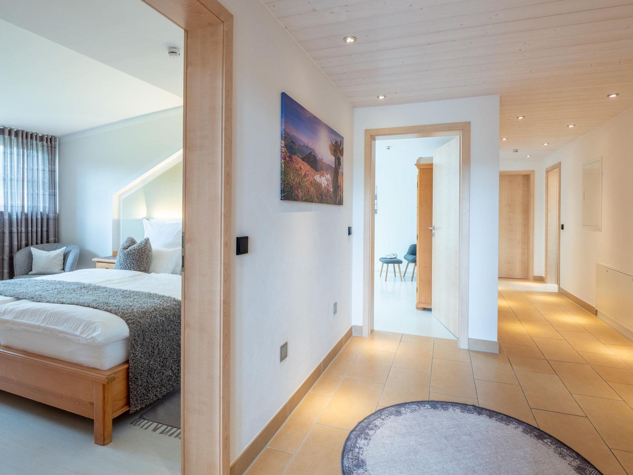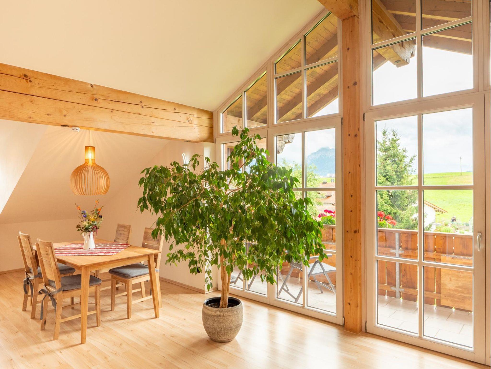 Die neu ausgebaute Ferienatelierwohnung im Dachgeschoss überzeugt mit seinem freien Blick auf die Alpen.
