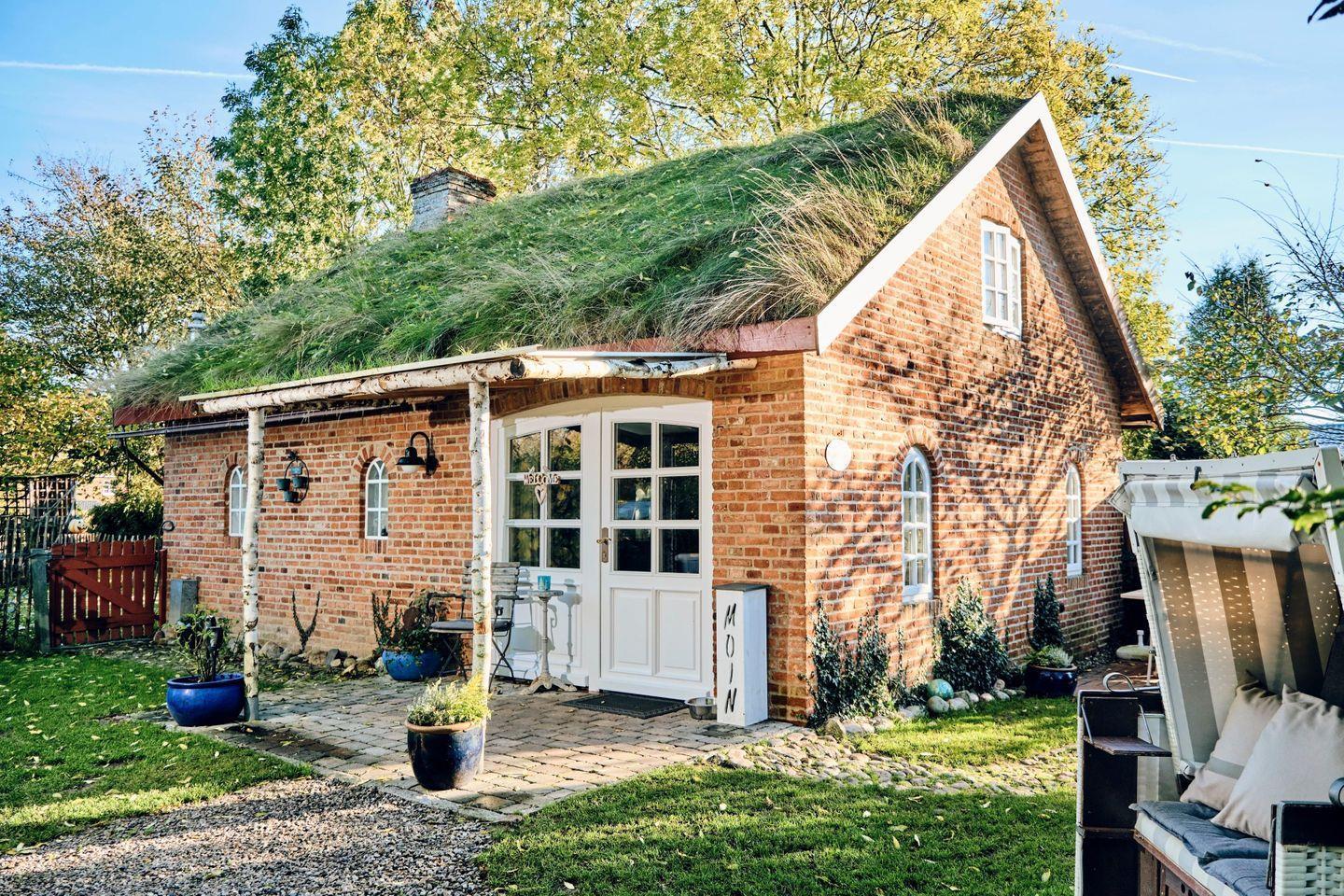Das Haupthaus des Anwesens, ein typisch nordfriesisches Reetdachhaus, steht ca. 25 m von dem grasgedeckten Ferienhaus entfernt.