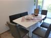 Das großzügige, offene Wohnzimmer verfügt über eine Sitzecke, einen Essbereich und ein bodentiefes Panoramafenster mit Ausgang zum Balkon.