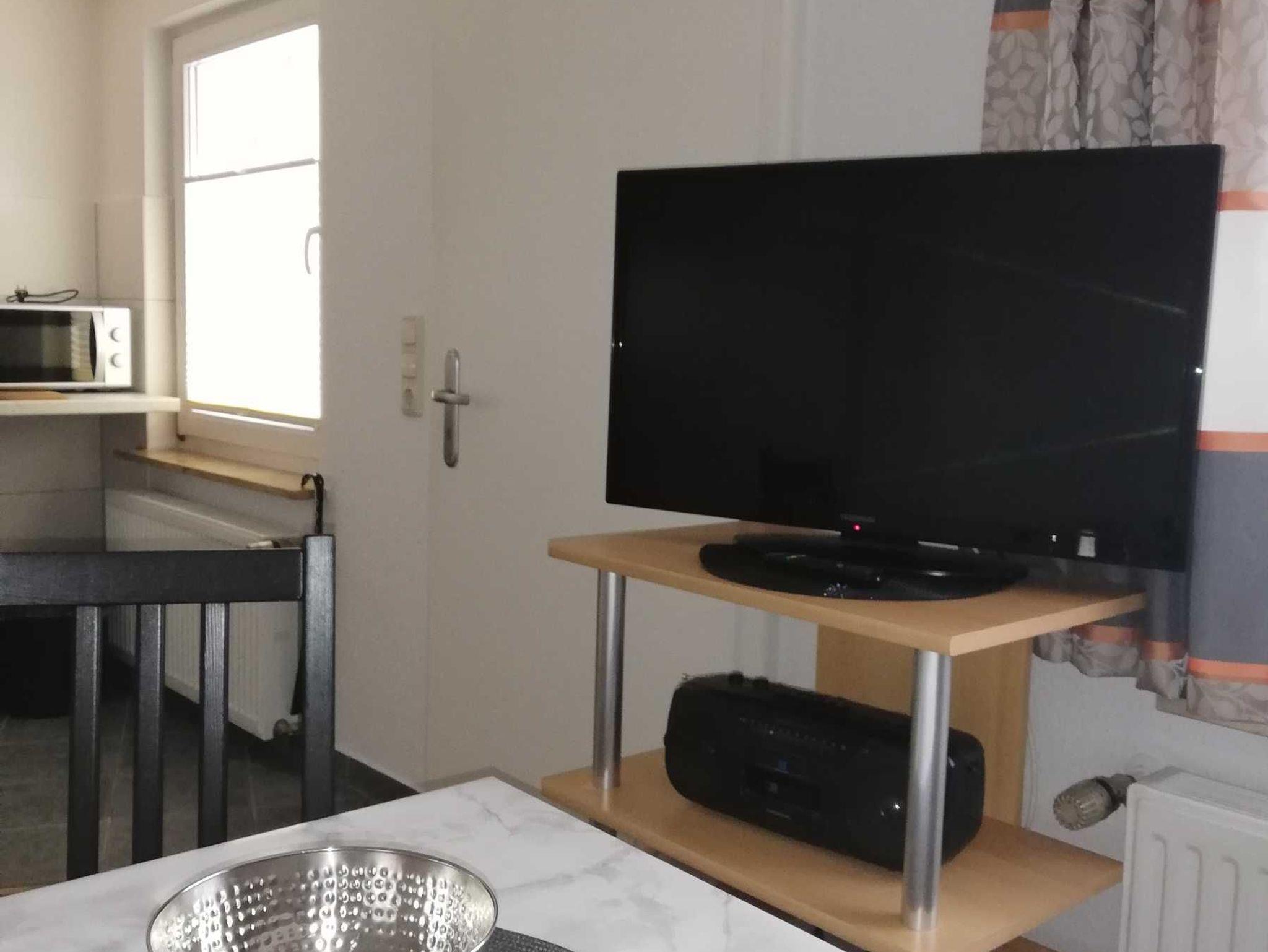 Kleine Ferienwohnung (25 m²) mit separatem Eingang und einer Wohn-/ Schlafraumkombination mit Doppelbett (160 x 200) und Couchliege (Aufbettungsmöglichkeit für 1 Kind bis max.5 Jahre (Klappcouch-Liegefläche 1,3m * 1m). Ebenerdig mit Terrasse im Grünen, TV, Pantryküche und Dusche/ WC.