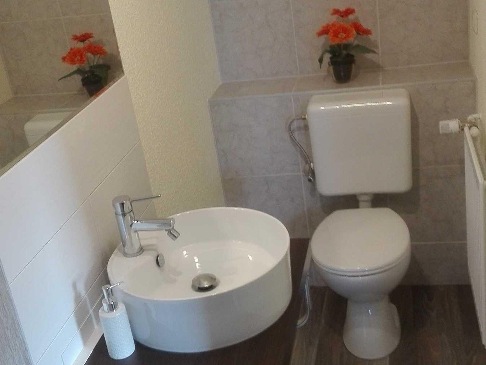 moderne Einbauküche, letzte Renovierung Februar 2022, Dusche und WC mit modernem Waschtisch