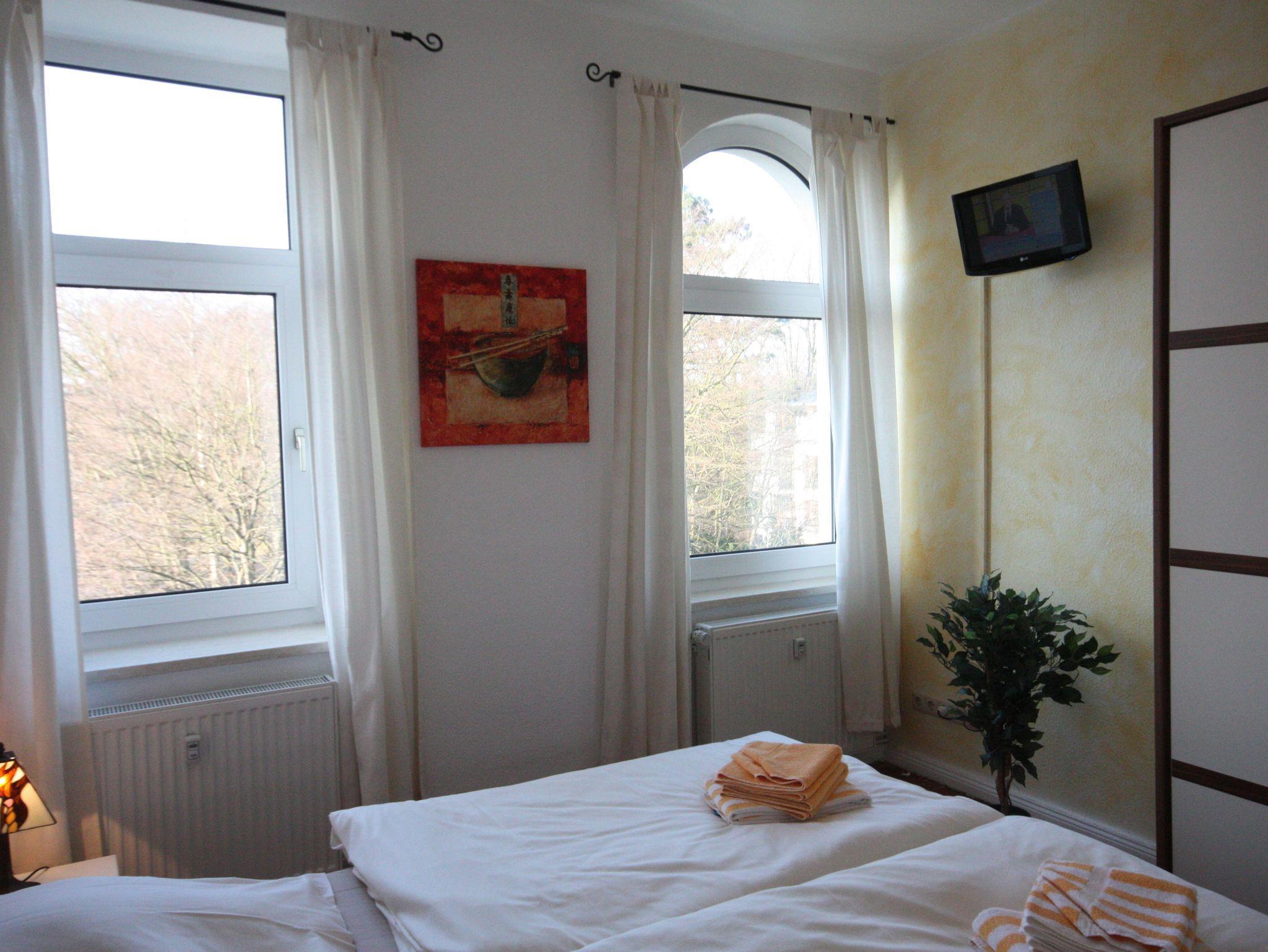 Modern eingerichtete 56 qm große Ferienwohnung in der dritten Etage ohne Fahrstuhl für 2 Personen. Im Wohnzimmer befinden sich ebenfalls eine gemütliche Sitzecke sowie ein Essbereich. Ihnen stehen ein 42 ? Flachbildfernseher im Wohnzimmer zur Verfügung und ein weiterer, etwas kleinerer Flatscreen im Schlafzimmer. Das Schlafzimmer ist zusätzlich mit Doppelbett und großem Schlafzimmerschrank ausgestattet.