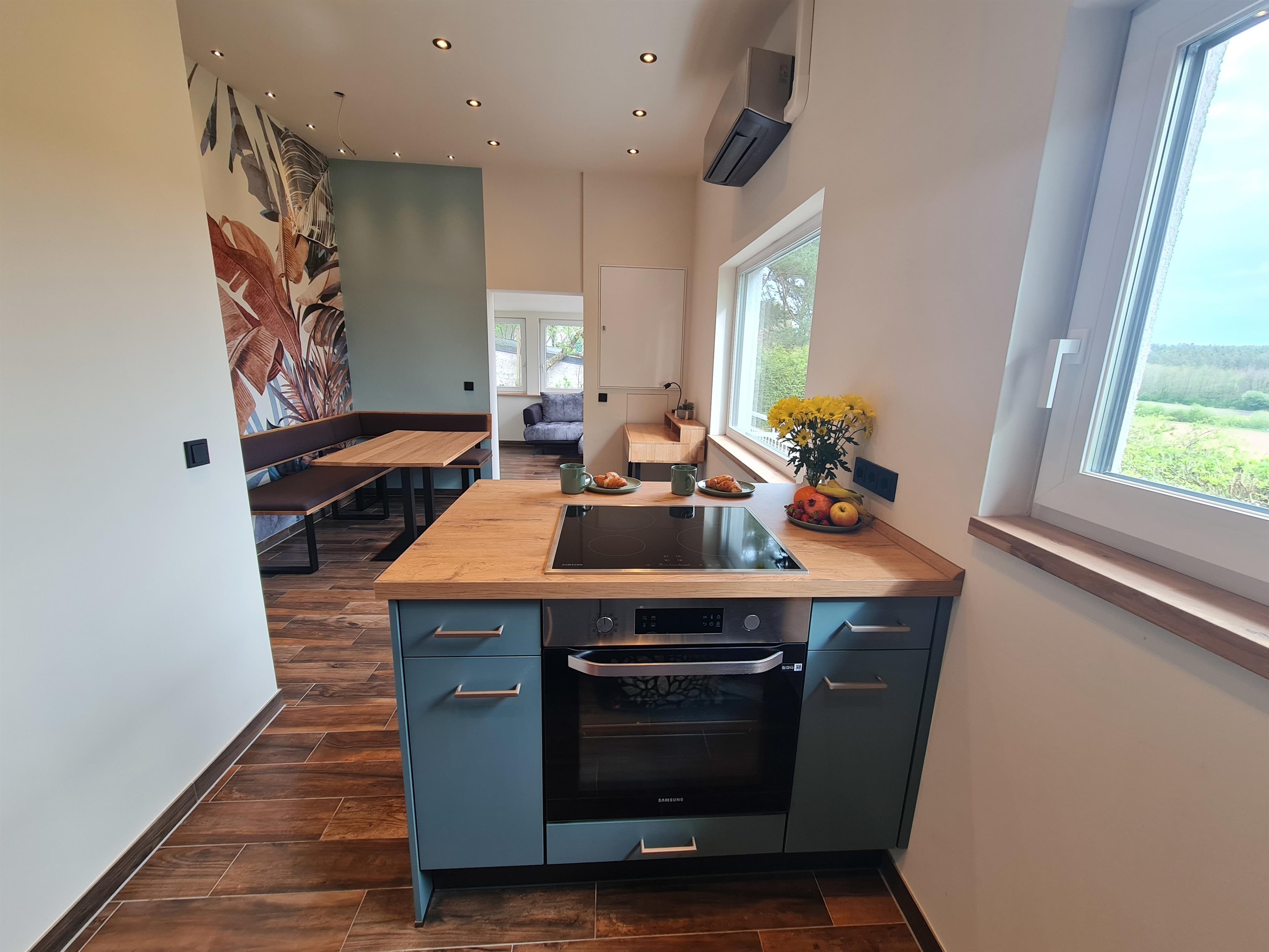Die Küche ist voll ausgestattet, hat einen Induktionsherd, einen Backofen, einen Geschirrspüler und Kühlschrank mit kleinem TK-Fach.