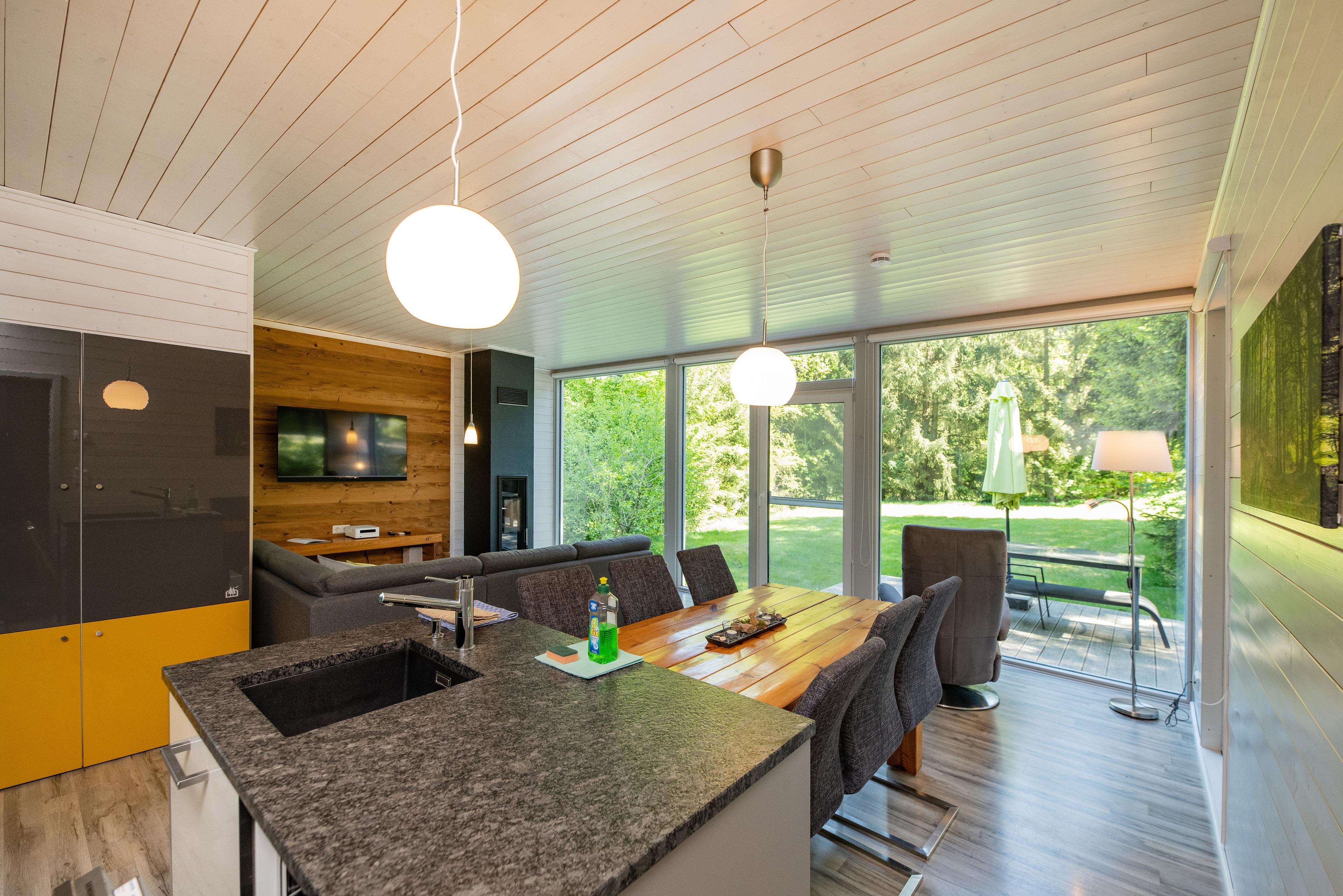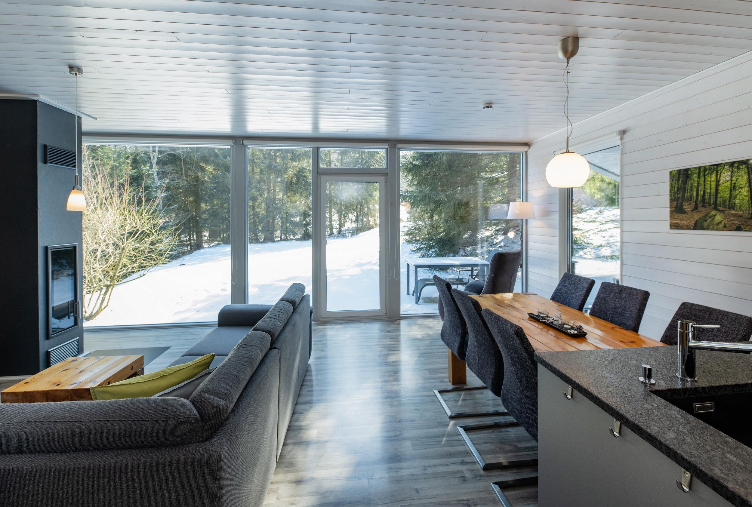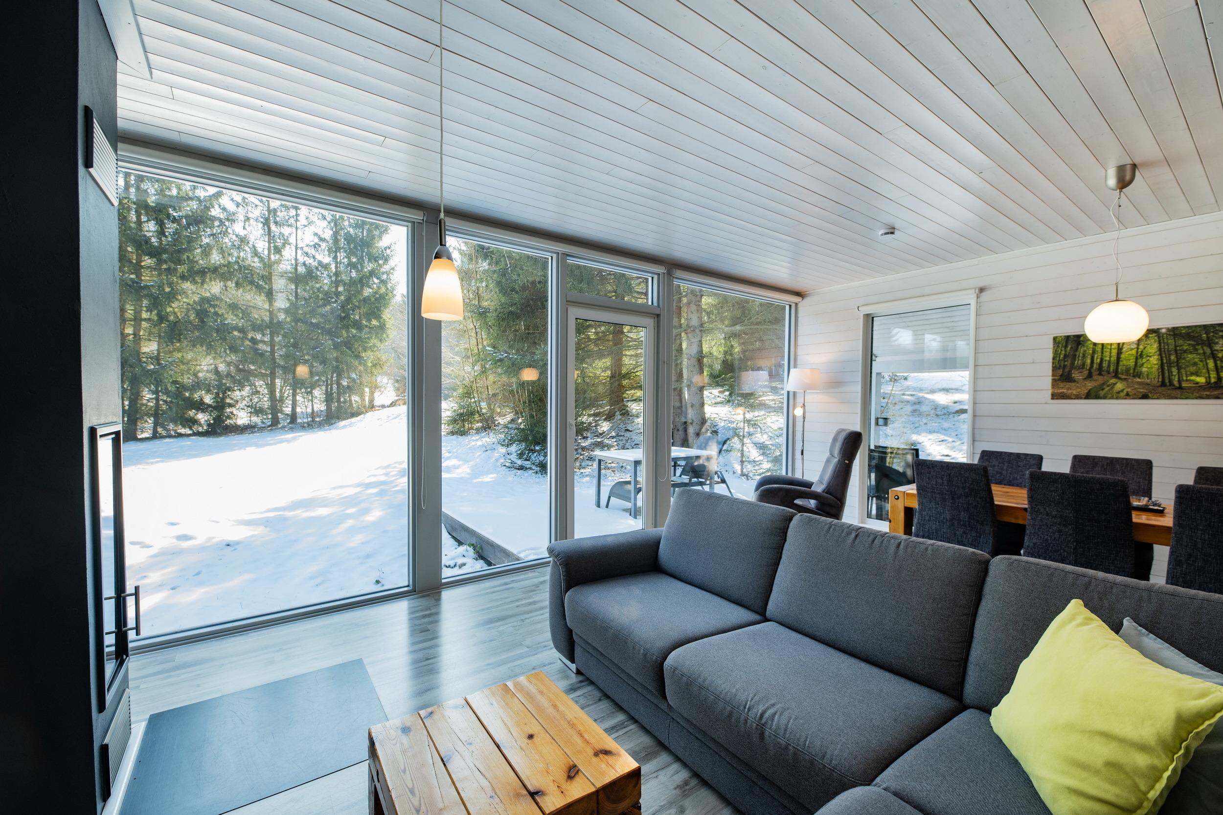 Das Ferienhaus mit einem lichtdurchluteten offenen Wohn- und Küchenbereich, zwei Schlafzimmern und einem Wellness-Bad mit Sauna bietet Ihnen auf 70 Quadratmetern ausreichend Platz für 4 Personen. Die 7 Meter breite Glasfront lässt die Natur beim Essen oder Relaxen teilhaben. In der kalten Jahreszeit vollendet das knisternde Kaminfeuer das Urlaubsfeeling.