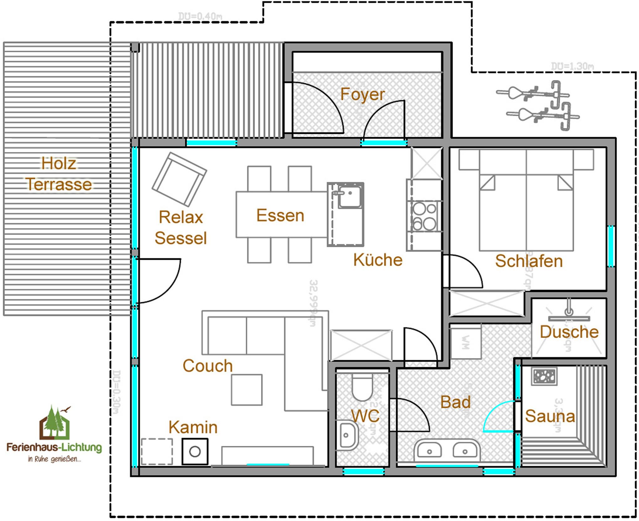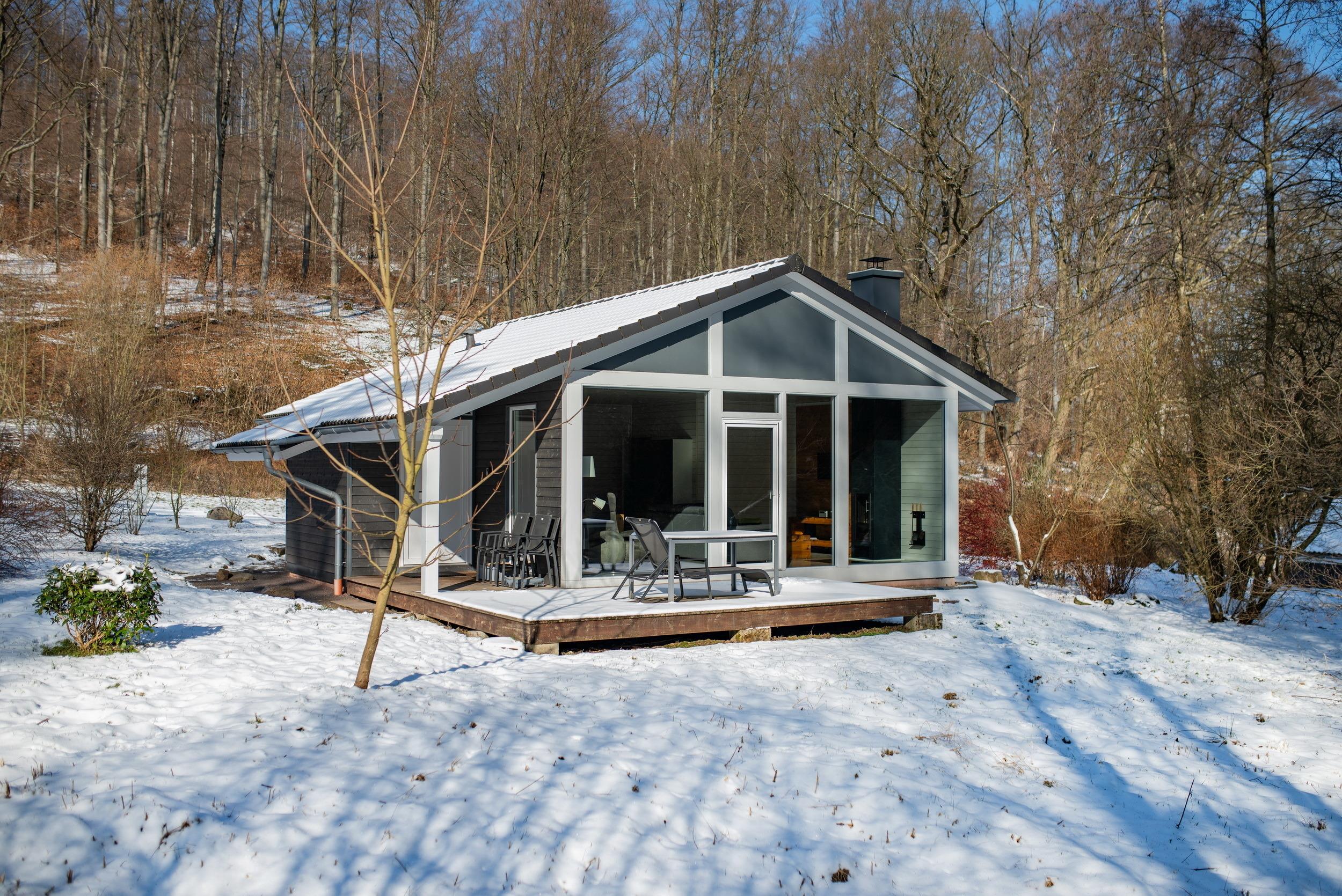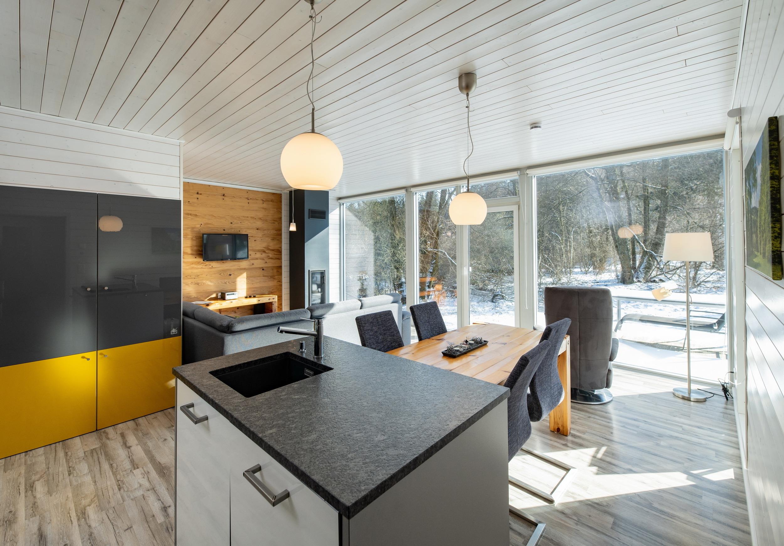 Das Ferienhaus mit einem lichtdurchfluteten offenen Wohn- und Küchenbereich, einem Schlafzimmer und einem Wellness-Bad mit Sauna bietet Ihnen auf 61 Quadratmetern großzügigen Platz für 2 Personen. Die 7 Meter breite Glasfront lässt die Natur beim Essen oder Relaxen teilhaben. In der kalten Jahreszeit vollendet das knisternde Kaminfeuer das Urlaubsfeeling.