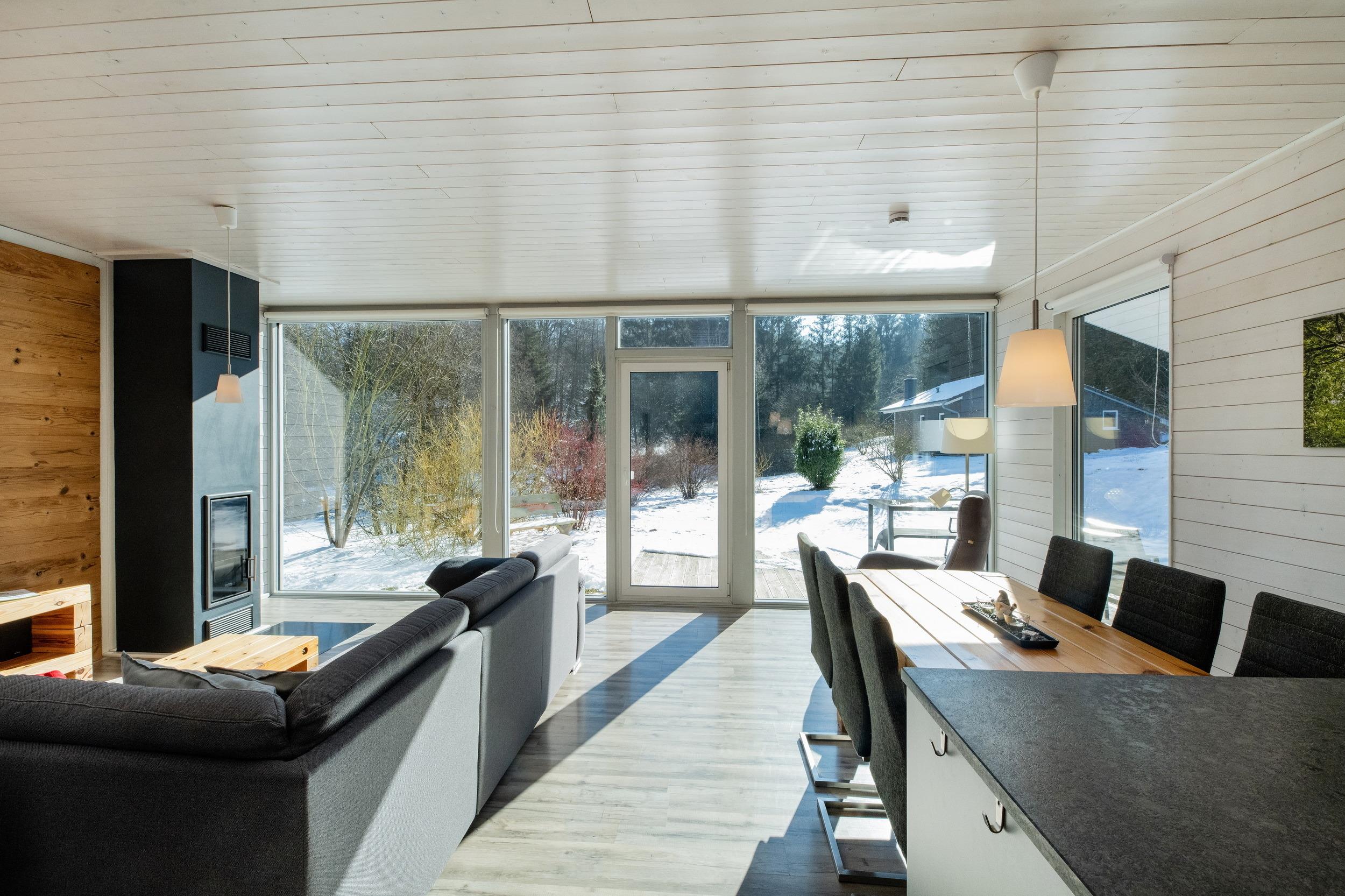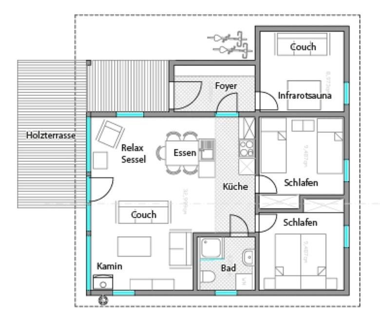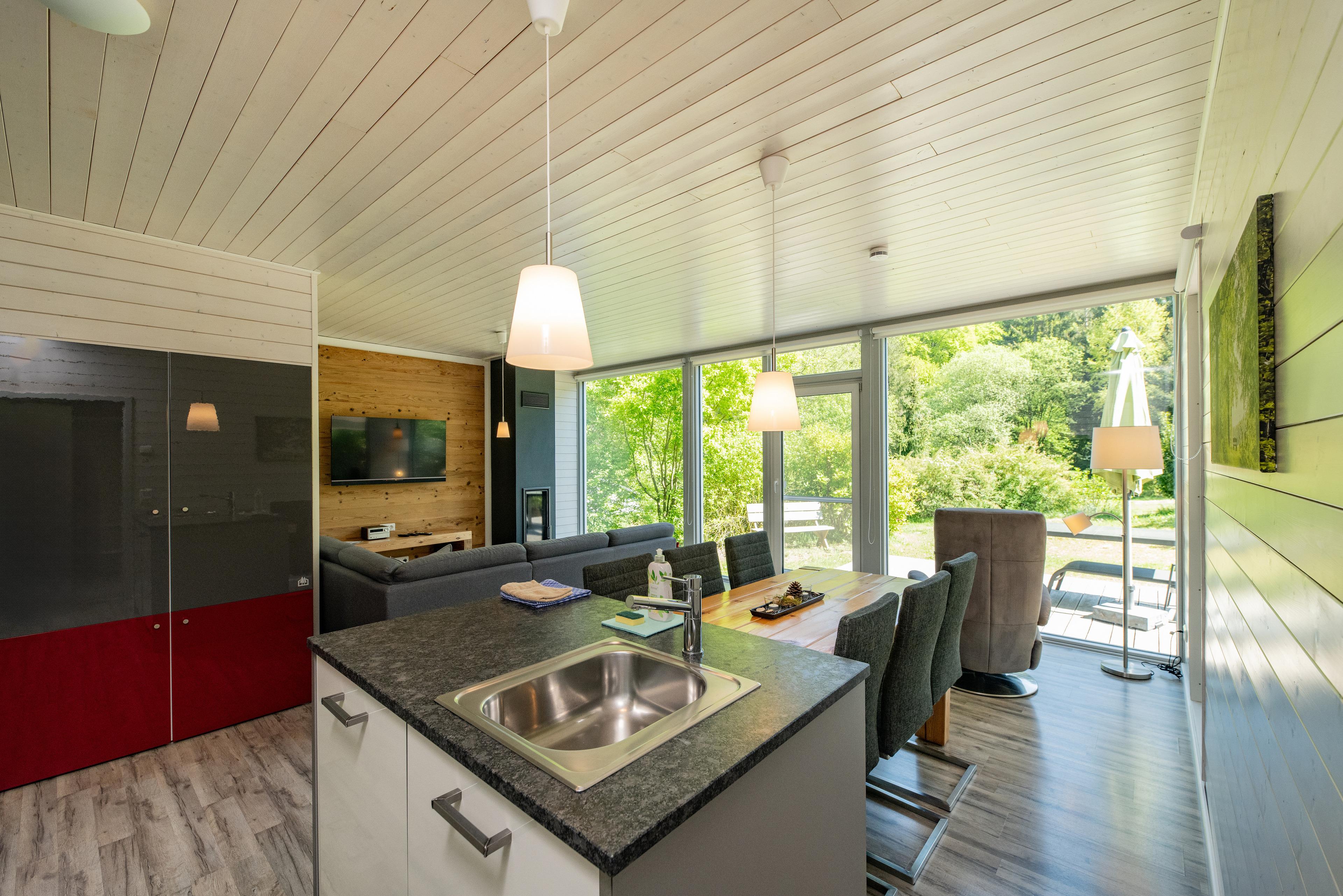 Das Ferienhaus mit einem lichtdurchluteten offenen Wohn- und Küchenbereich, zwei Schlafzimmern, einem Wellnessraum mit Infrarotkabine (Infrarotsauna) und einem Bad bietet Ihnen auf 70 Quadratmetern ausreichend Platz für 4 Personen. Die 7 Meter breite Glasfront lässt die Natur beim Essen oder Relaxen teilhaben. In der kalten Jahreszeit vollendet das knisternde Kaminfeuer das Urlaubsfeeling.