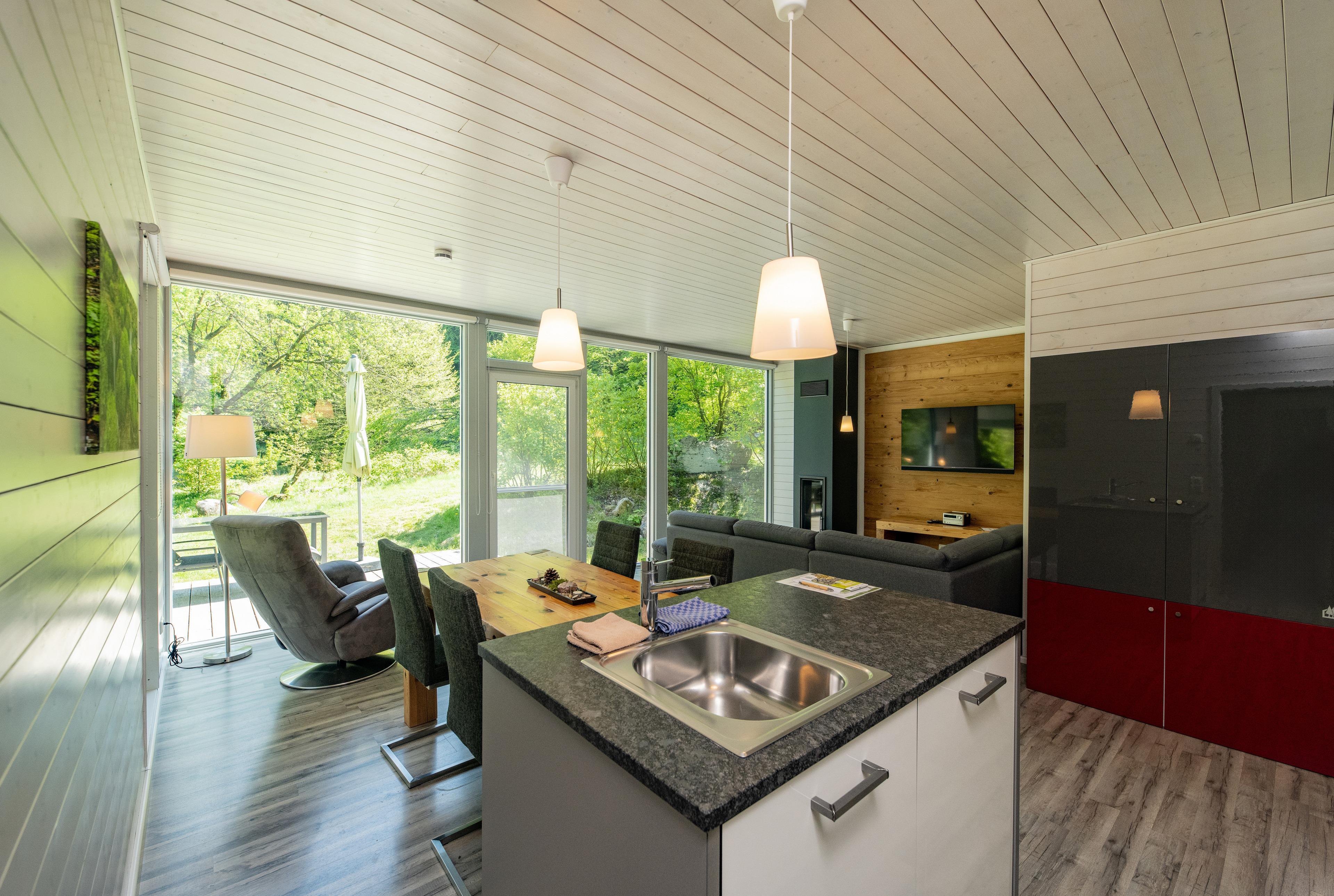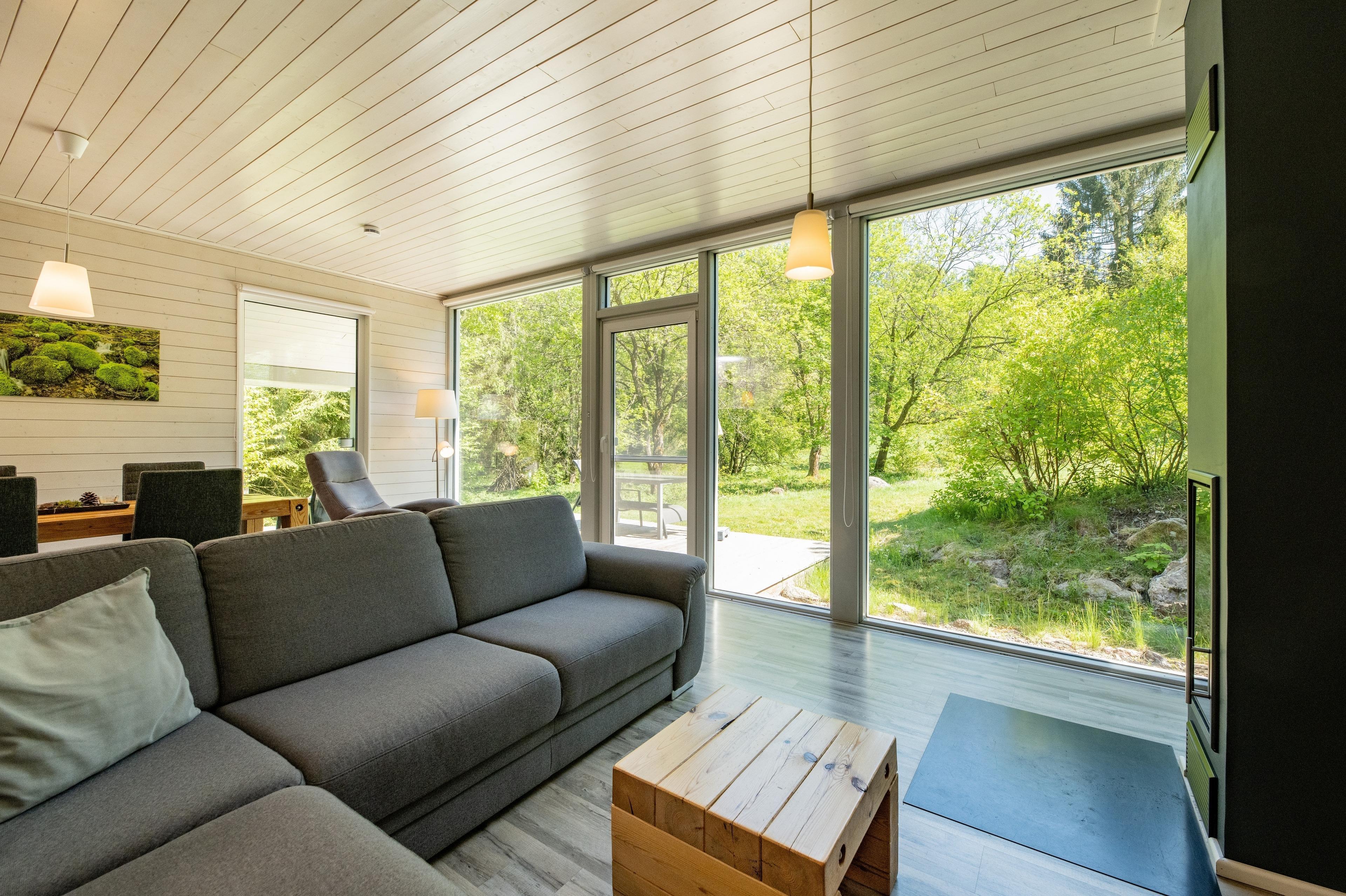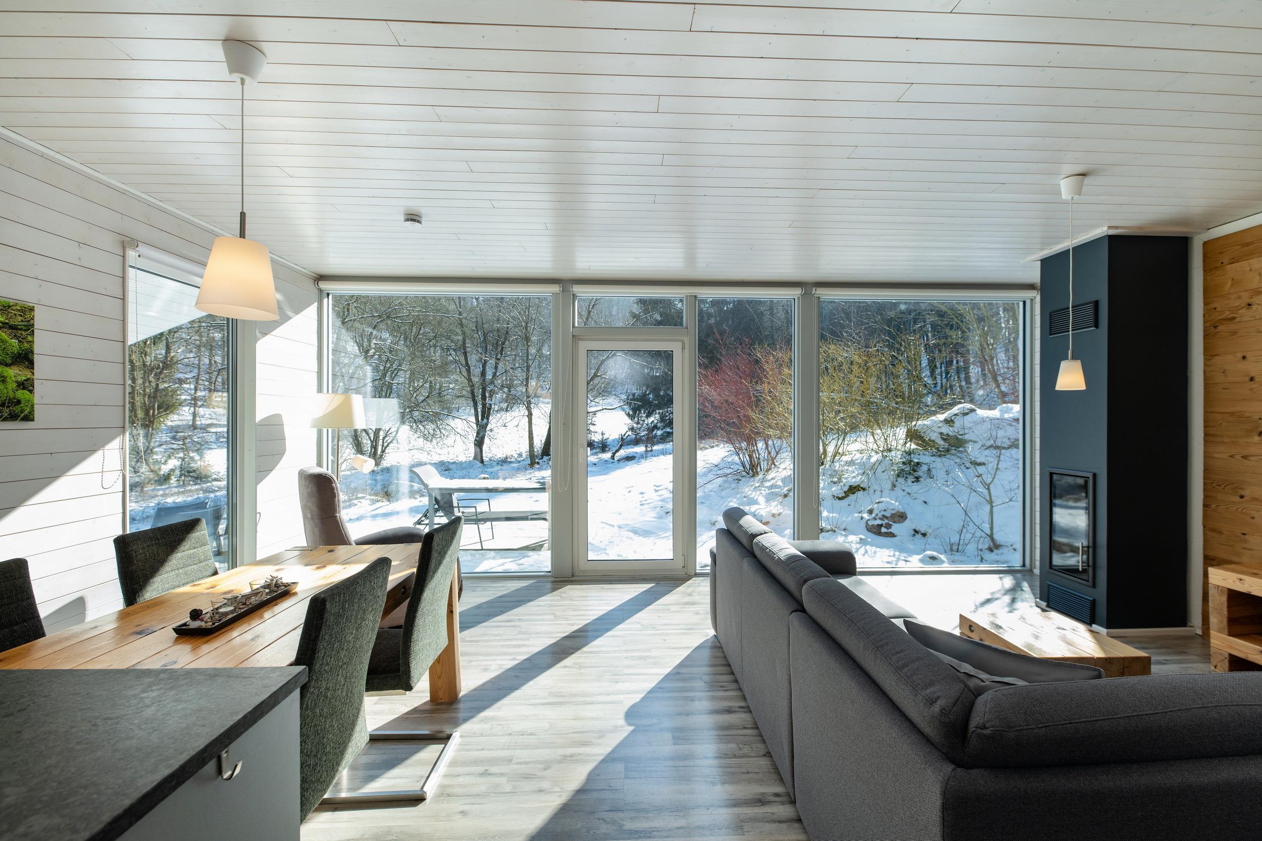 Das Ferienhaus mit einem lichtdurchluteten offenen Wohn- und Küchenbereich, zwei Schlafzimmern und einem Bad bietet Ihnen auf 61 Quadratmetern ausreichend Platz für 4 Personen. Die 7 Meter breite Glasfront lässt die Natur beim Essen oder Relaxen teilhaben. In der kalten Jahreszeit vollendet das knisternde Kaminfeuer das Urlaubsfeeling.