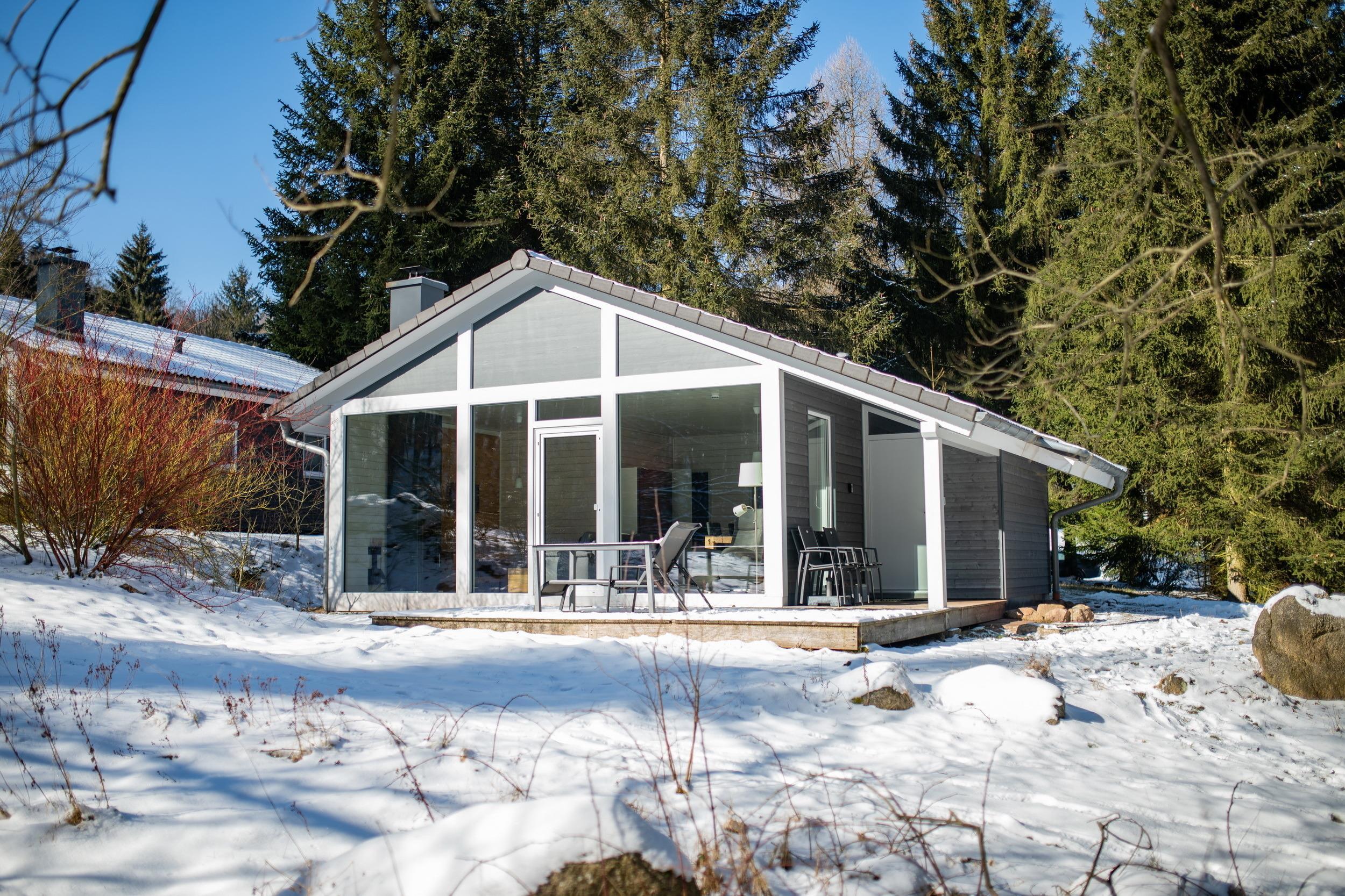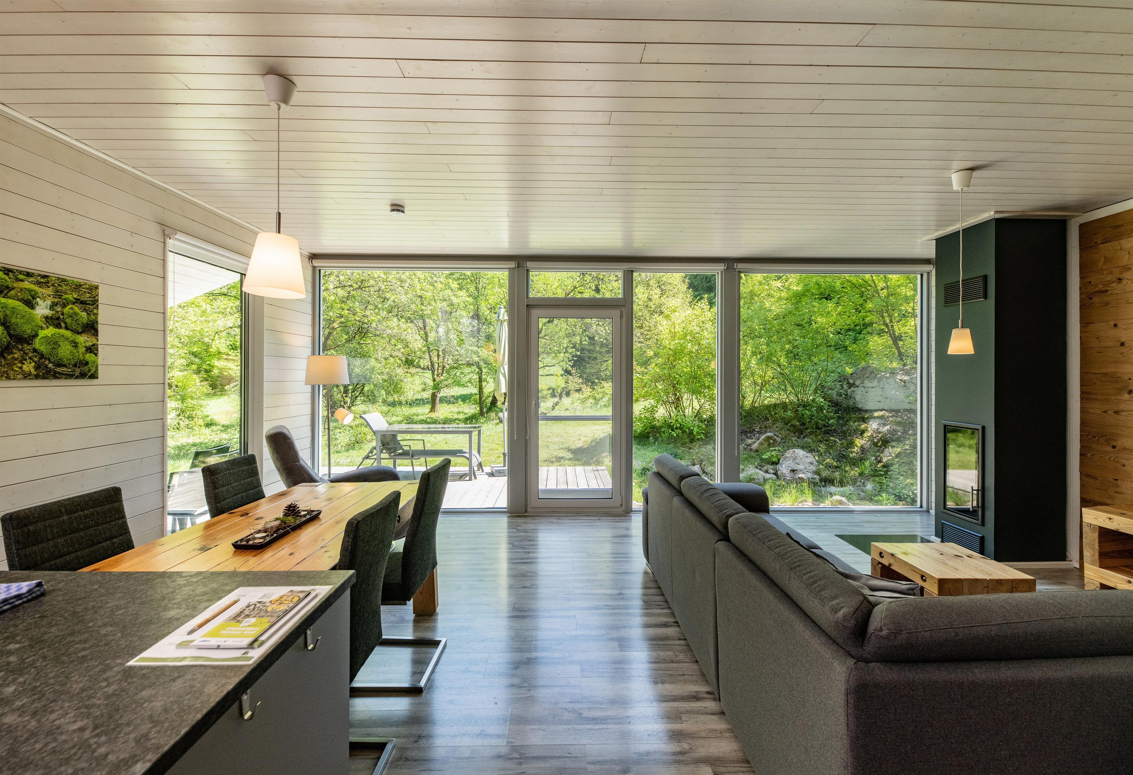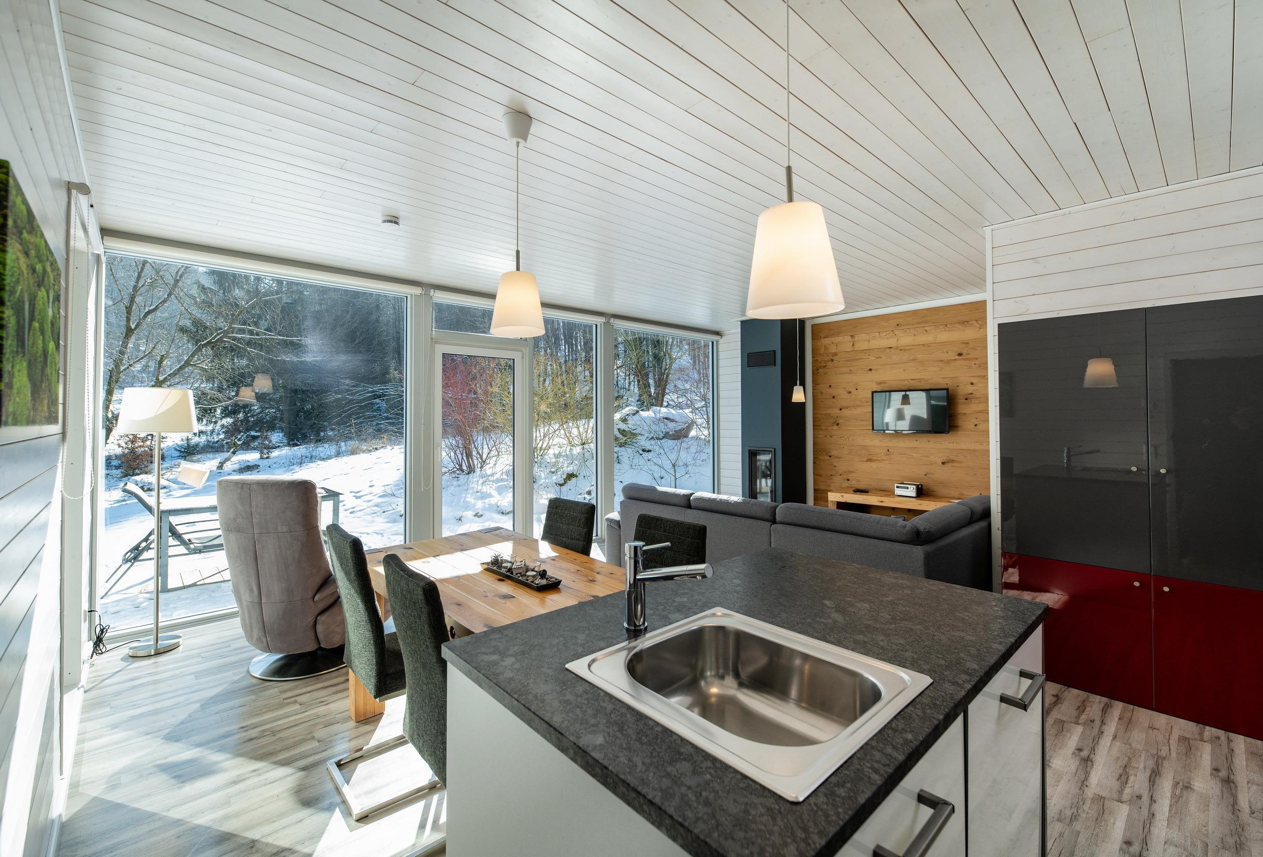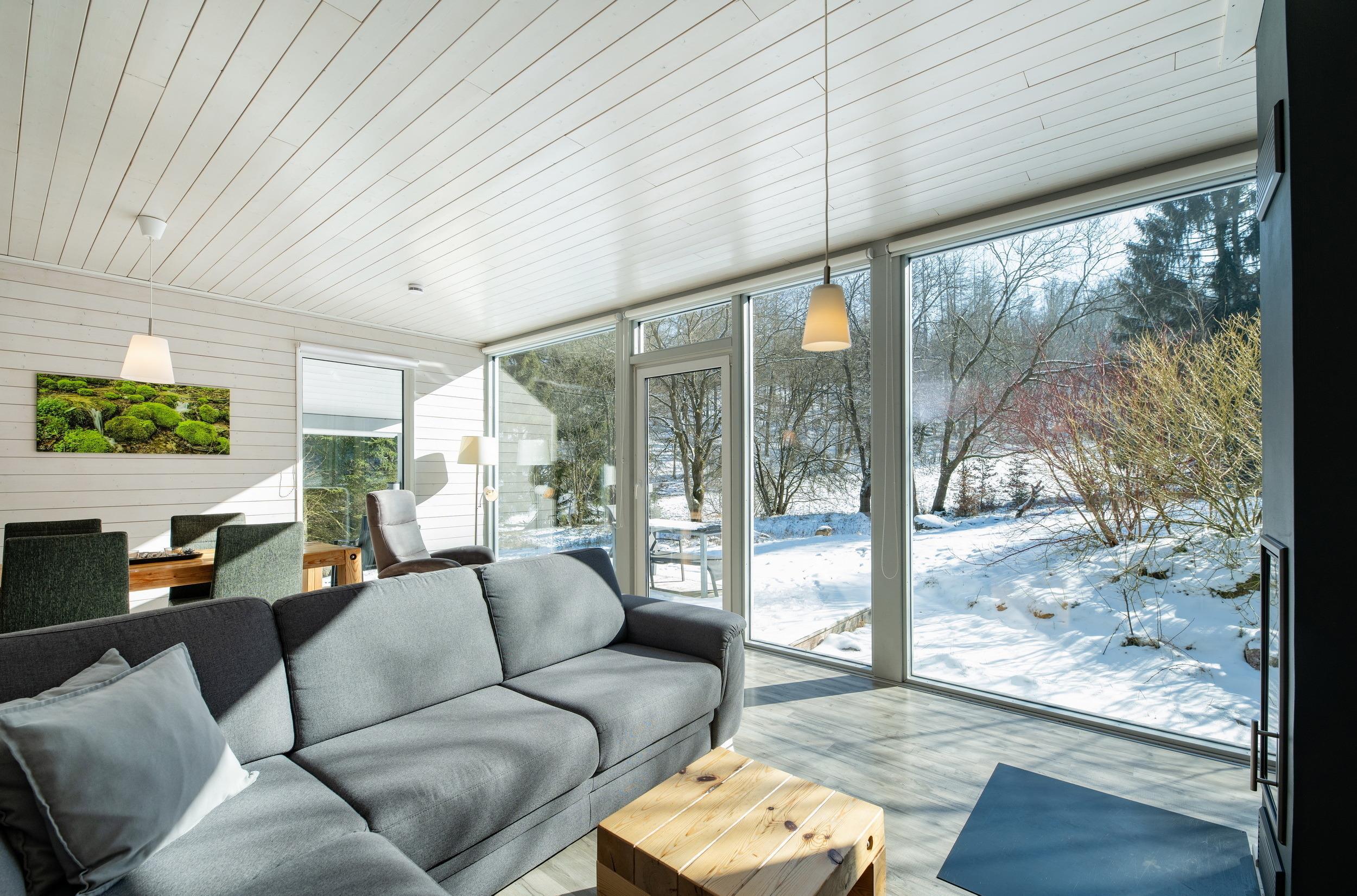 Das Ferienhaus mit einem lichtdurchluteten offenen Wohn- und Küchenbereich, zwei Schlafzimmern und einem Bad bietet Ihnen auf 61 Quadratmetern ausreichend Platz für 4 Personen. Die 7 Meter breite Glasfront lässt die Natur beim Essen oder Relaxen teilhaben. In der kalten Jahreszeit vollendet das knisternde Kaminfeuer das Urlaubsfeeling.