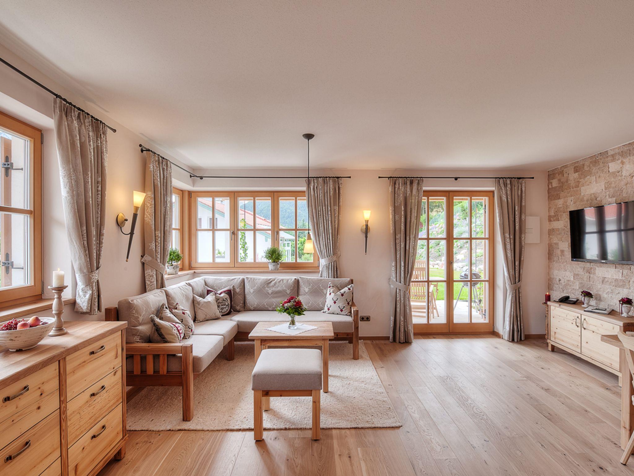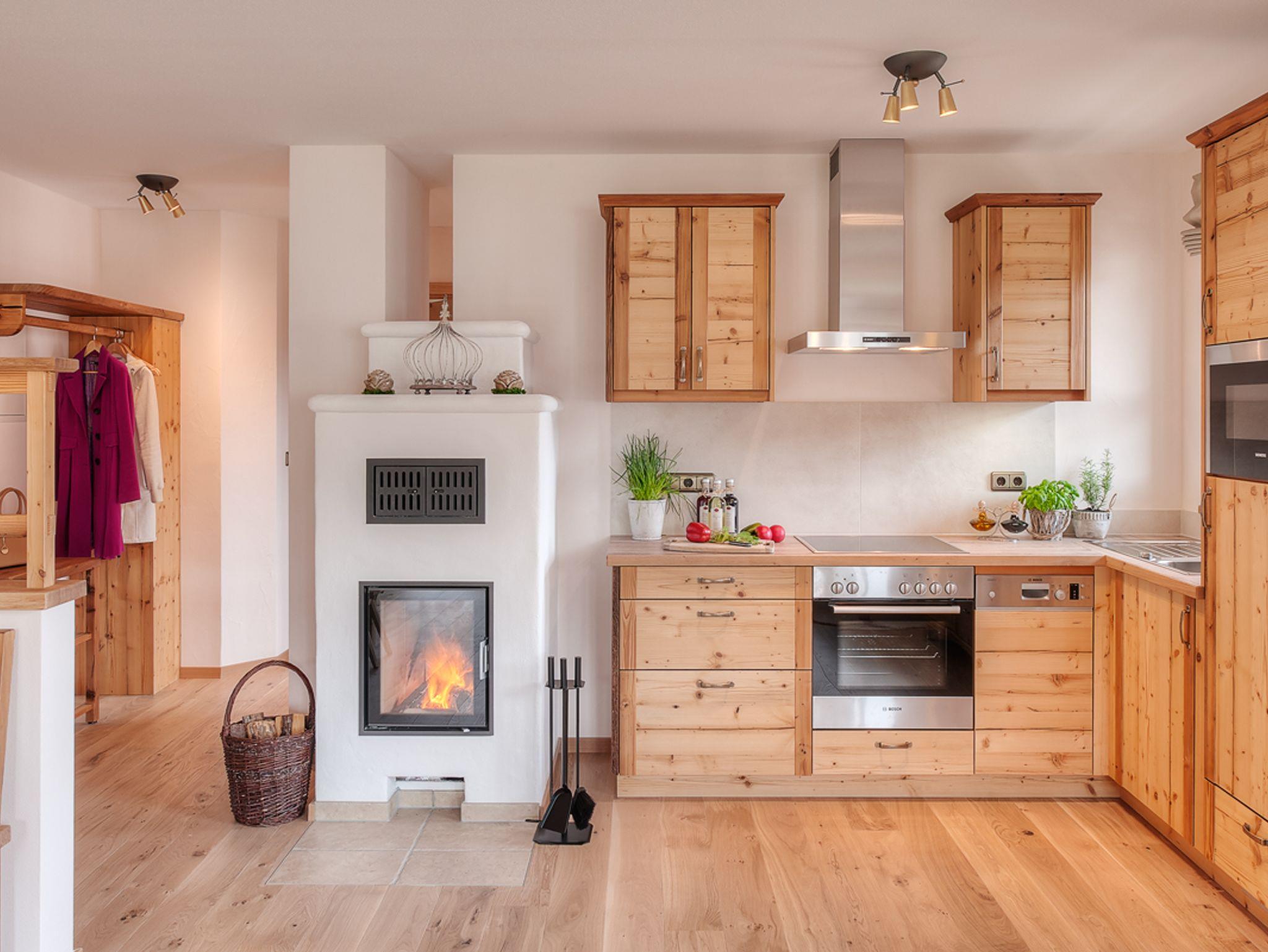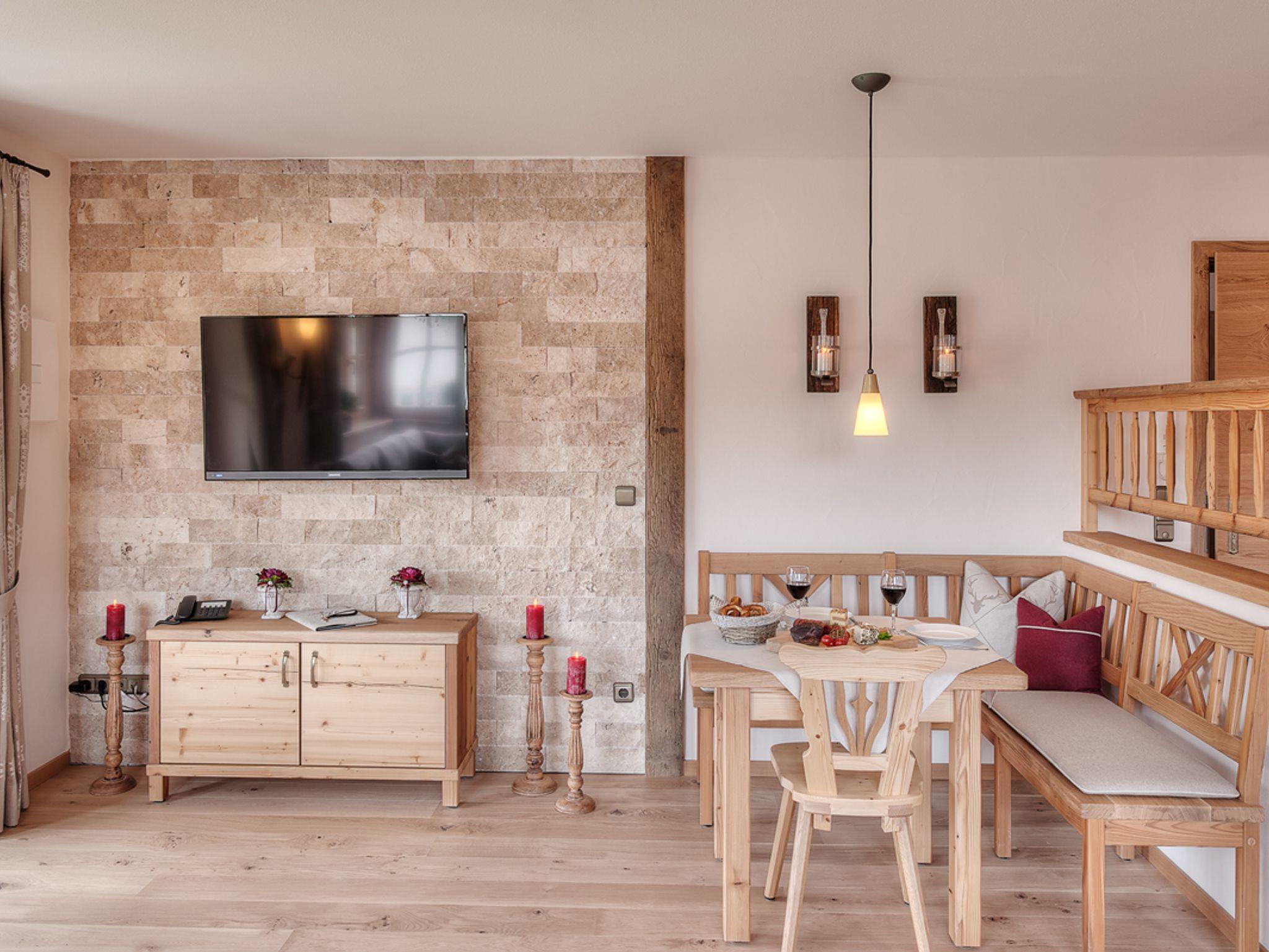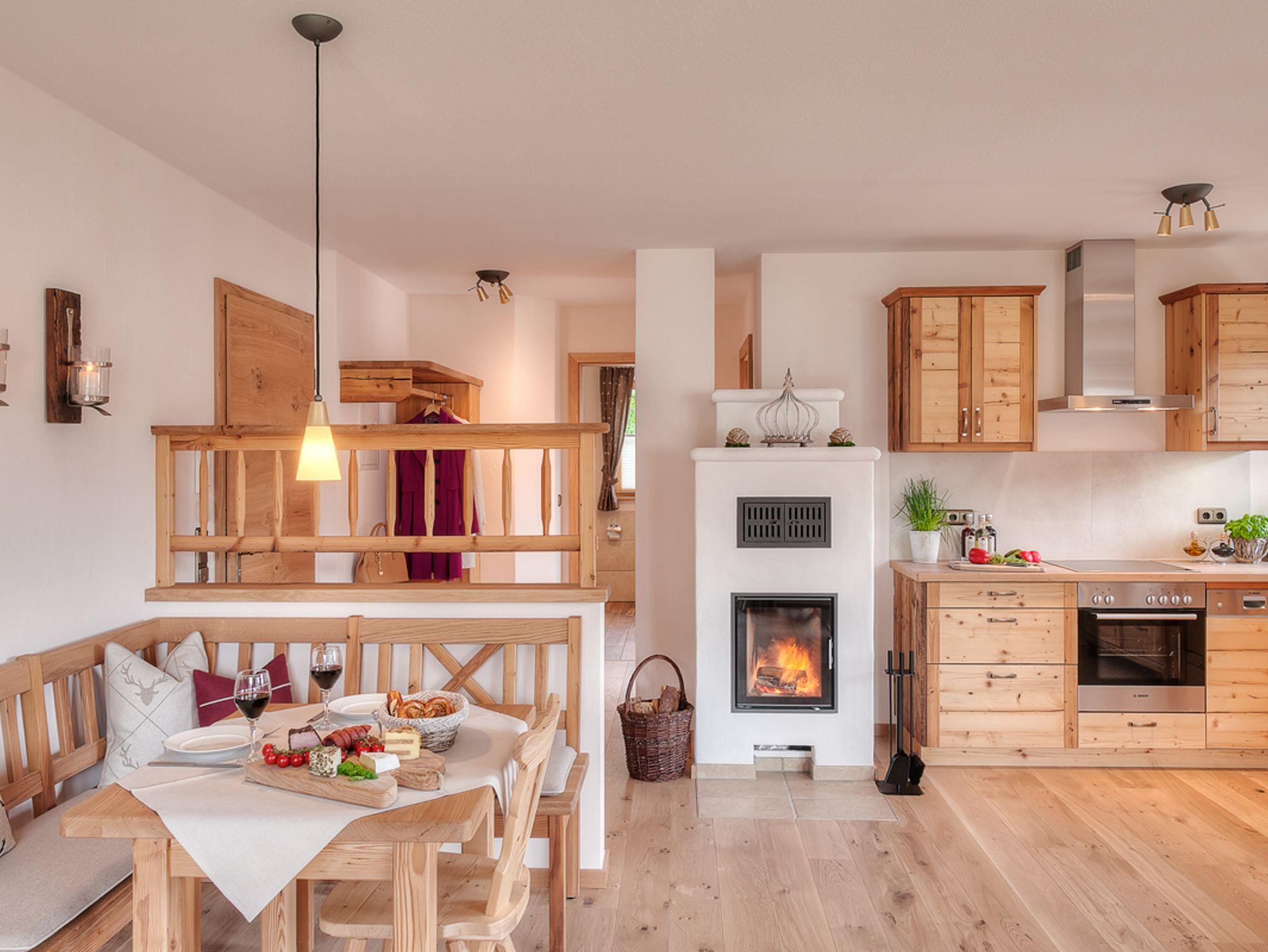 In der Ferienwohnung Jasmin (67m2) fällt es ganz leicht, den Alltag hinter sich zu lassen und im Urlaub anzukommen. Die Erdgeschosswohnung ist in alpenländisch-elegantem Stil gehalten und hochwertig eingerichtet. Wohnraum: Der großzügige, offene Wohnraum ist mit einer vollausgestalteten Küche in Altholzqualität, einem behaglichen Kachelofen zum selbst Anheizen, einer rustikalen Essgruppe und einem großen Wohnbereich mit gemütlichen, geschreinerten Polstermöbeln, Smart-TV und WLAN ausgestattet. Der Wohnbereich führt ebenerdig auf die Süd-Terrasse mit Grill hinaus. Von hier genießen Sie einen malerischen Blick auf das Alpenpanorama. Schlafzimmer:Das Schlafzimmer mit Doppelbett und TV ist zur Gänze aus Zirbenholz gearbeitet und sorgt, dankt der ätherischen Öle der Zirbe, für einen erholsamen Schlaf. Vor dem Schlafzimmer liegt die zweite Terrasse der Wohnung; östlich ausgerichtet lädt sie dazu ein, mit der Sonne in den Tag zu starten. Bad:Das Badezimmer mit alpinem Charme verfügt über eine Badewanne, eine Dusche, einen Waschtisch und ein WC. Lage & Sonstiges:Die Wohnung befindet sich in bester Lage: ruhig, aber dennoch zentral.Ihr Auto können Sie in der hauseigenen Tiefgarage mit angrenzendem abschließbaren Abstellraum parken.
