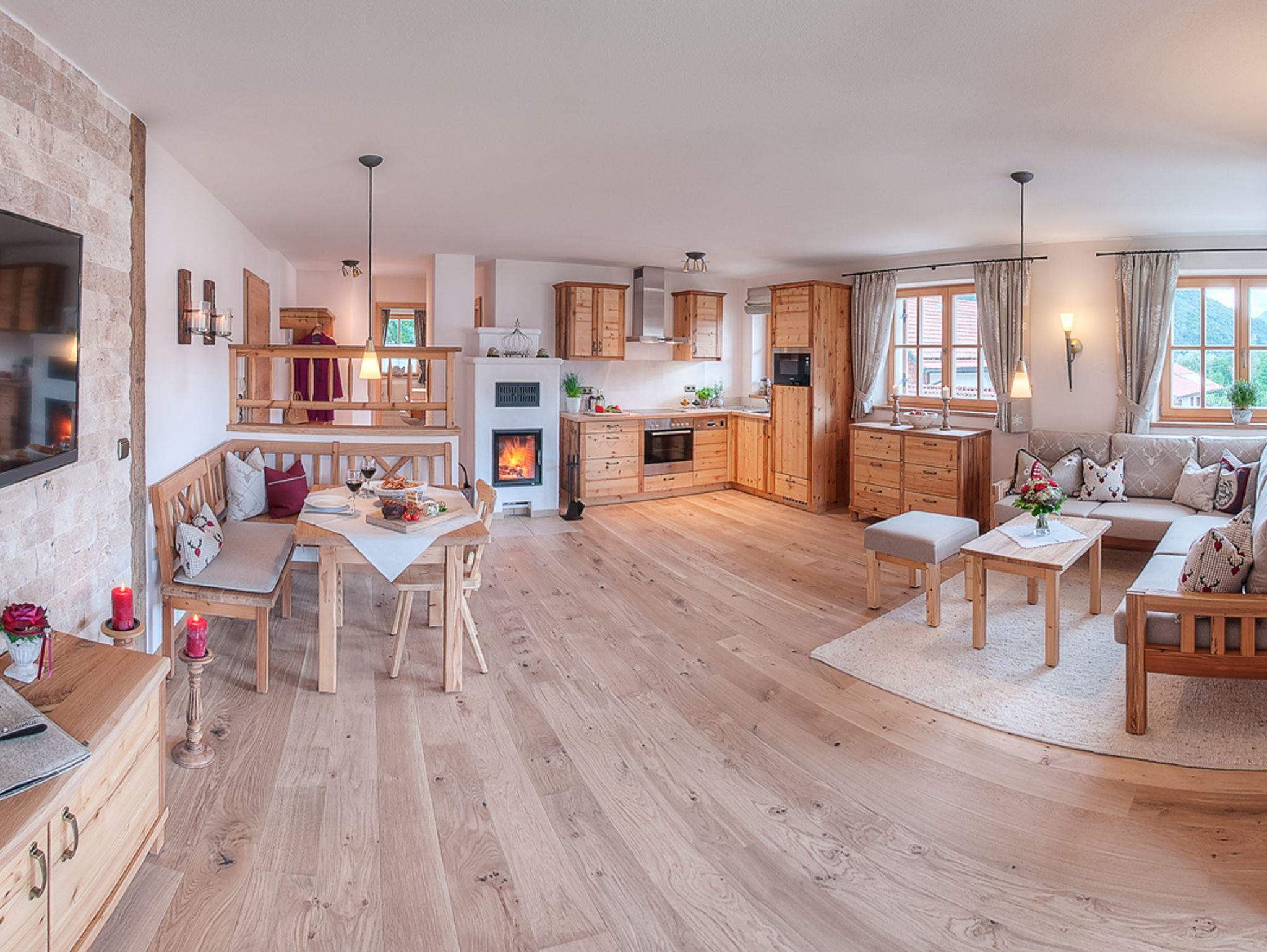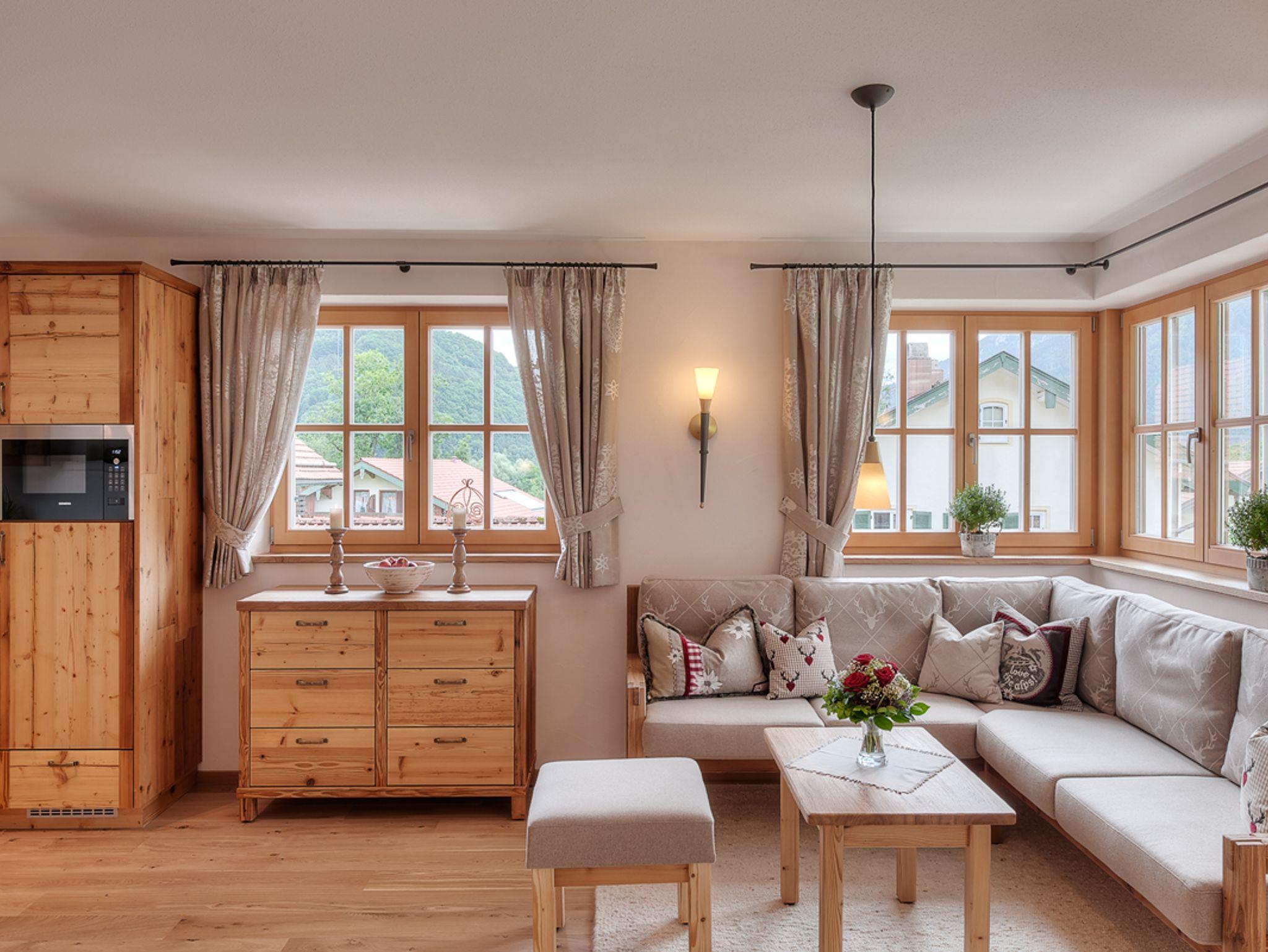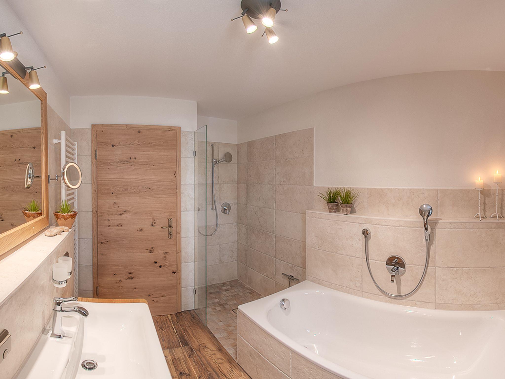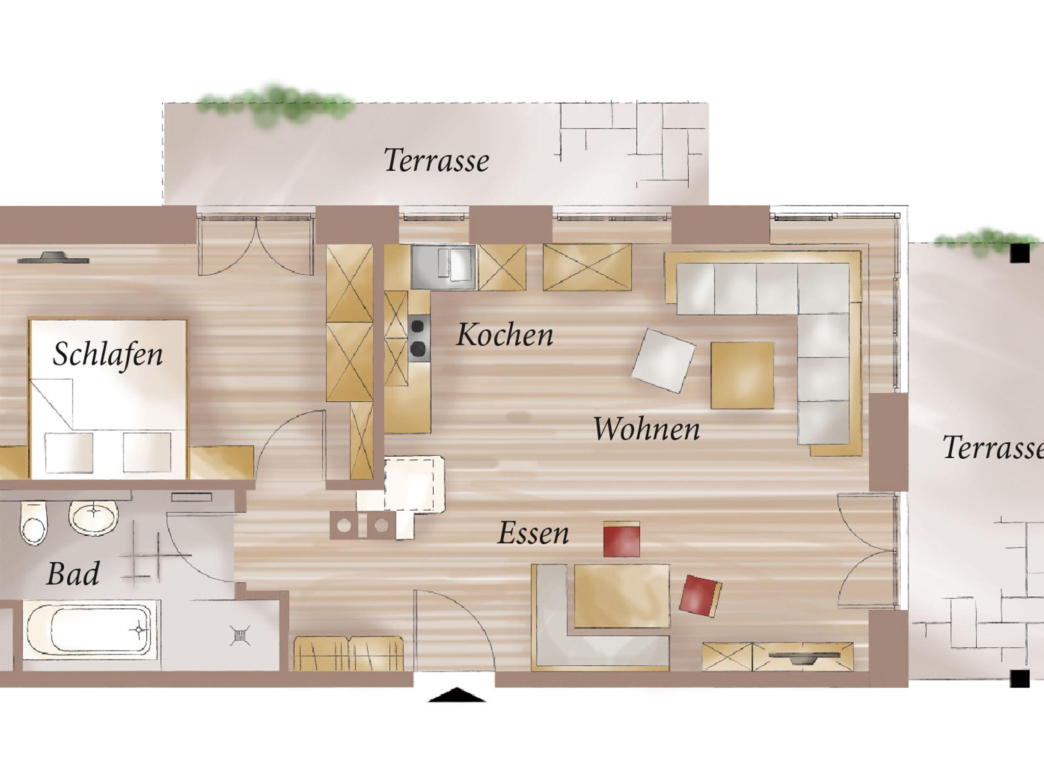 In der Ferienwohnung Jasmin (67m2) fällt es ganz leicht, den Alltag hinter sich zu lassen und im Urlaub anzukommen. Die Erdgeschosswohnung ist in alpenländisch-elegantem Stil gehalten und hochwertig eingerichtet. Wohnraum: Der großzügige, offene Wohnraum ist mit einer vollausgestalteten Küche in Altholzqualität, einem behaglichen Kachelofen zum selbst Anheizen, einer rustikalen Essgruppe und einem großen Wohnbereich mit gemütlichen, geschreinerten Polstermöbeln, Smart-TV und WLAN ausgestattet. Der Wohnbereich führt ebenerdig auf die Süd-Terrasse mit Grill hinaus. Von hier genießen Sie einen malerischen Blick auf das Alpenpanorama. Schlafzimmer:Das Schlafzimmer mit Doppelbett und TV ist zur Gänze aus Zirbenholz gearbeitet und sorgt, dankt der ätherischen Öle der Zirbe, für einen erholsamen Schlaf. Vor dem Schlafzimmer liegt die zweite Terrasse der Wohnung; östlich ausgerichtet lädt sie dazu ein, mit der Sonne in den Tag zu starten. Bad:Das Badezimmer mit alpinem Charme verfügt über eine Badewanne, eine Dusche, einen Waschtisch und ein WC. Lage & Sonstiges:Die Wohnung befindet sich in bester Lage: ruhig, aber dennoch zentral.Ihr Auto können Sie in der hauseigenen Tiefgarage mit angrenzendem abschließbaren Abstellraum parken.