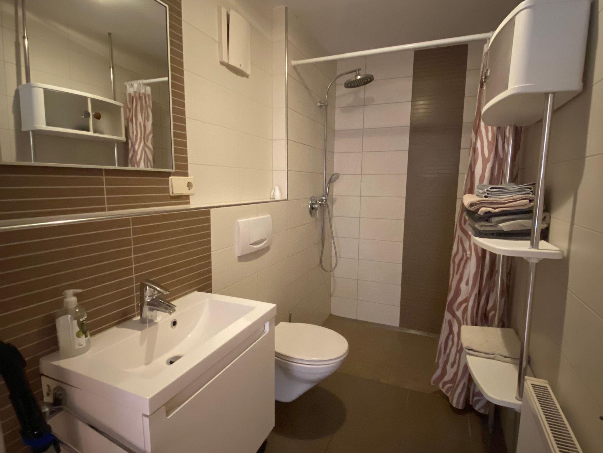 Statt eines Duschvorhanges wäre eine Duschabtrennung zu empfehlen.