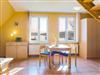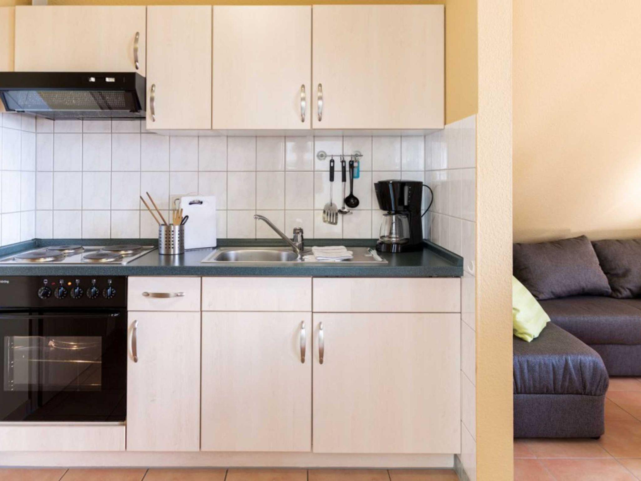 Mit komplett ausgestatteter Küche mit Kühl- und Gefrierkombi, 4 Kochplatten, Kaffeemaschine, Wasserkocher.
