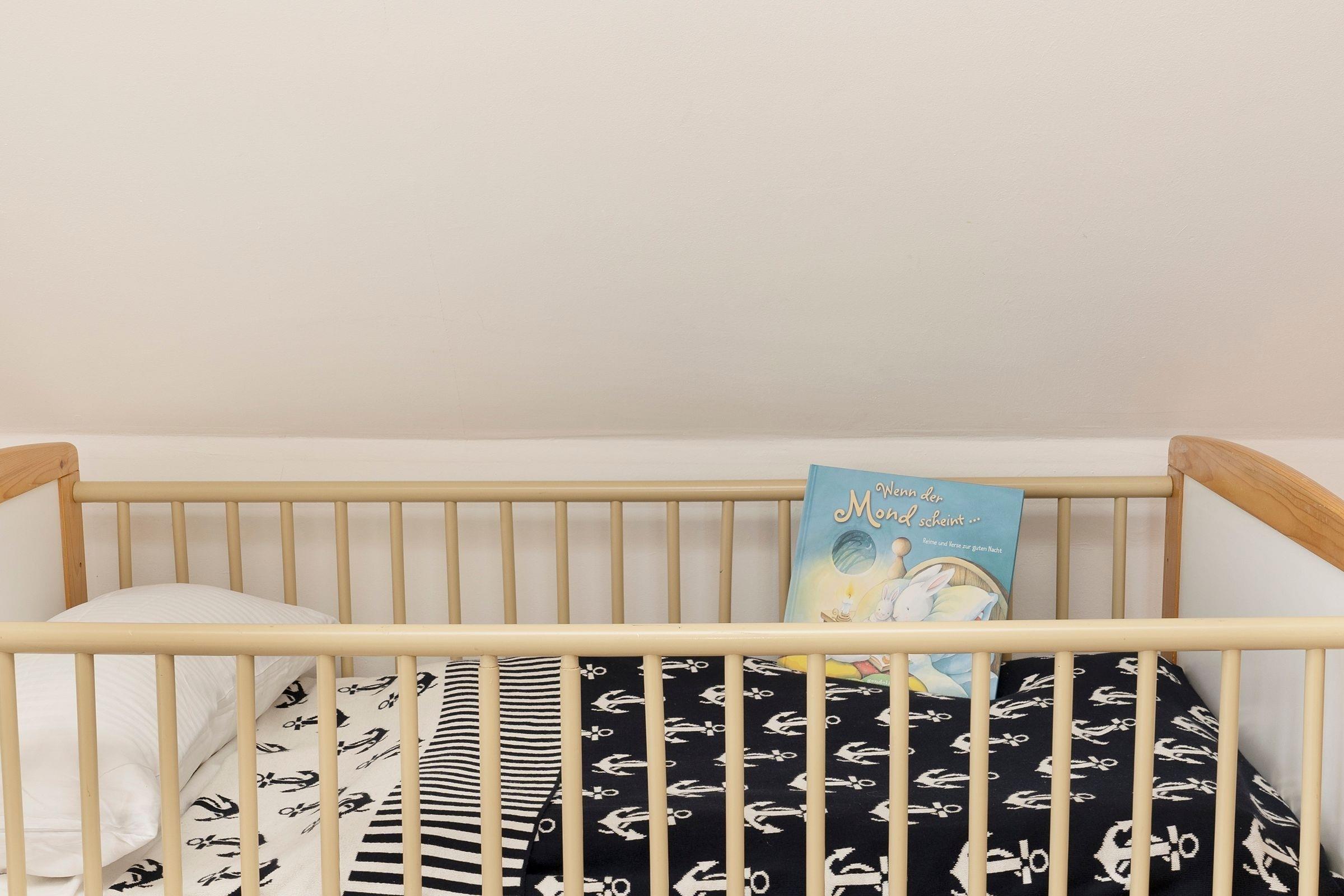 Schlafzimmer: 1 Doppelbett (2x 90x200 cm), 1 Gitterbett, Kleiderschrank