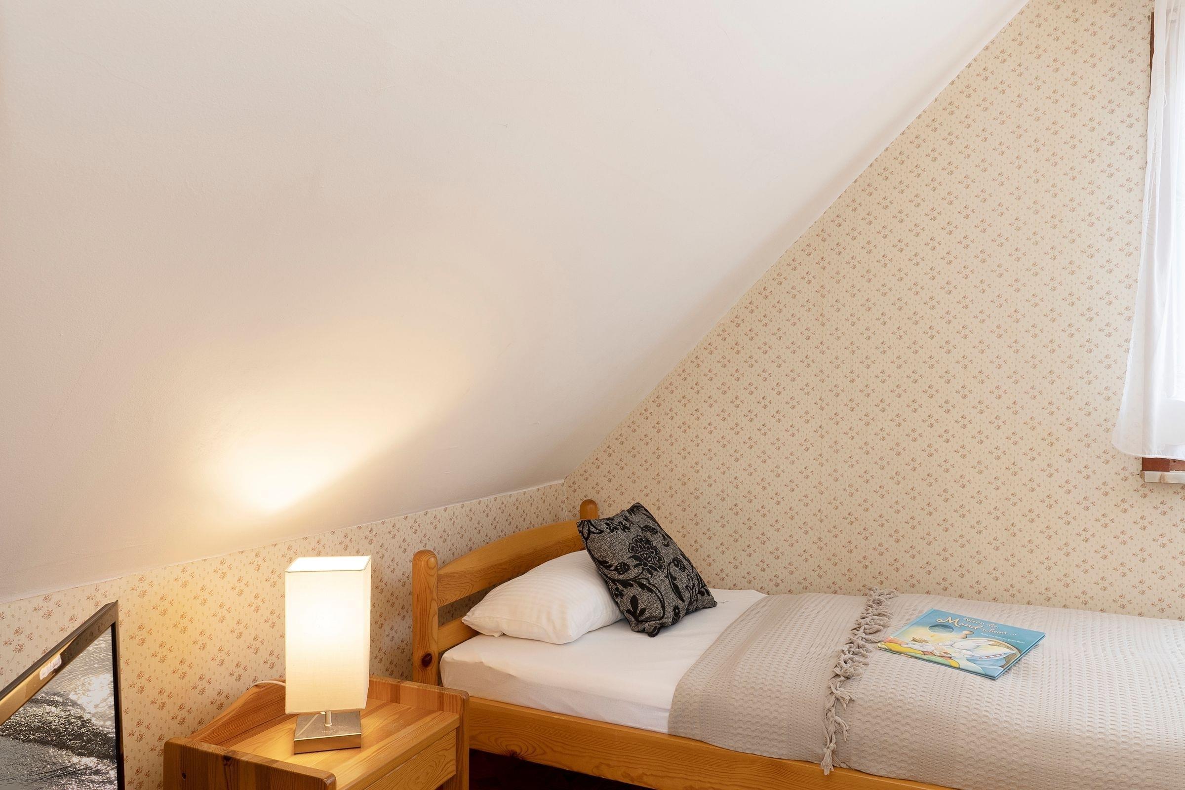 Von dem modernen Wohn-/Esszimmer aus erreichen Sie die sonnige Terrasse vor dem Haus. Das moderne Badezimmer besticht durch eine Dusche mit flachem Einstieg und heller Badkeramik. Vom Wohnzimmer aus, das Sie mit einem gusseisernen Ofen empfängt, geht es hinauf zu den zwei Schlafräumen. Das Schlafzimmer mit gemütlichem Doppelbett (2x 90x200 cm) sorgt für erholsamen Schlaf. Der zweite Schlafraum ist mit zwei Einzelbetten (je 90x200 cm) und einem Flachbildfernseher mit integriertem DVD-Player (kein Fernsehempfang) ausgestattet. Ein Kinderbett sowie ein weiteres Zustellbett sorgen für weitere Schlafmöglichkeiten.
