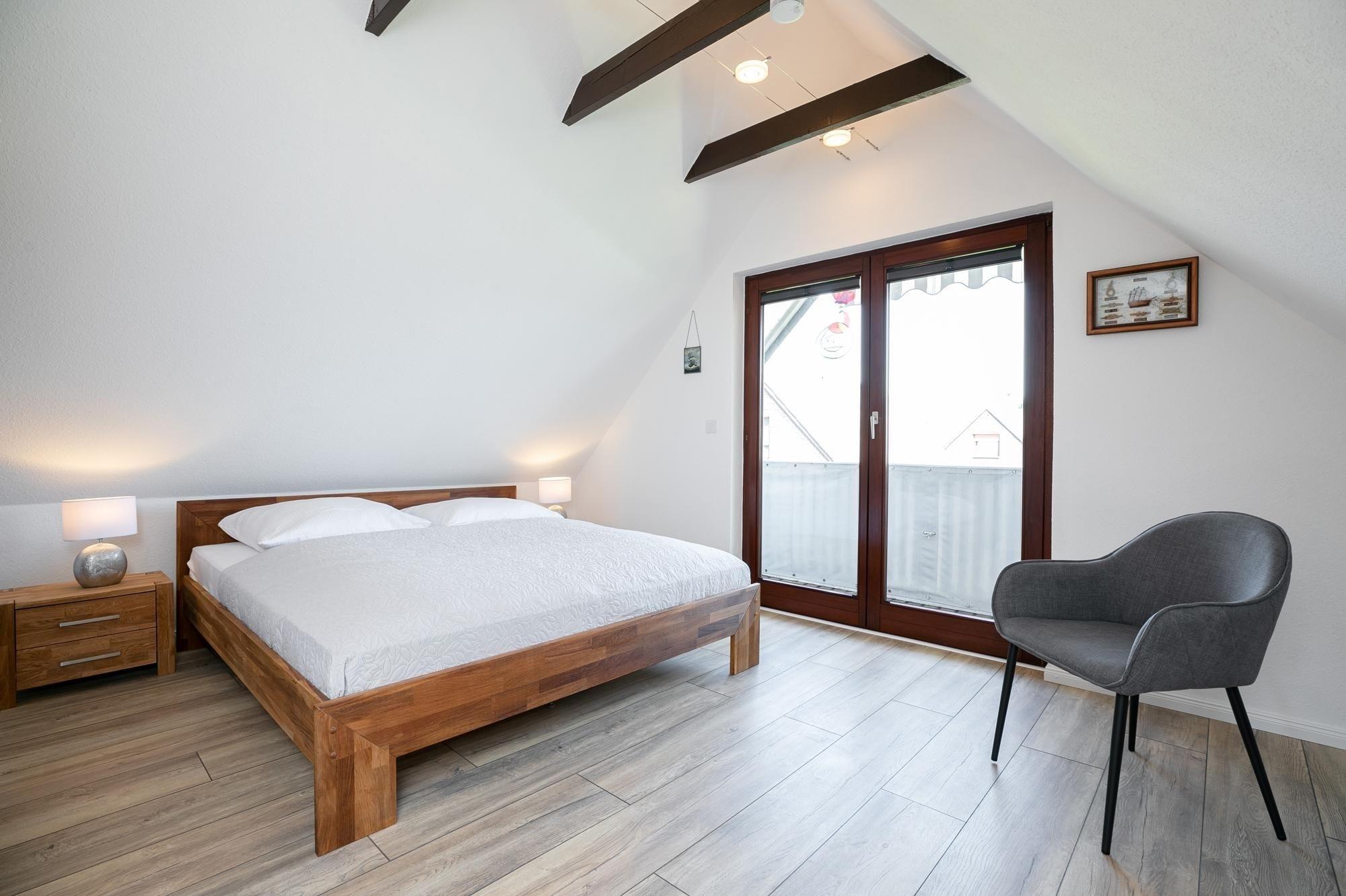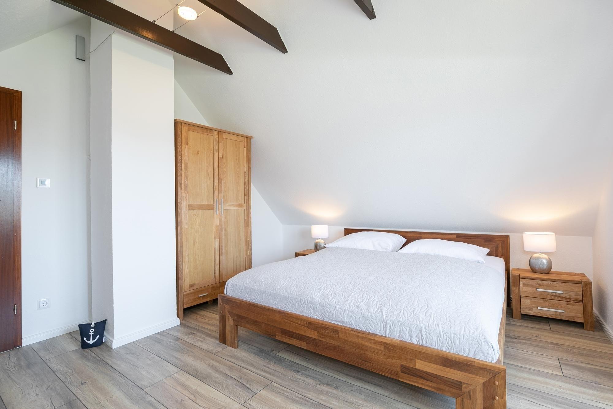 Im 1. Obergeschoss bietet das Elternschlafzimmer ein Doppelbett (180cm x 200 cm), Außenjalousien, einen geräumigen Kleiderschrank sowie den Zugang zum Balkon mit Teilmeerblick. Im Kinderzimmer befinden sich 2 Einzelbetten (90cm x 200 cm), ein 2. Fernseher und ebenfalls verdunkelnde Außenjalousien. Alle Matratzen bieten ein komfortables Boxspring-Feeling in jeder Lage.