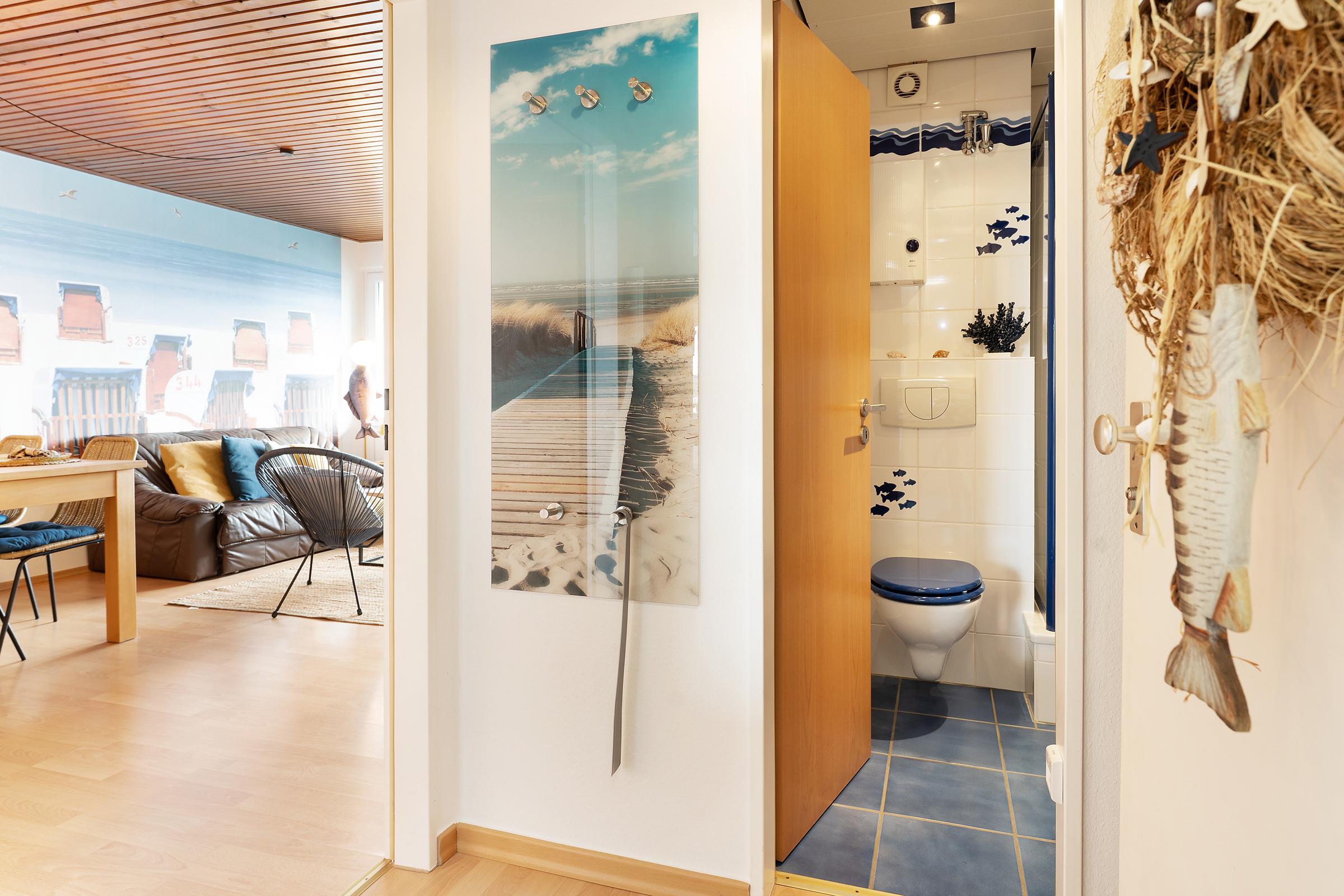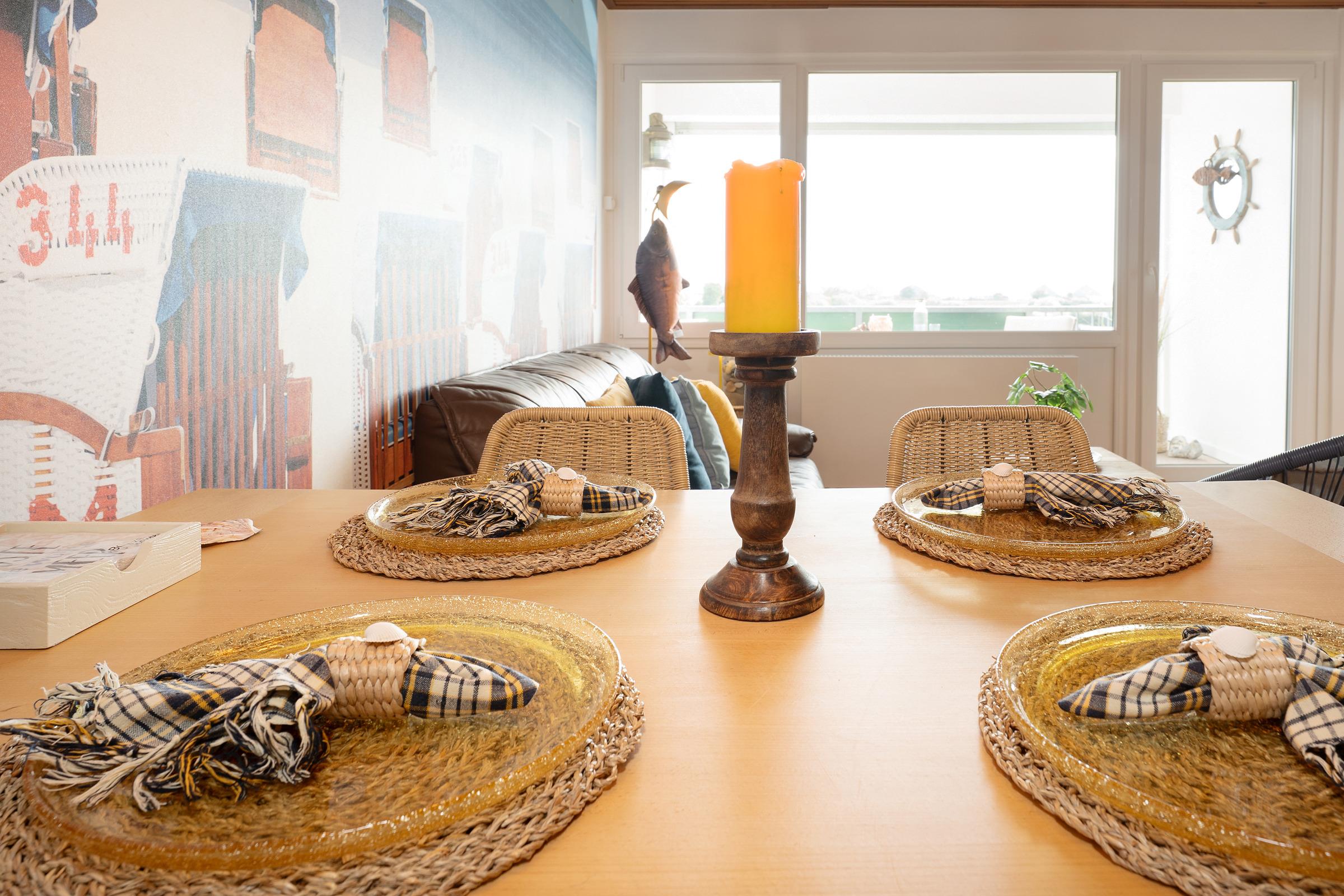 Der helle, modern gestaltete Wohnbereich mit dem gemütlichen Sofa, das bei Bedarf in einen Schlafplatz (140x180cm) für weitere 2 Personen verwandelt werden kann, lädt nach ausgiebigen Spaziergängen zum Entspannen ein. Für Unterhaltung sorgt der Flachbild-Fernseher, ein DVD- sowie ein CD-Player. Nur wenige Schritte trennen Sie vom möblierten Balkon, auf dem Sie wunderbar Ihren morgendlichen Kaffee mit Blick auf die Ostsee genießen können, sogar ein Grill ist vorhanden und lädt zu genussvollen Barbecue-Abenden ein.