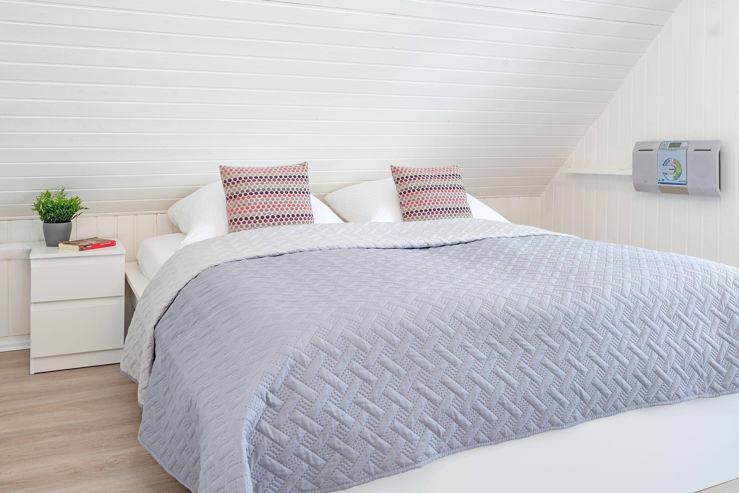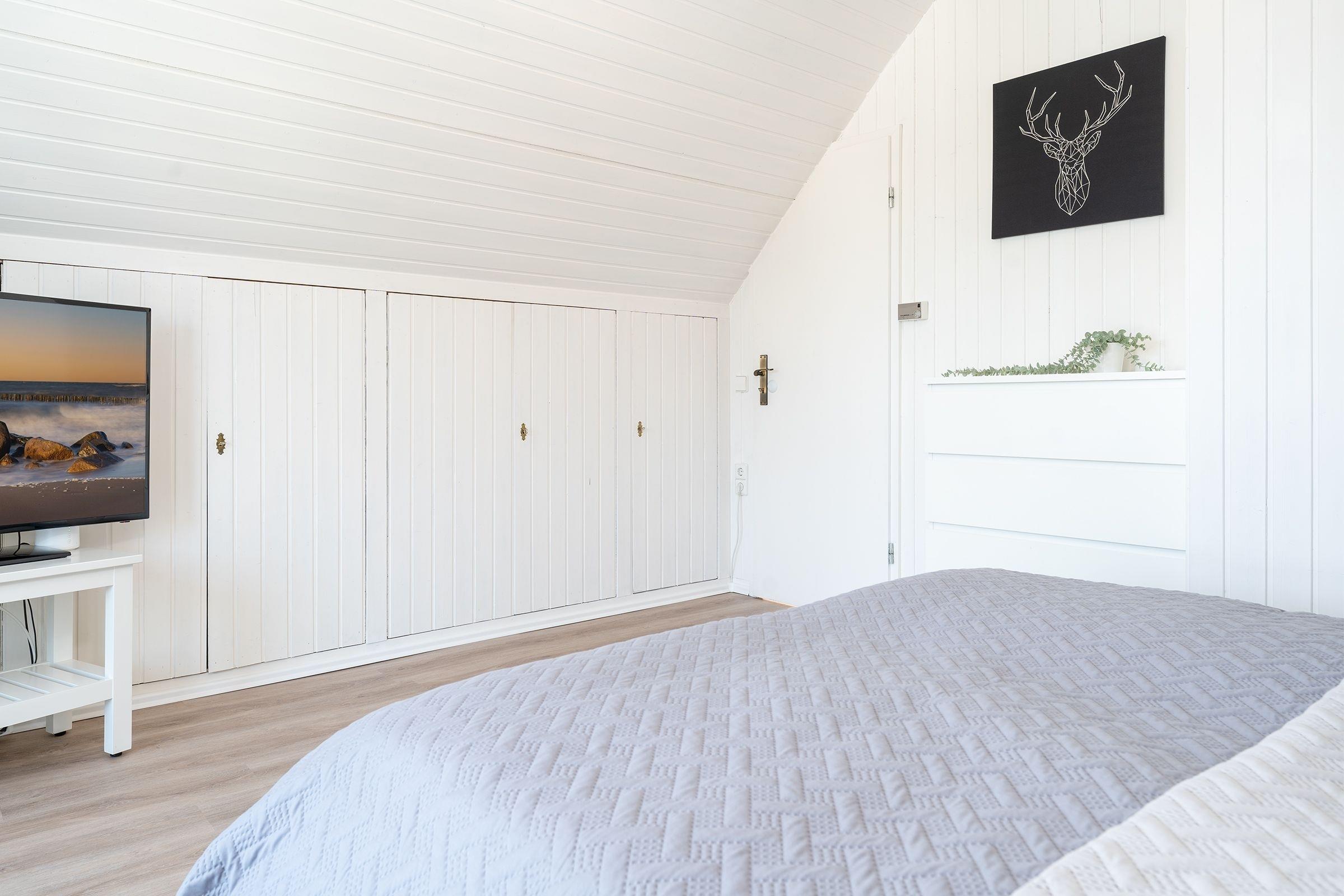 Das freistehende Haus Schaumburg bietet jede Menge Komfort und Lieblingsplätze. Der geschmackvoll eingerichtete Wohnbereich im Erdgeschoss punktet durch mehrere bequeme Sitzgelegenheiten, ein TV-Gerät sowie einen Kaminofen, der für eine wohlige Atmosphäre sorgt. Vom gemütlichen Wintergarten aus haben Sie Zutritt auf die möblierte Terrasse. Genießen Sie hier Ihre Auszeit bei einem Glas Wein. Im eingezäunten Garten wartet eine weitere Sitzecke auf Sie. Wie wäre es hier mit einem gemütlichen Grillabend? Wer seine Speisen lieber im Haus zubereitet, darf sich über die moderne offene Küche freuen. Die gute Küchenausstattung ist kaum zu toppen. Weiterhin gibt es im Erdgeschoss ein Duschbad mit Fenster, Föhn und Fußbodenheizung. Im Souterrain steht Ihnen ein weiteres Bad mit Badewanne inkl. Duschmöglichkeit, Kosmetikspiegel, Föhn und Fußbodenheizung zur Verfügung. Das Besondere: Hier befindet sich zudem eine Infrarot-Sauna, die Sie sicher an kühleren Tagen zu schätzen wissen. Ein Schlafzimmer mit Doppelbett (ca. 180x200cm) sowie einem Einzelbett (ca. 90x200cm) lädt hier zum Träumen ein. Das Obergeschoss ist mit zwei weiteren Schlafzimmern ausgestattet: In dem einen Raum befinden sich ein Doppelbett (2x 80x200 cm), ein Kleiderschrank sowie ein zusätzliches TV-Gerät. Von hier aus haben Sie einen schönen Meerblick. In dem anderen Raum stehen zwei Einzelbetten (je 90x200 cm) und ein Kleiderschrank, dieser Raum kann durch ein Rollo verdunkelt werden.