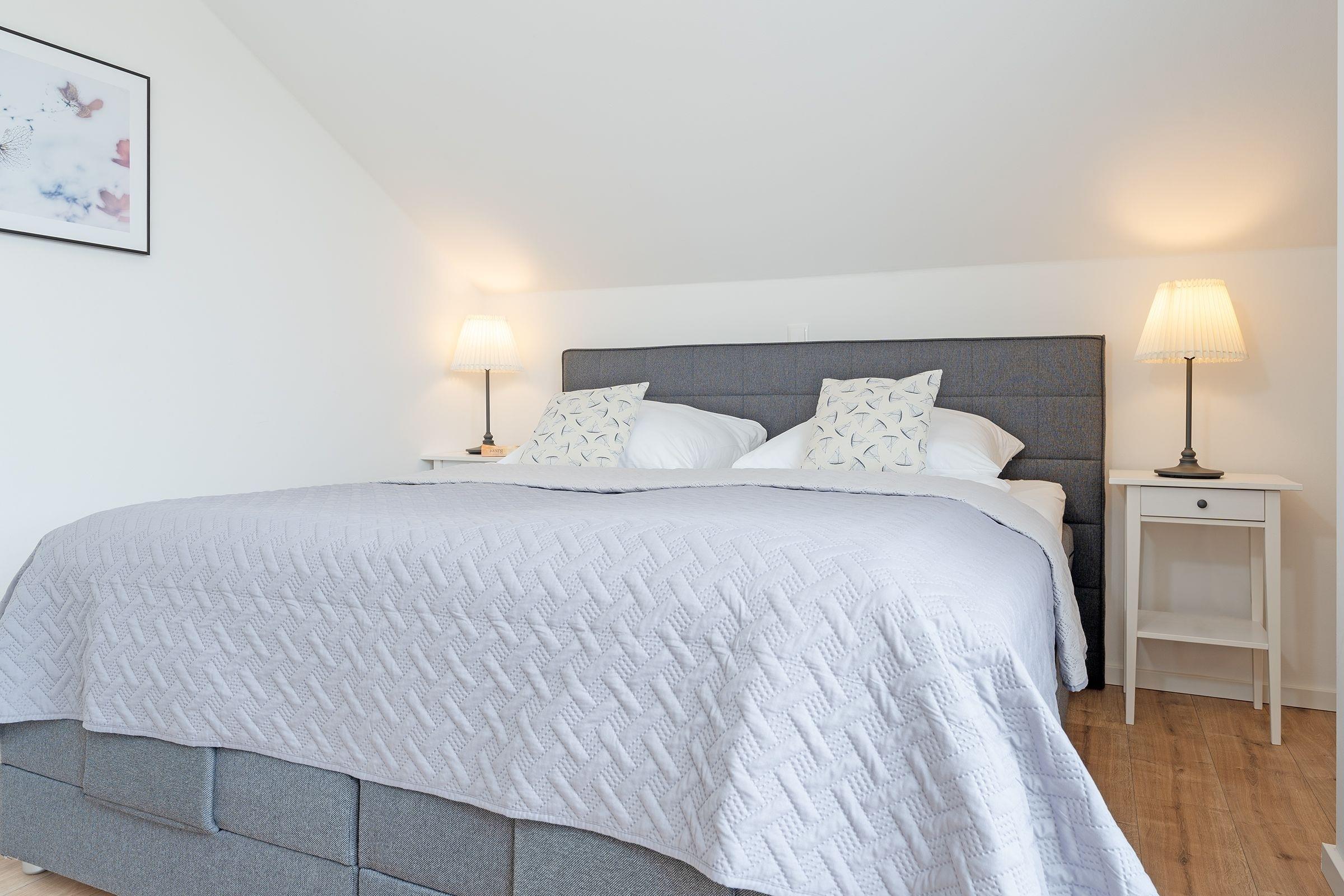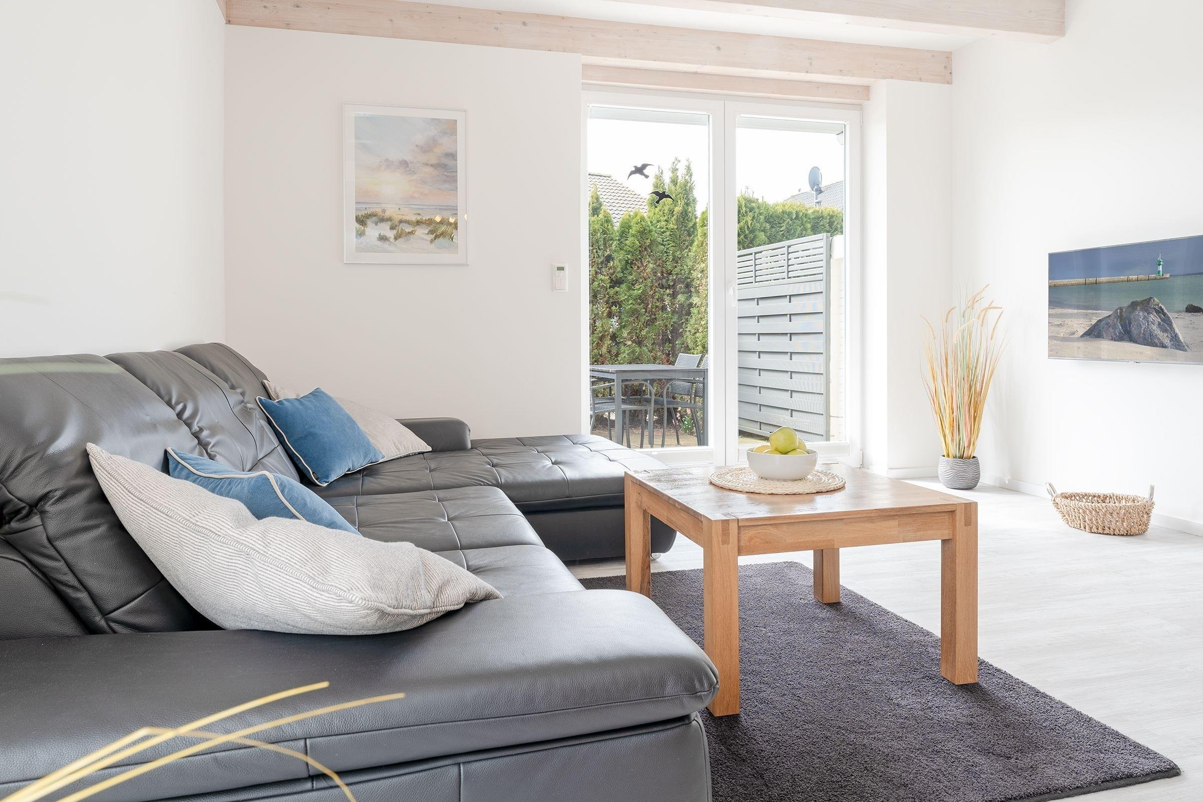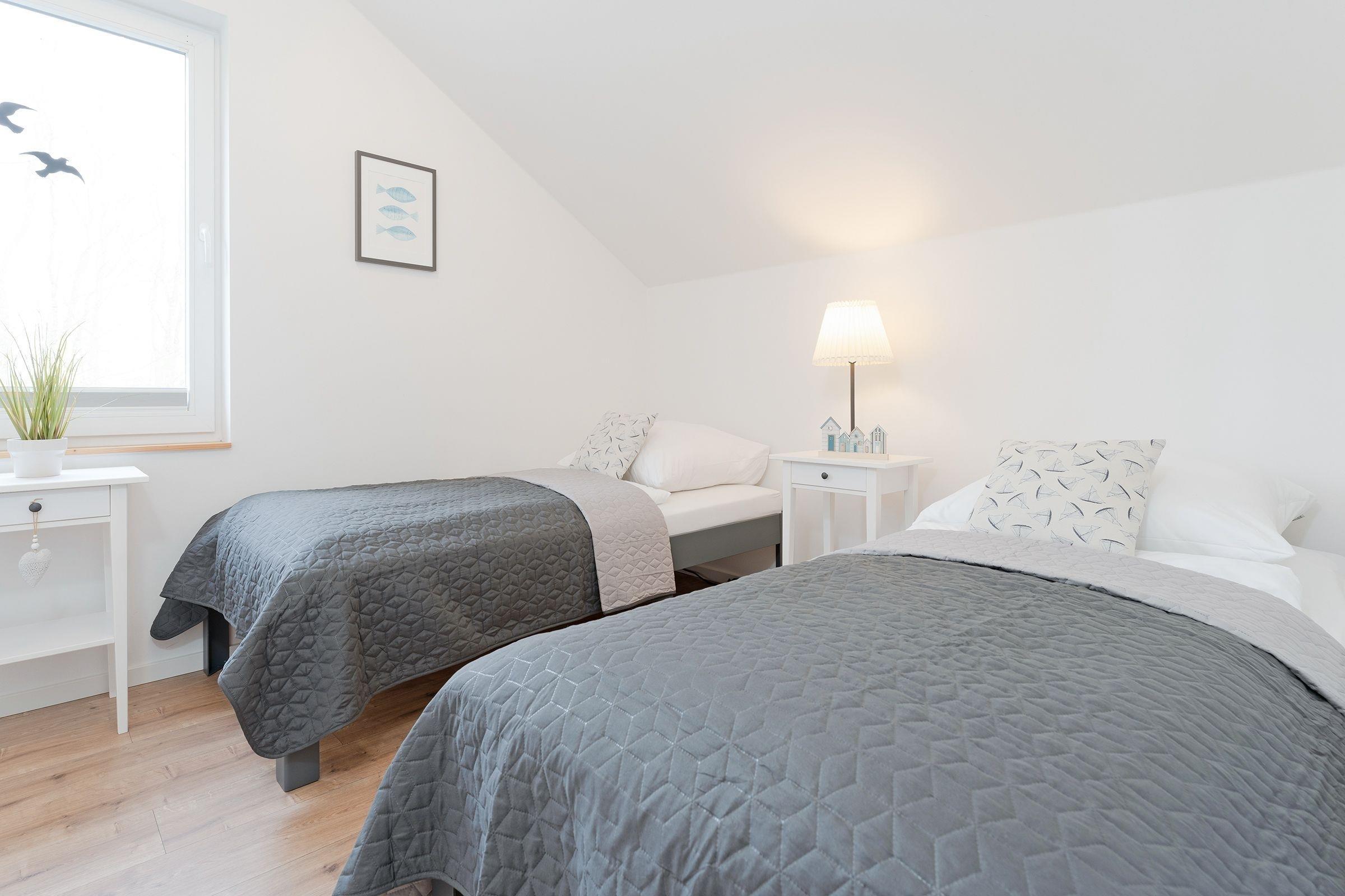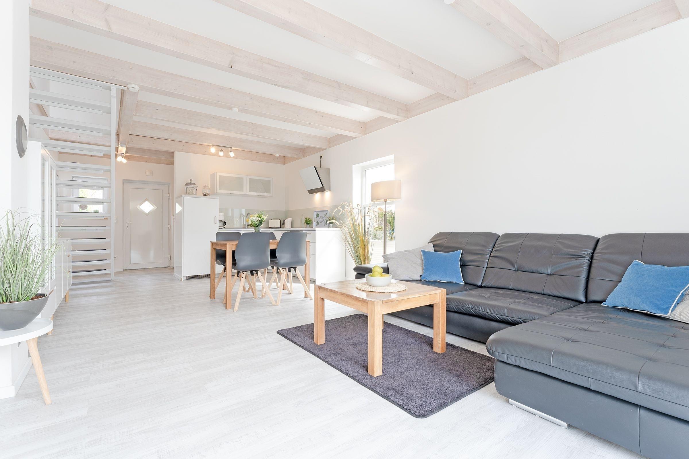 Wer sich im Urlaub gern an der frischen Luft aufhält, ist hier richtig: Das Haus Seeadler 4 liegt schön idyllisch, der Ostseestrand ist rund 300 Meter entfernt. Im hellen Wohnbereich sorgen offene Balken für eine wohlige Atmosphäre. Nehmen Sie Platz auf der großzügigen Sofalandschaft mit Blick aufs TV-Gerät – oder ins Grüne. Die beiden sonnigen Terrassen sind möbliert und im Garten darf gern gegrillt werden. Auch in der modernen Küche mit Induktionsherd und Spülmaschine können Sie Ihre Lieblingsspeisen zubereiten. Genießen Sie diese auf dem süßen Balkon oben. Erholsame Nächte versprechen die beiden Schlafzimmer, eins ist mit einem Boxspring-Doppelbett (2x 90x200 cm) und eins mit 2 Einzelbetten (je 90x200 cm) ausgestattet. Das moderne Badezimmer oben mit Tageslicht verspricht einen guten Start in den neuen Tag. Im Untergeschoss gibt es ein Gäste-WC mit einem Waschtrockner.