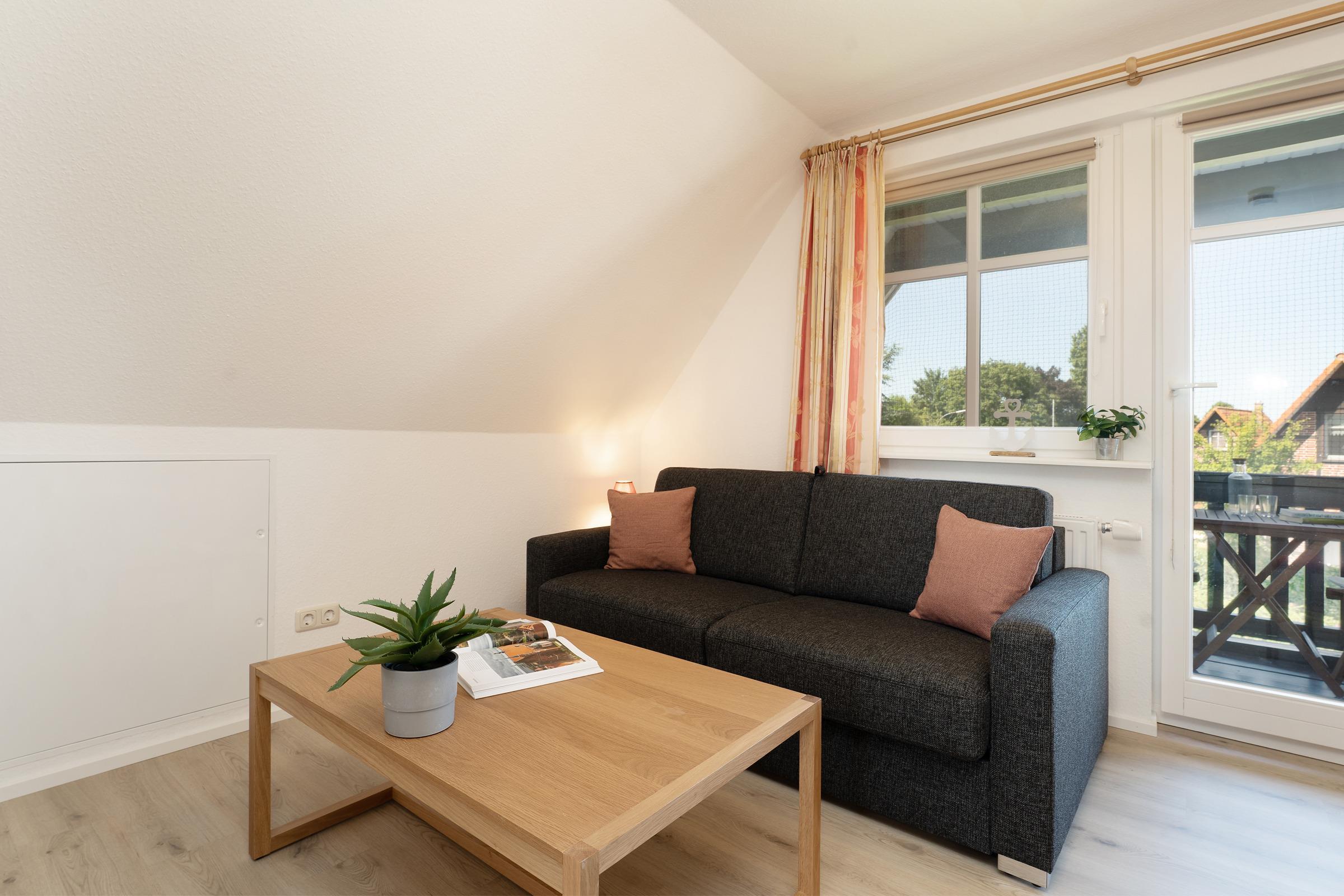 Schlafzimmer 3 (OG): 1 Schlafsofa (ca. 140x200 cm), Kleiderschrank, TV, Verdunkelung: Rollo, Platz für ein Babybett vorhanden