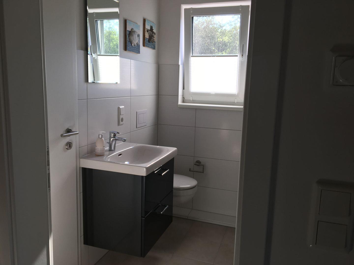 Zwei Badezimmer – beide mit Dusche und jeweils mit Waschbecken, Spiegel und Fenster ausgestattet und ein sep. Gäste-WC im Erdgeschoß – bieten ausreichend Komfort für alle Gäste. Der offene Wohn-Essbereich verfügt über eine gemütliche Sofaecke ( 1 Schlafsofa (150x200cm), TV, Sichtschutz-Plissees) , sowie einen Kaminofen, der an kühlen Tagen für behagliche Wärme sorgt. Die ländlich-moderne Atmosphäre wird durch stilvolle Ausstattungsdetails, wie Kommode, Ganzkörperspiegel sowie durchdachte Raumaufteilung abgerundet.