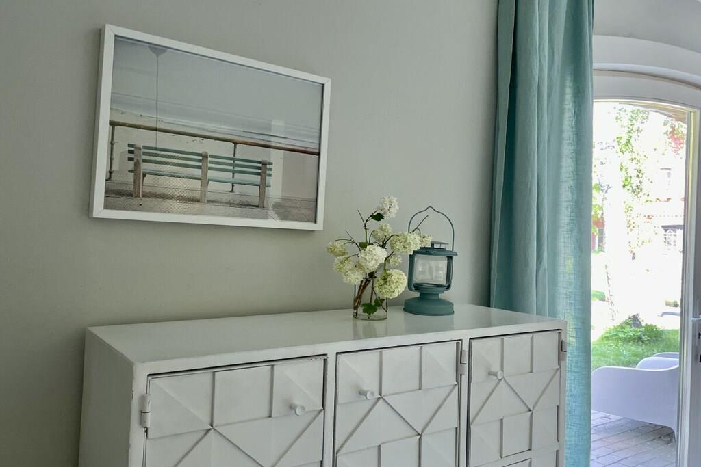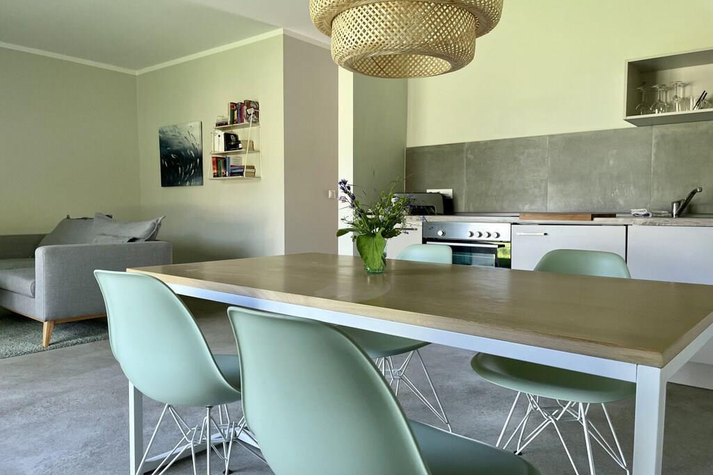 Unsere fünf bezaubernden Ferienwohnungen auf Hof Himmelgrün sind liebevoll und modern eingerichtet und sind ein idealer Rückzugsort, um einen entspannten Urlaub zu geniessen. Die Ferienwohnung VIER besticht durch einen großzügig geschnittenen Wohn- und Essbereich, der ausreichend Platz zum Essen, Verweilen und Spielen bietet. Die Einbauküche ist komplett ausgestattet - frische Kräuter können im Garten geerntet werden. Der (Eltern-) Schlafbereich liegt im hinteren Bereich der Ferienwohnung. Von hier aus bietet sich ein weiter Blick auf Feld und Wald. Man gelangt durch eine Tür direkt in den Garten. Dort befinden sich Gartenmöbel und Sonnenschirm - ein idyllischer Platz um entspannt zu frühstücken oder den Tag bei einem Glas Wein ausklingen zu lassen. Ein weiteres Doppelbett (140cm) befindest sich in einem separaten Schlafzimmer. Das Bad ist mit einer ebenerdigen großen Dusche sowie WC und Waschtisch ausgestattet. Bettwäsche und Handtücher gehören zur Ausstattung unserer Ferienwohnungen. Unseren Gästen steht ein großzügiger Garten mit Grillmöglichkeiten und Feuerstelle zur Verfügung. Familien mit Kindern sind herzlich willkommen. Die große Wiese bietet einen Sandkasten, Tischtennisplatte, Trampolin und viel Platz für Ballspiele. In der Nachbarschaft befindet sich ein Bio-Hofladen sowie eine Töpferei. Der Saaler Bodden ist ein Paradies für Wassersportler und bietet hervorragende Bedingungen zum Surfen und Kiten.