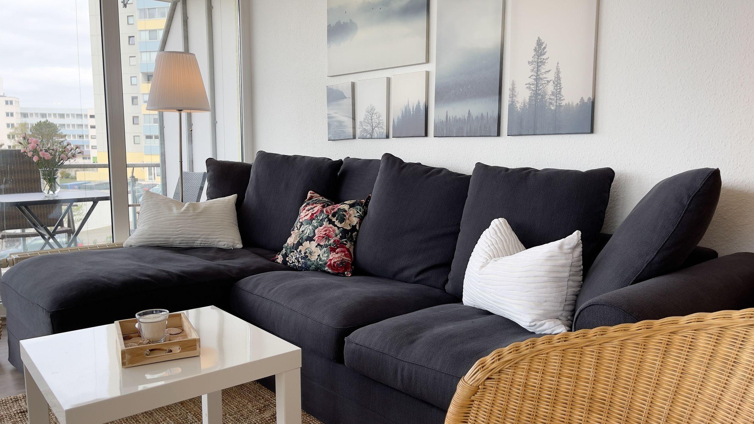 Die Ferienwohnung D1.5 im Haus Nordseebrandung bietet auf 84 m² ausreichend Platz für bis zu 6 Personen. Sie verfügt über zwei separate Schlafzimmer sowie ein Schlafsofa im Wohnbereich, ideal für Familien oder Gruppen. Die offene Küche ist modern ausgestattet mit Herd, Ceranfeld, Backofen, Spülmaschine und Kühlschrank mit Gefrierfach. Der Wohnbereich lädt mit einer gemütlichen Sofaecke zum Entspannen und Genießen des Meerblicks ein.