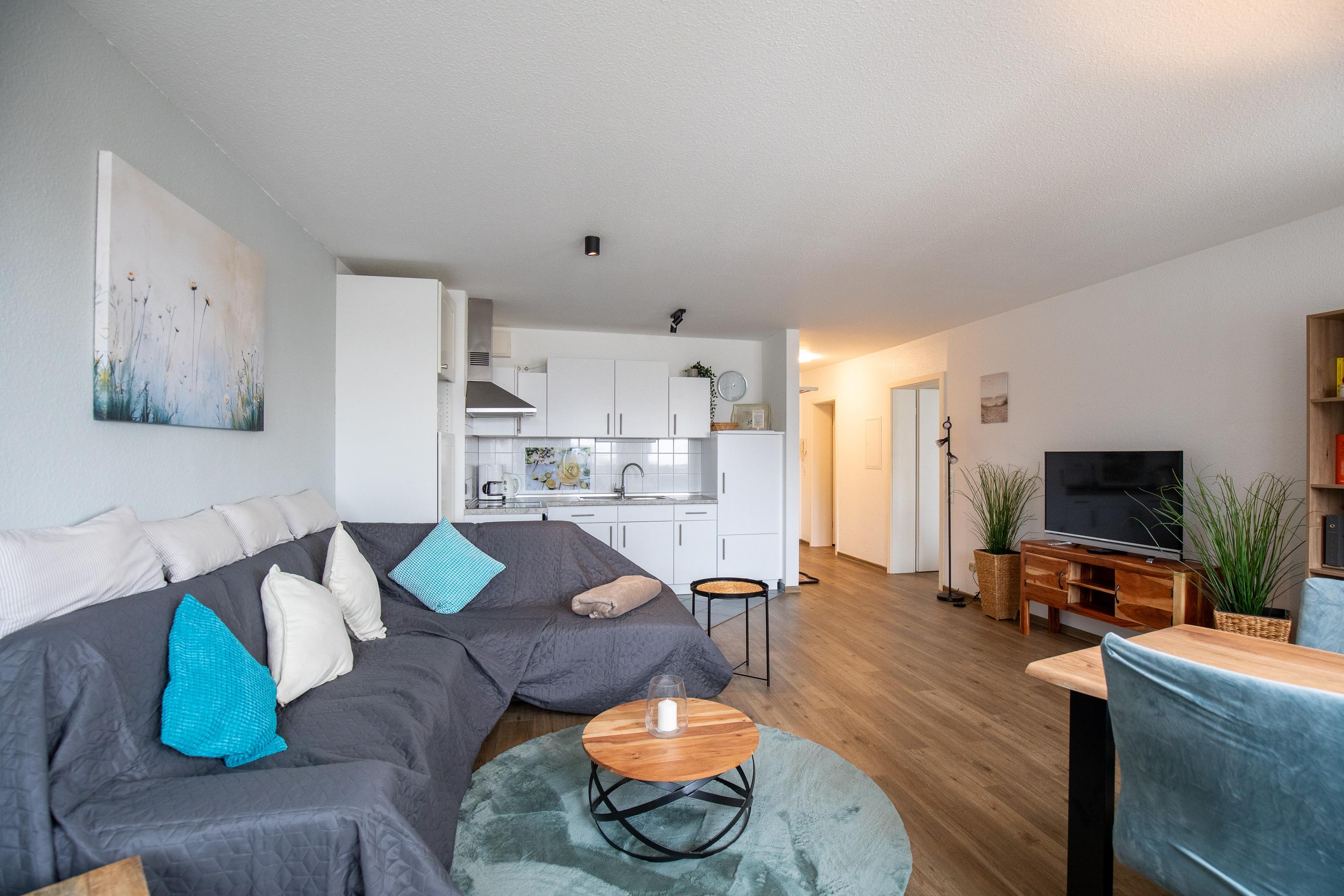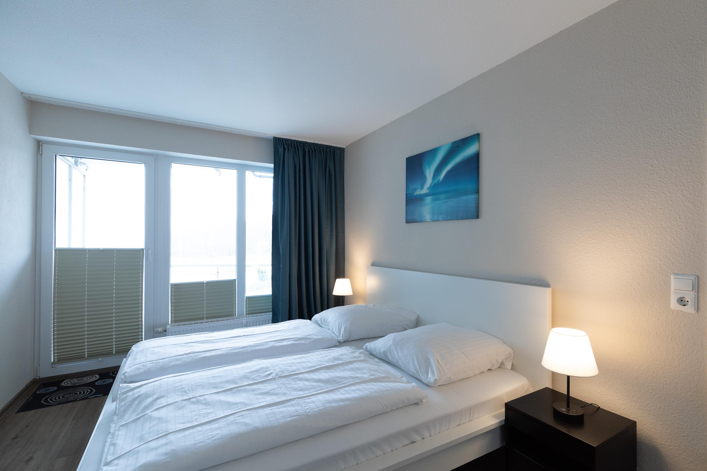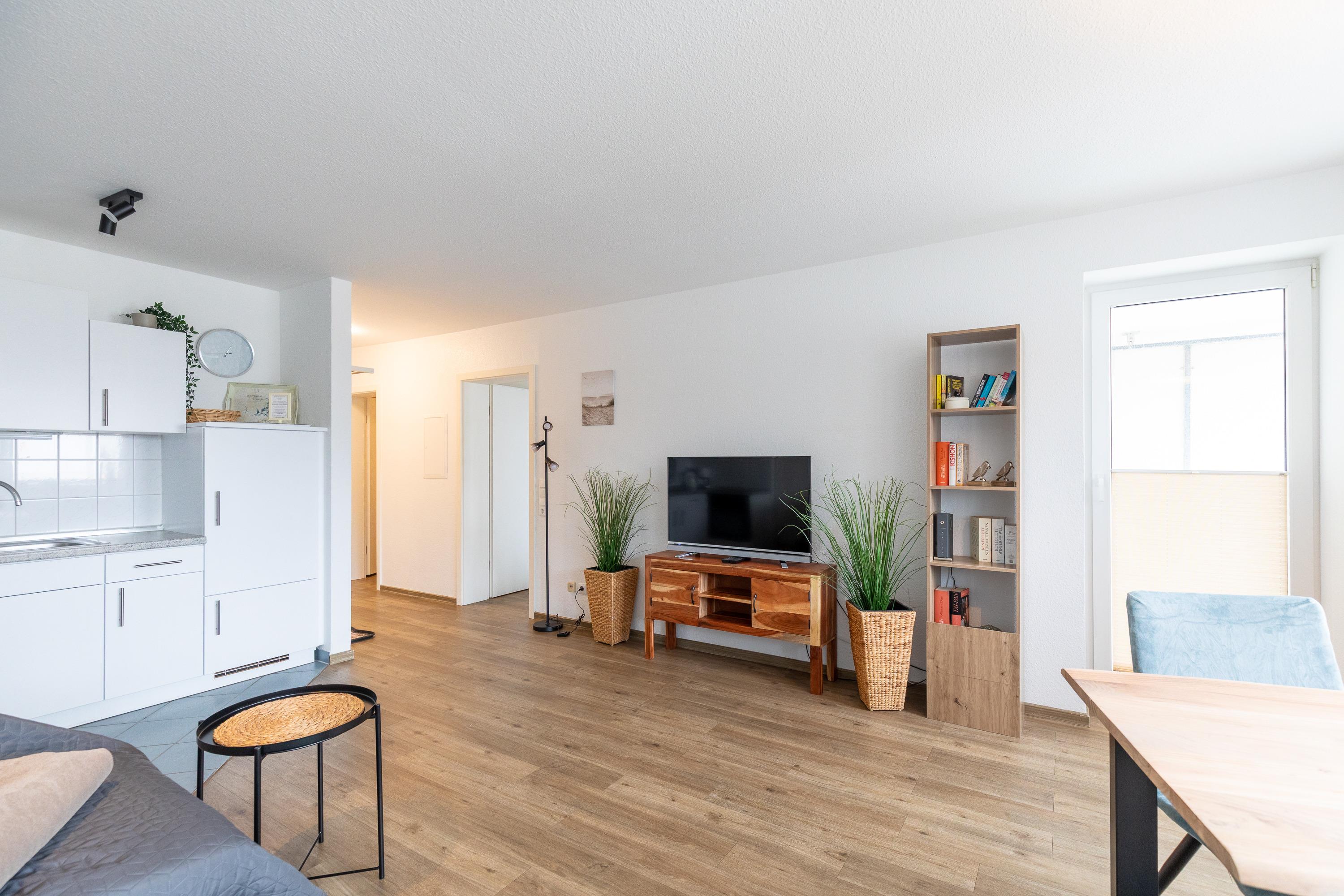 3 Zimmer Wohnung im 1. Obergeschoss für bis zu 3 Personen, 1 Schlafzimmer mit Doppelbett und Kleiderschrank und Zugang zum Balkon, 1 innenliegendes Schlafzimmer mit Einzelbett, Wohnzimmer mit Einbauküche (Backofen, Cerankochfeld, Mikrowelle, Kaffeemaschine, Wasserkocher, Toaster), gemütlicher Sitzecke mit Ecksofa, Essplatz, TV und Zugang zum Balkon, Bad mit Waschbecken, Badewannendusche, WC, Fahrstuhl im Haus, reservierter PKW Stellplatz, Nichtraucherwohnung.