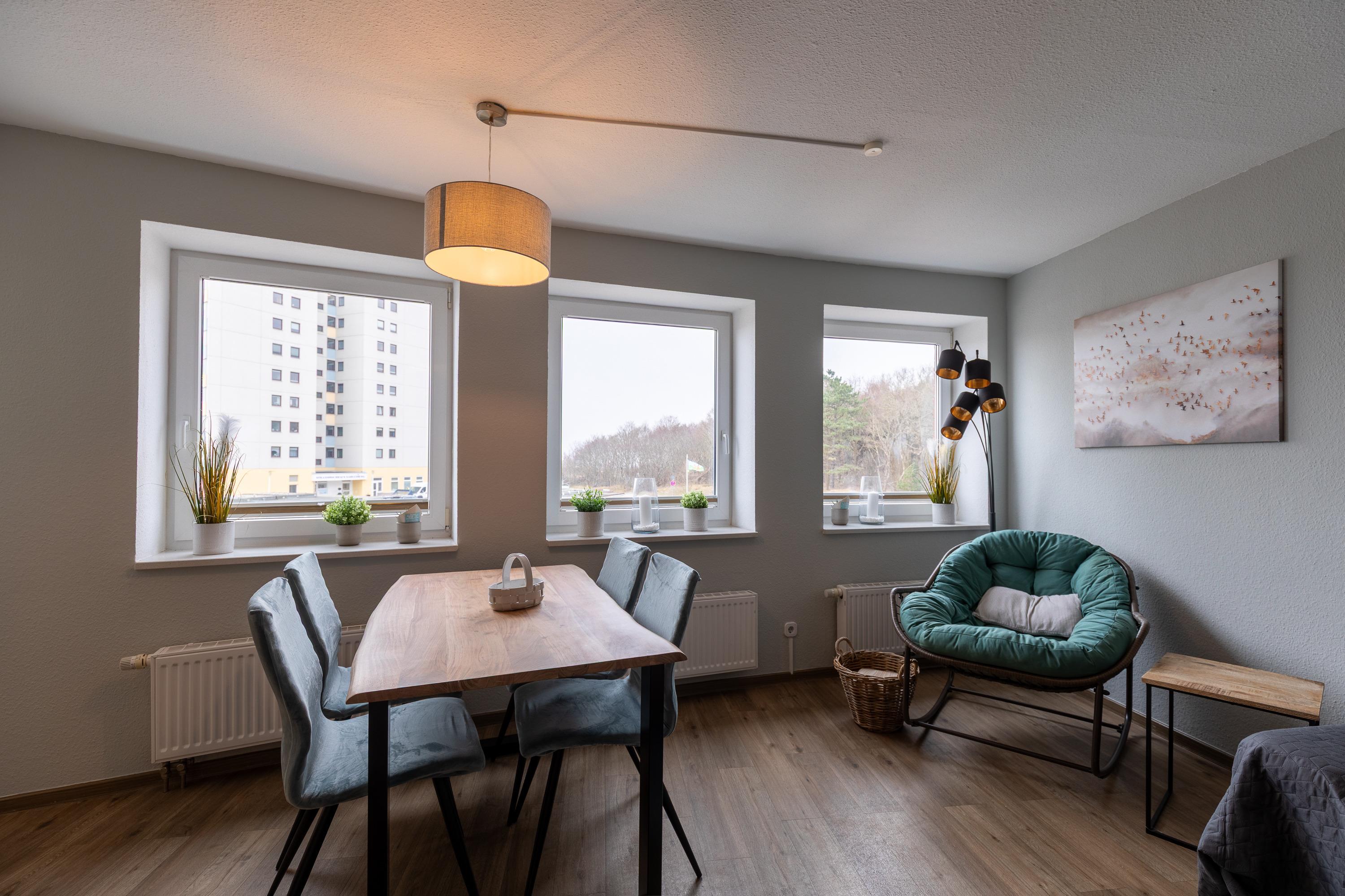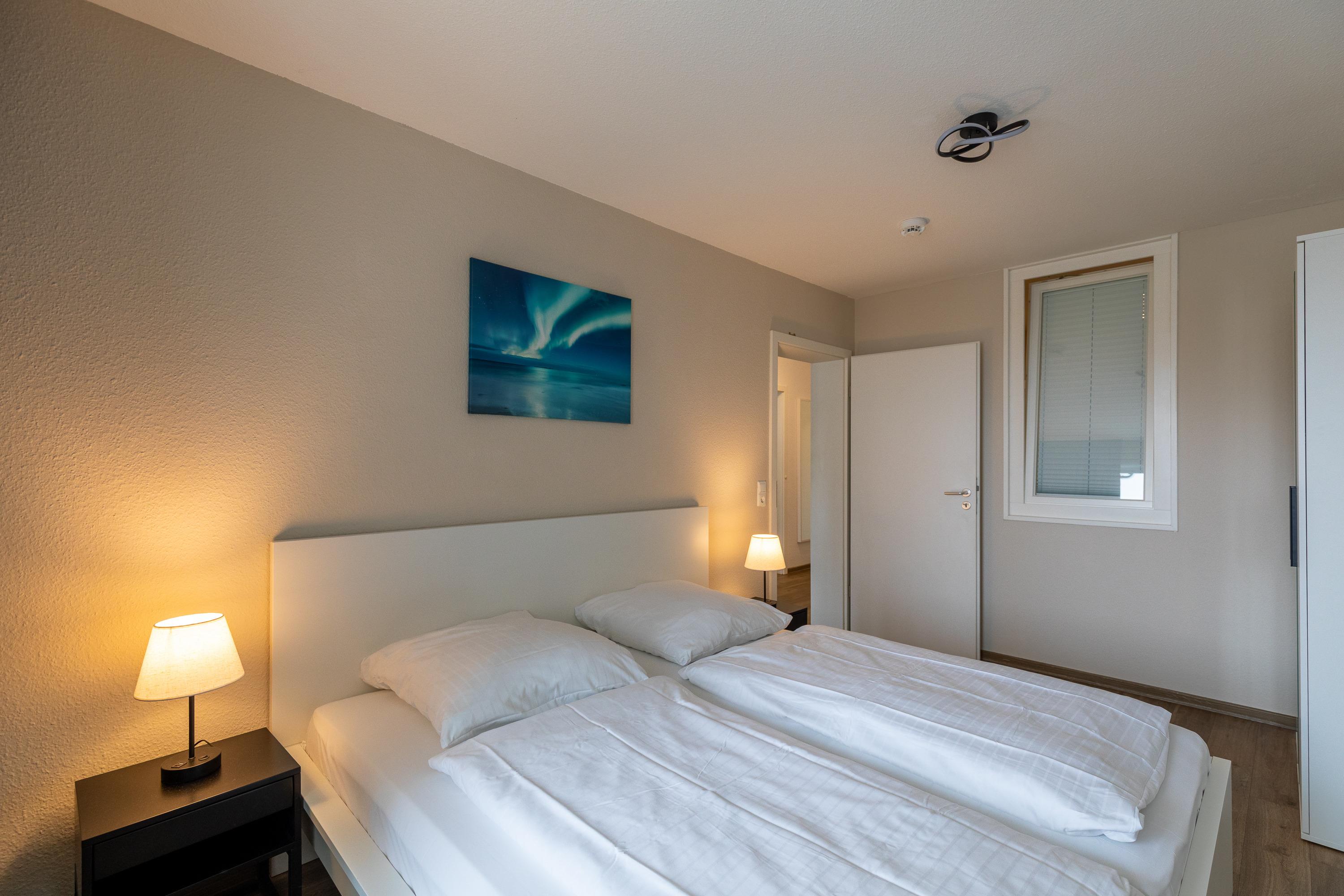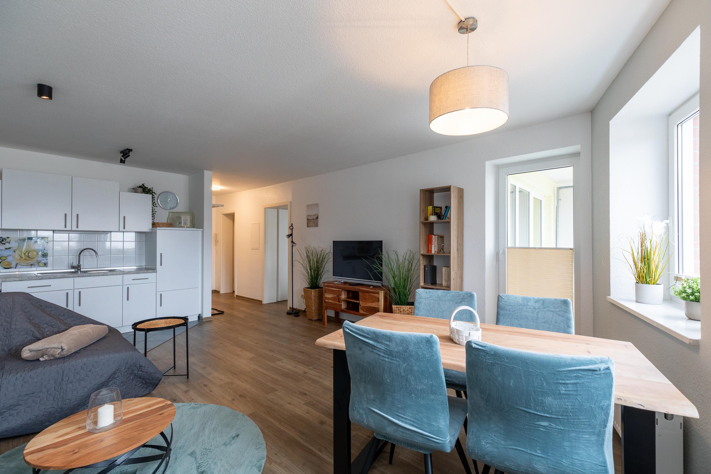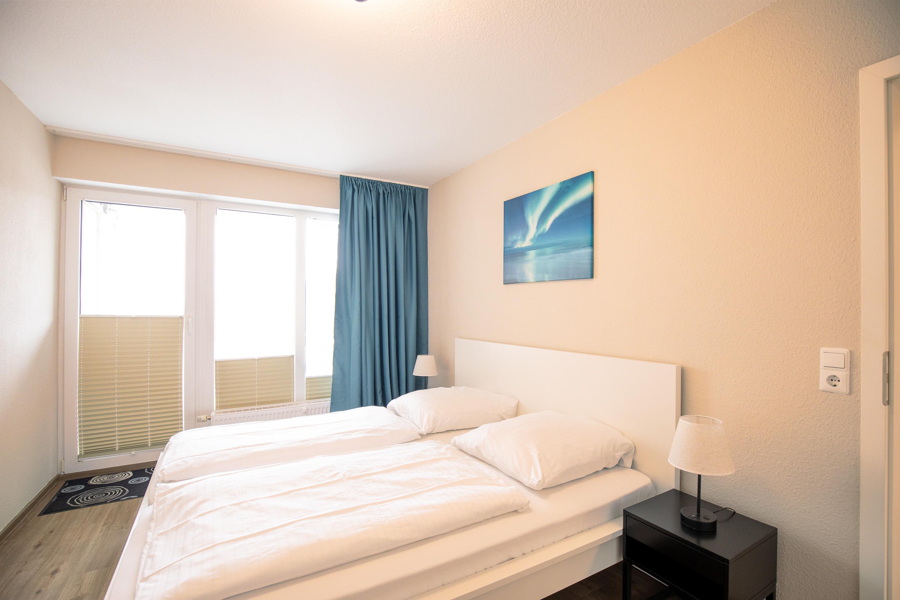 3 Zimmer Wohnung im 1. Obergeschoss für bis zu 3 Personen, 1 Schlafzimmer mit Doppelbett und Kleiderschrank und Zugang zum Balkon, 1 innenliegendes Schlafzimmer mit Einzelbett, Wohnzimmer mit Einbauküche (Backofen, Cerankochfeld, Mikrowelle, Kaffeemaschine, Wasserkocher, Toaster), gemütlicher Sitzecke mit Ecksofa, Essplatz, TV und Zugang zum Balkon, Bad mit Waschbecken, Badewannendusche, WC, Fahrstuhl im Haus, reservierter PKW Stellplatz, Nichtraucherwohnung.
