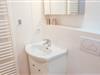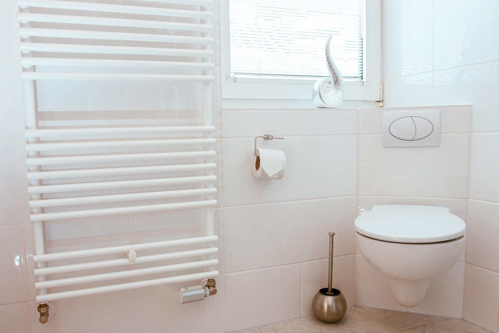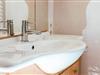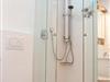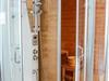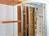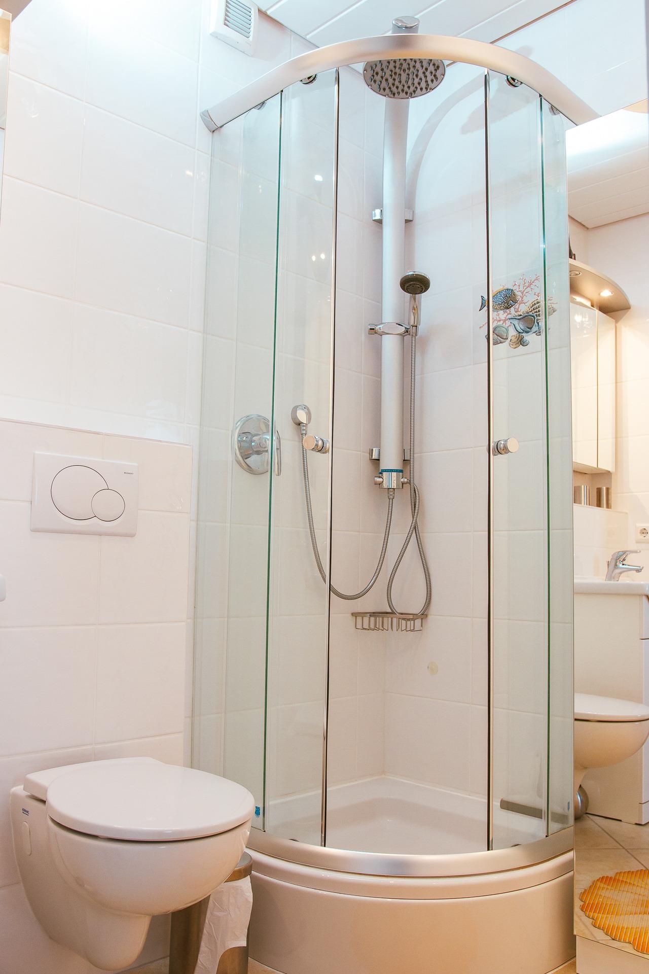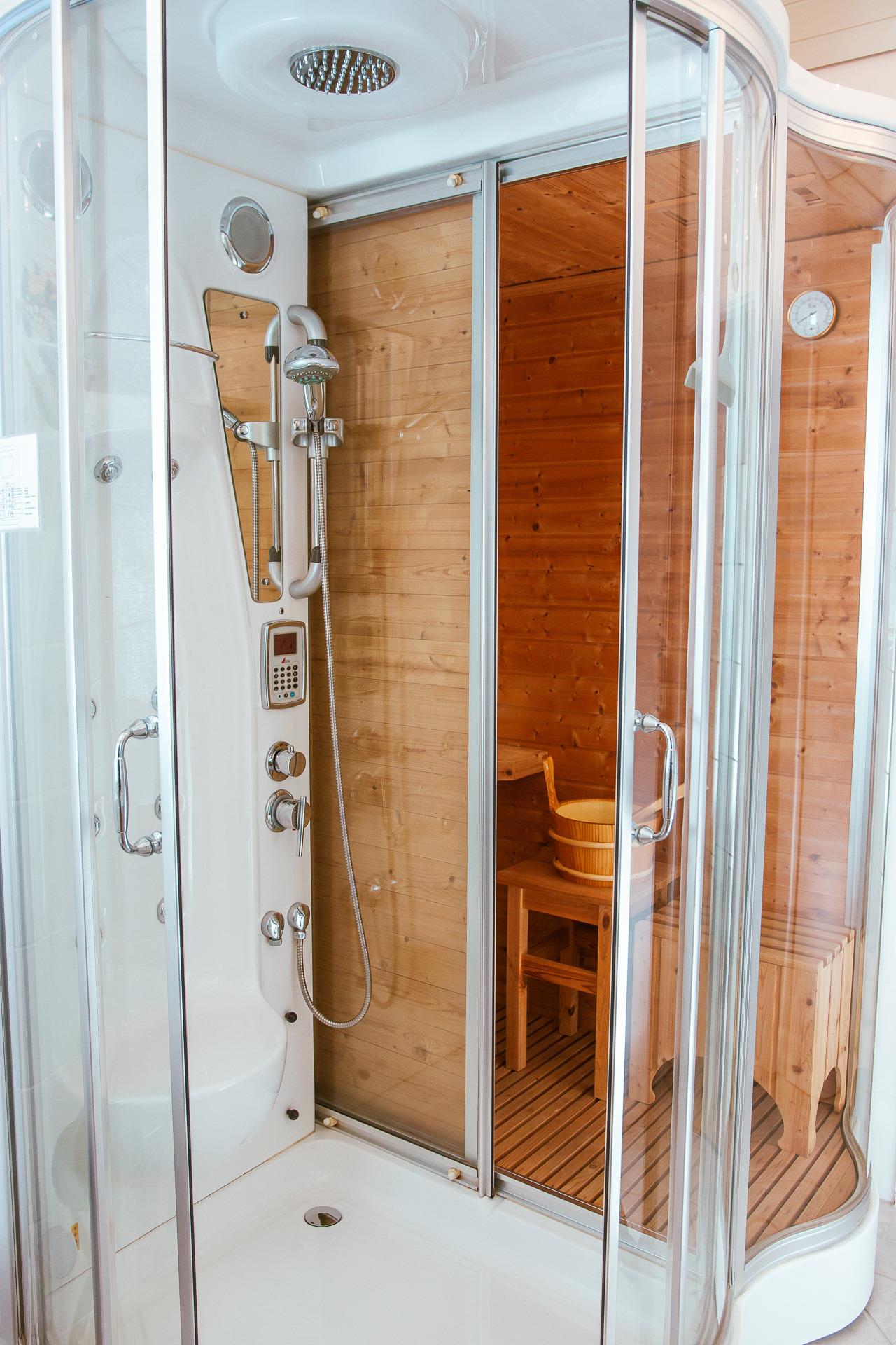 Die zwei Badezimmer verfügen jeweils über eine Dusche, ein WC sowie ein Waschbecken mit Spiegel. Das Badezimmer 2 hat eine Erlebnisdusche mit Dampfsauna und eine kleine finnische Sauna für eine Person.