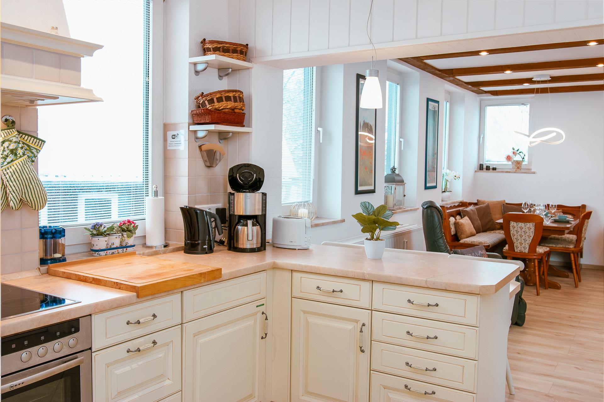 Das Herz der Wohnung ist der Wohn-/Essbereich mit angrenzender offener Küche ist das Herz. Hier können Sie auf der Couch, in einem der Sessel oder am Esstisch gemeinsam Ihre Abende verbringen. Für die abendliche Unterhaltung ein Smart-TV zur Verfügung.