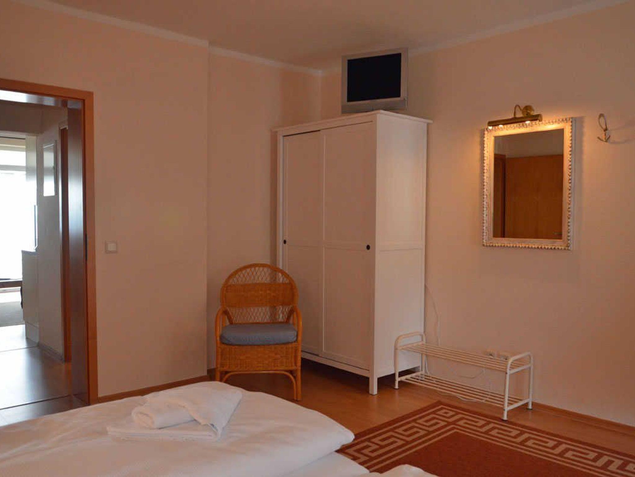 • Das Schlafzimmer ist mit einem bezogenen Doppelbett ausgestattet und verfügt über ausreichend Stauraum für Ihr Gepäck/Garderobe.