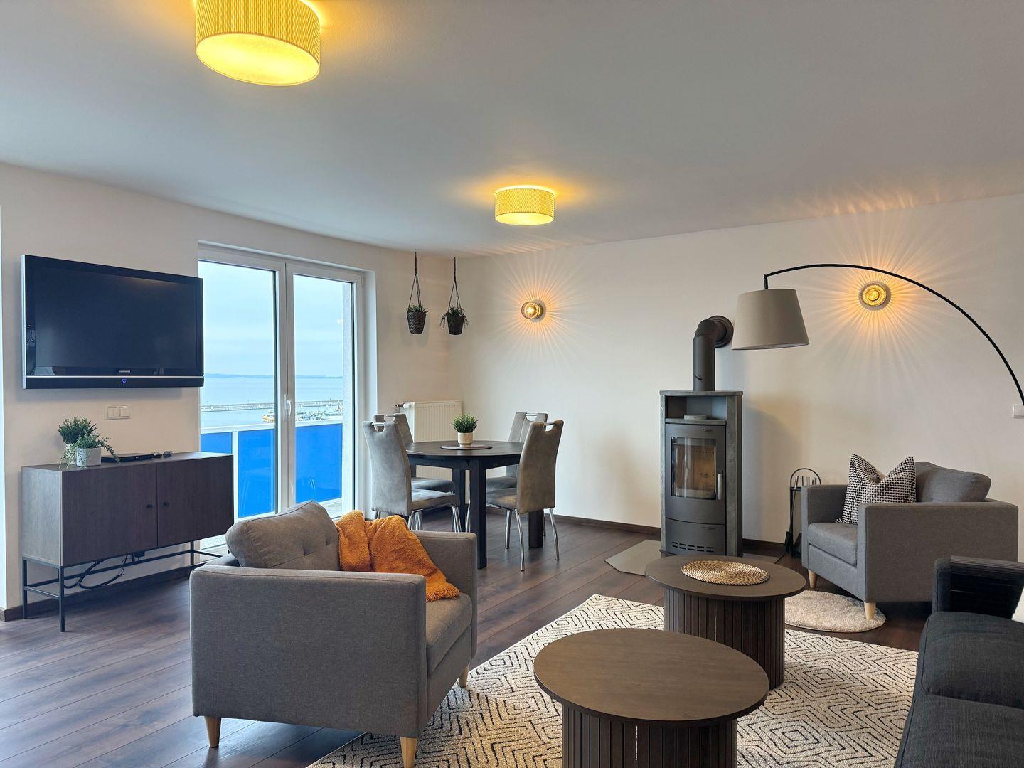 Das Herzstück der Wohnung ist der geräumige Wohnbereich, der einen offenen Zugang zur voll ausgestatteten Küche bietet. Hier finden Sie alles, was Sie für die Zubereitung köstlicher Mahlzeiten benötigen – vom Cerankochfeld über einen Backofen bis hin zur Spülmaschine. Der gemütliche Essbereich lädt zu geselligen Runden ein, während die Sofaecke für entspannte Stunden nach einem aufregenden Tag am Strand sorgt. Ein Kaminofen bringt zusätzlich Wärme und Gemütlichkeit in die Räumlichkeiten, ideal für kalte Winterabende.