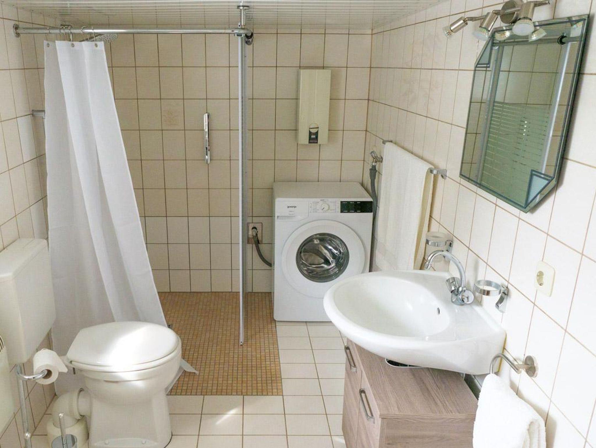 Im Badezimmer befindet sich eine Dusche, eine Toilette, ein Waschbecken, eine Waschmaschine und ein Regal mit Haarföhn, Handtüchern, Toilettenpapier und Seife.
