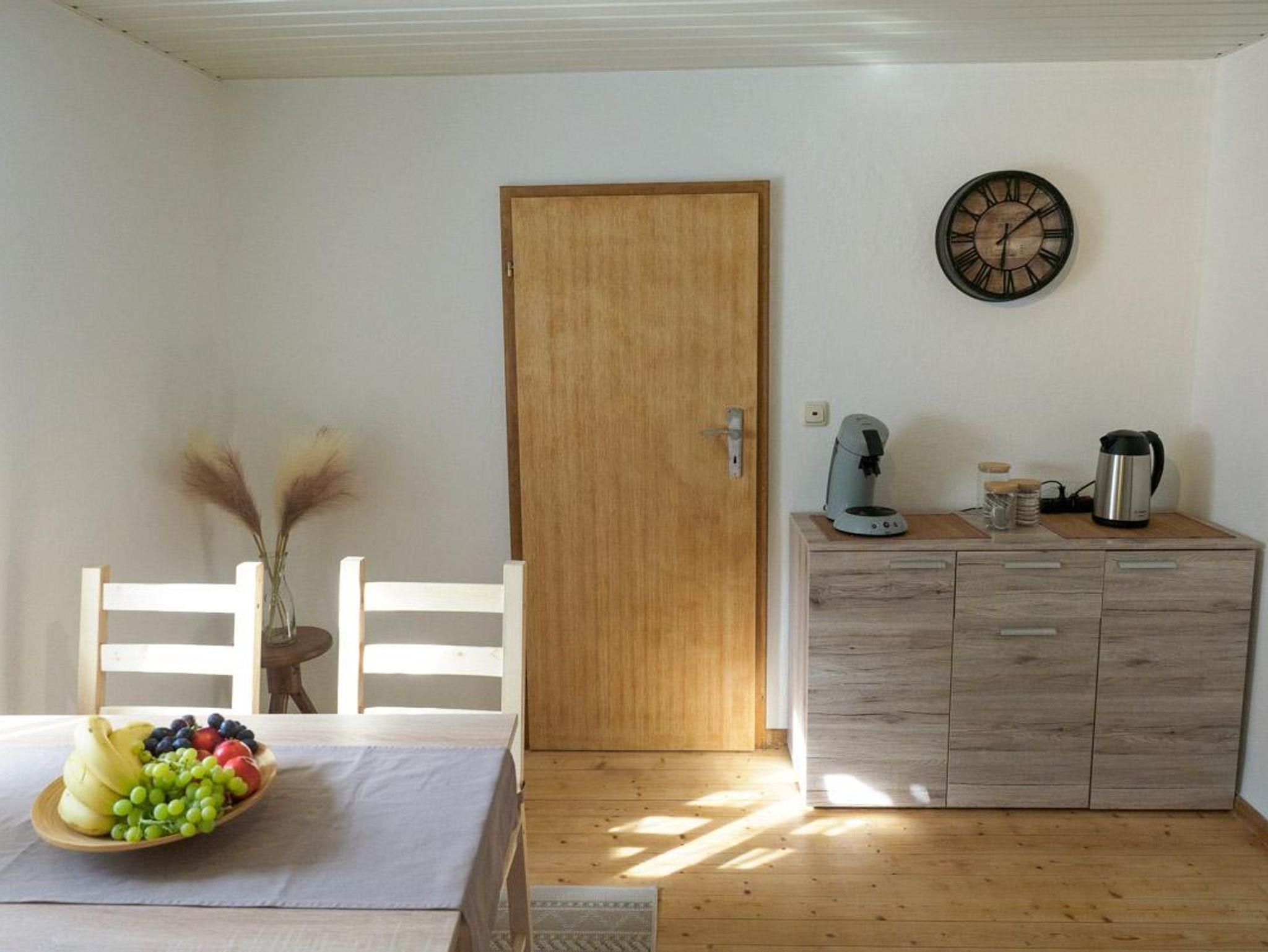 In der Küche befindet sich eine vollausgestattete Küchenzeile (Geschirr, Kühlschrank, Gefrierfach, Mikrowelle, Spülmaschine, Ceranfeld und Backofen), eine Kaffeebar mit einer Filterkaffeemaschine und einer Senseomaschine, einem Toaster und einem Wasserkocher, eine Essecke mit einem Esstisch und vier Stühlen.