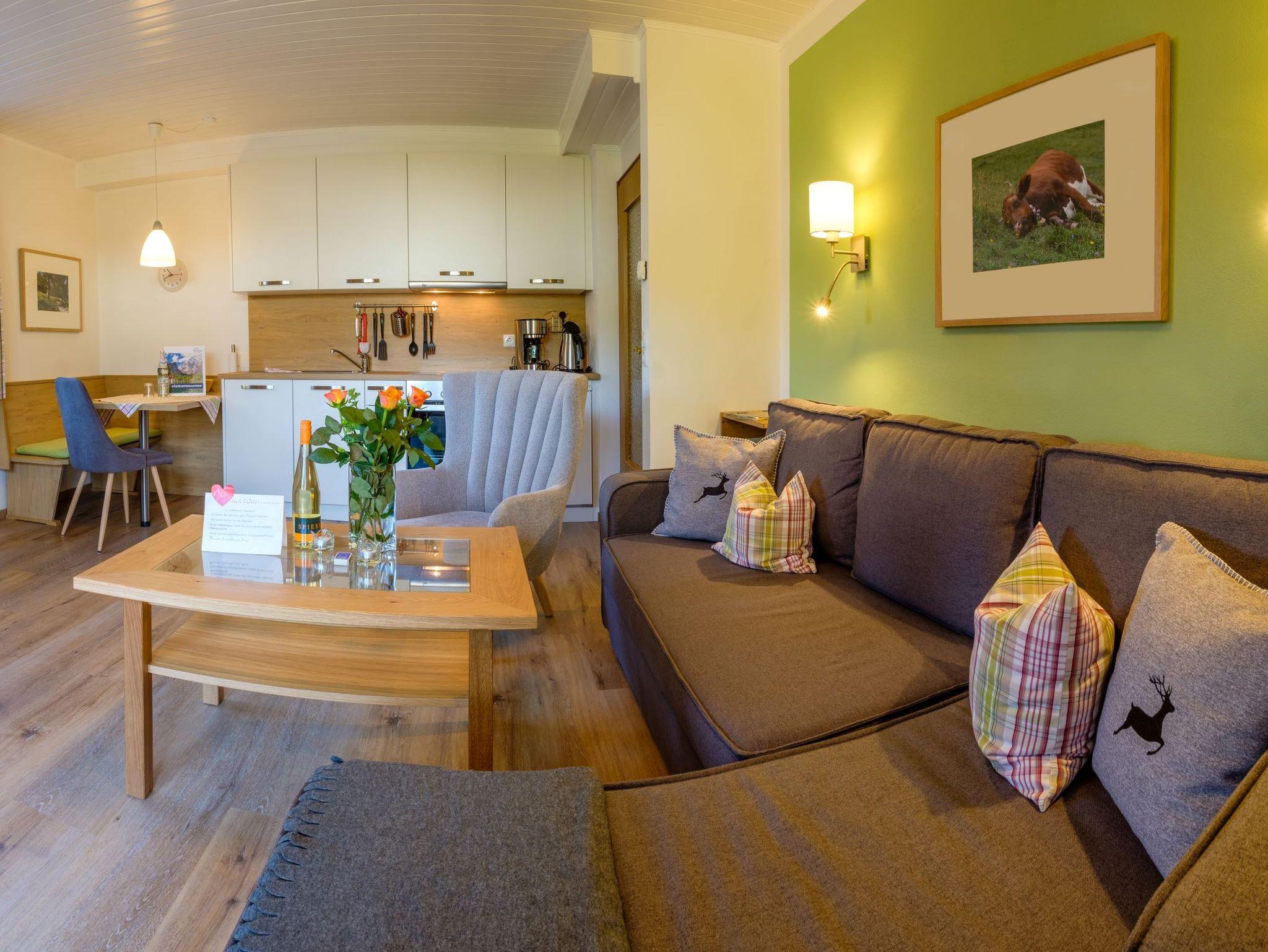 Die neu renovierte Ferienwohnung Nr. 1 Jennerblick ausgestattet mit handgemachten Schreinermöbeln in heller Eiche, bietet auch für Gäste mit Hund eine optimale Rückzugsmöglichkeit. Der großzügige süd-west Eck-Balkon, lädt ein zum sonnigen Frühstück am Morgen oder einem Glas Wein am Abend mit herrlichem Blick auf die Bergkette mit Kehlstein, Hohem Göll, Hohem Brett, Jenner und dem Hagengebirge.