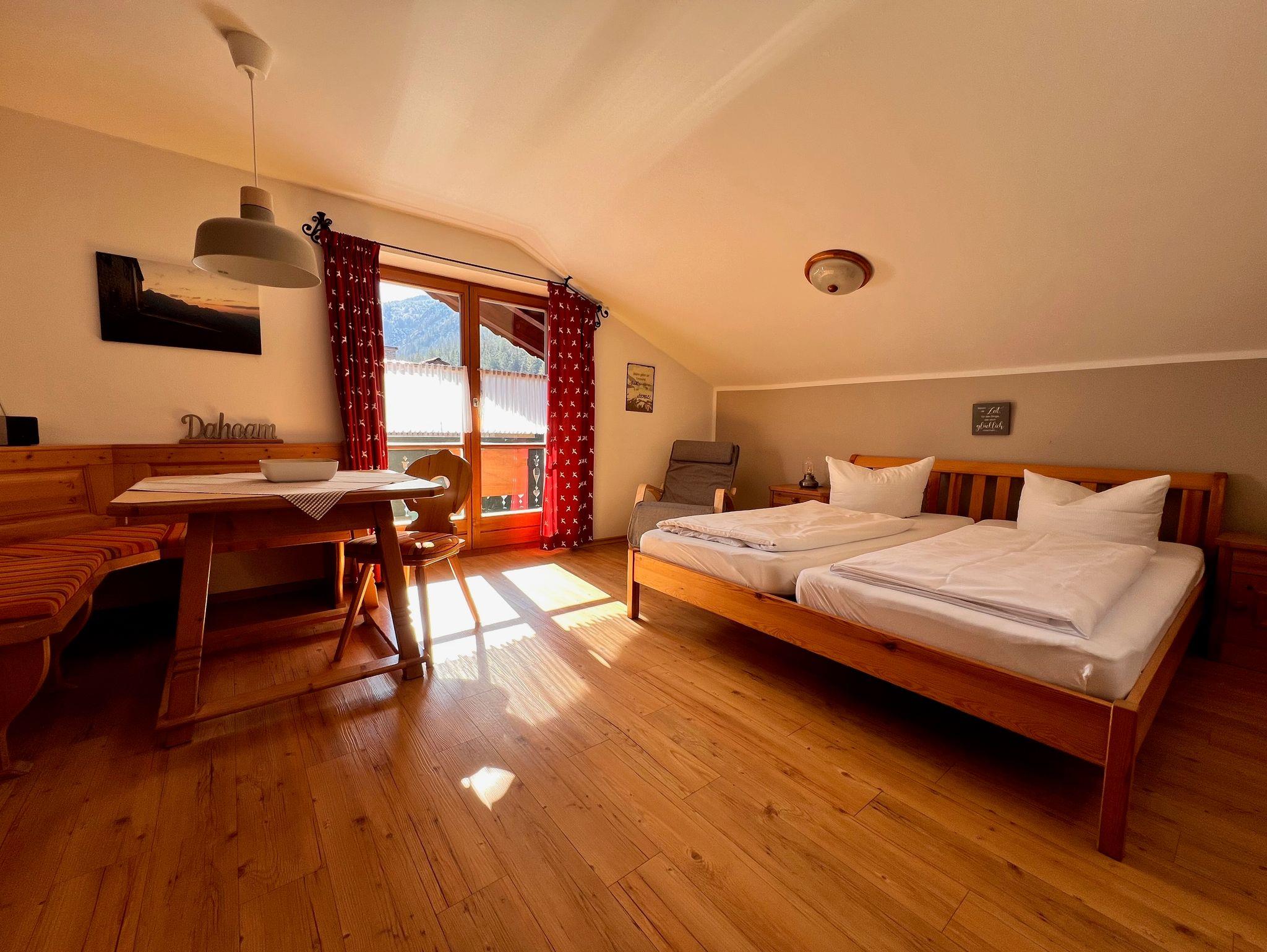 Der kombinierte Wohn- und Schlafraum ist mit einem komfortablen Doppelbett, zwei gemütlichen Sesseln sowie einem Essbereich mit Eckbank ausgestattet und bietet eine angenehme, heimelige Atmosphäre.