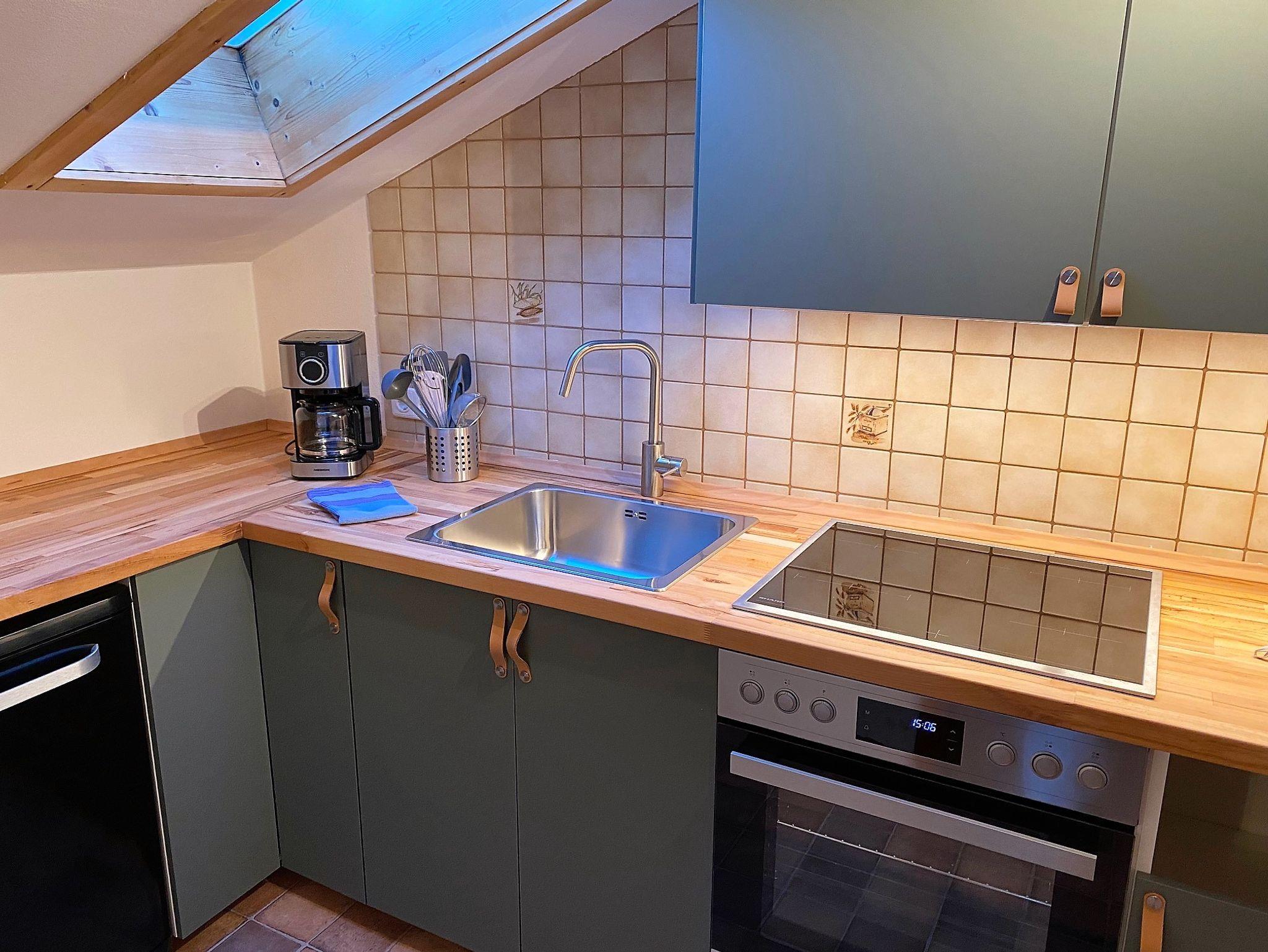 Die kleine Küche ist sehr gut ausgestattet und verfügt unter anderem über Backofen mit Ceranfeld, Geschirrspüler, Kühlschrank mit Gefrierfach, Kaffeemaschine, Toaster und Wasserkocher, ideal für die Selbstversorgung.